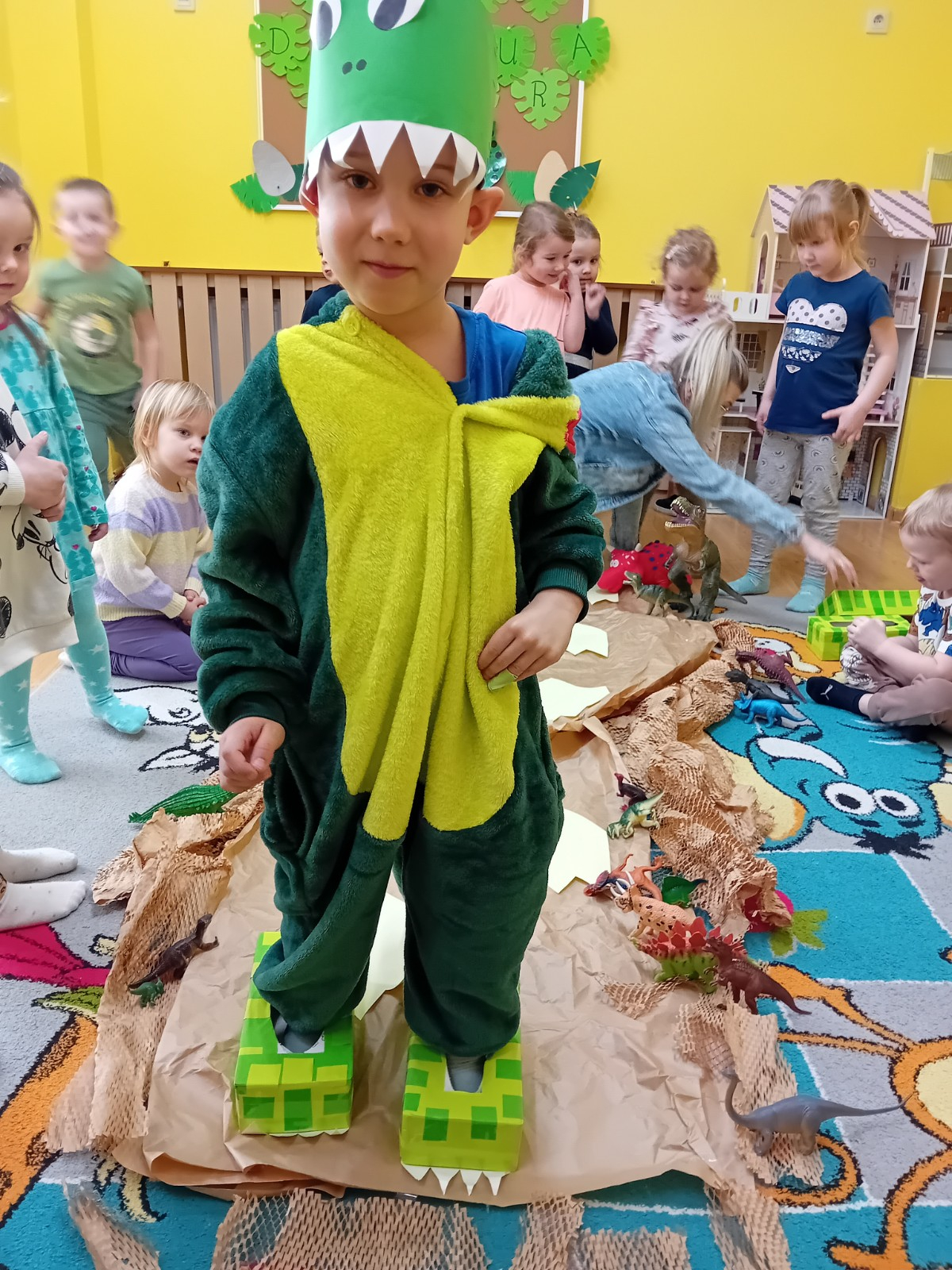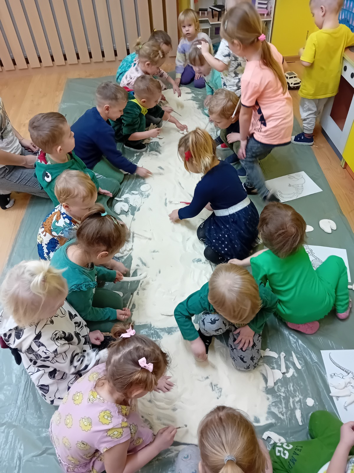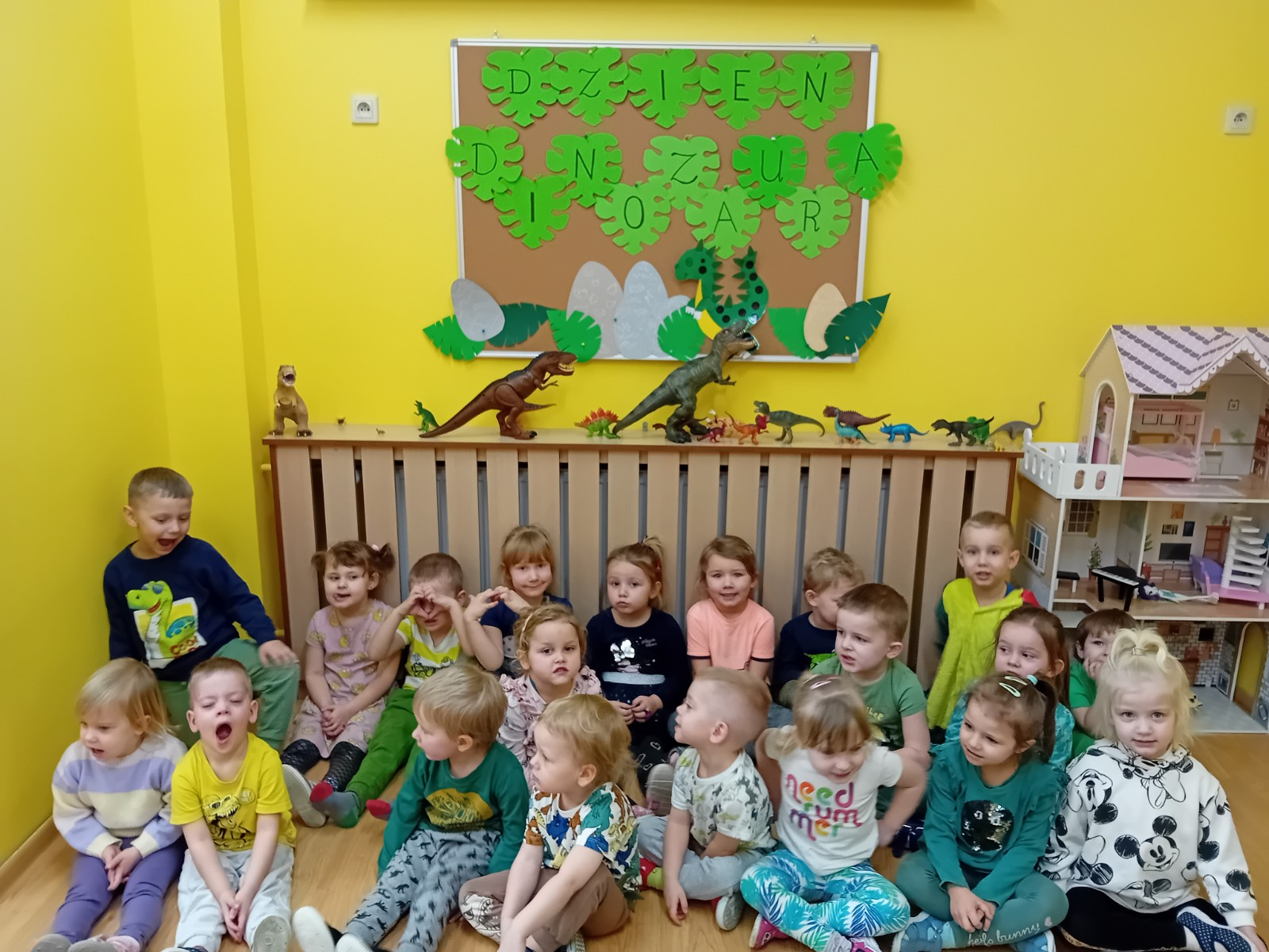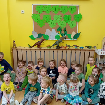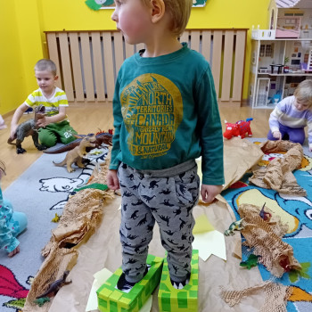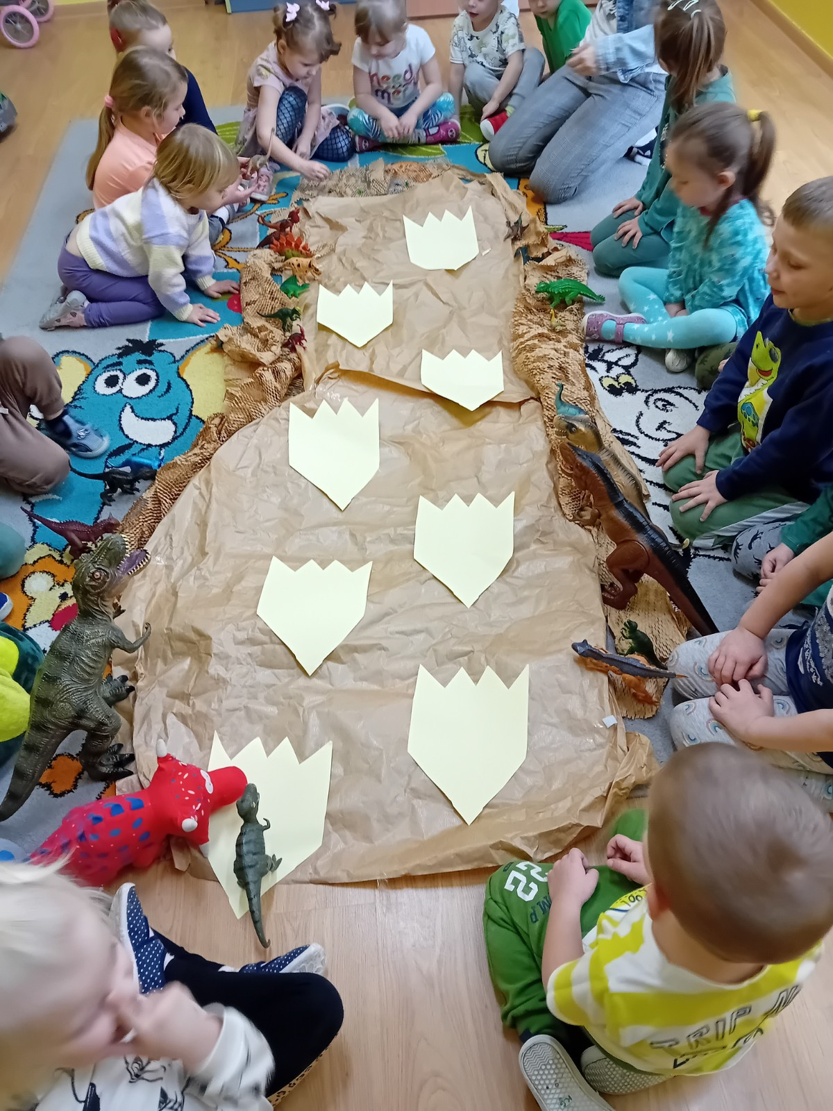 Aktywny Dzień Dinozaura w grupie Krasnale. Miedzy innymi podążaliśmy śladami dinozaurów, poznaliśmy pracę paleontologa na wykopaliskach. Zapoznaliśmy wiele gatunków dinozaurów przyniesionych przez dzieci.