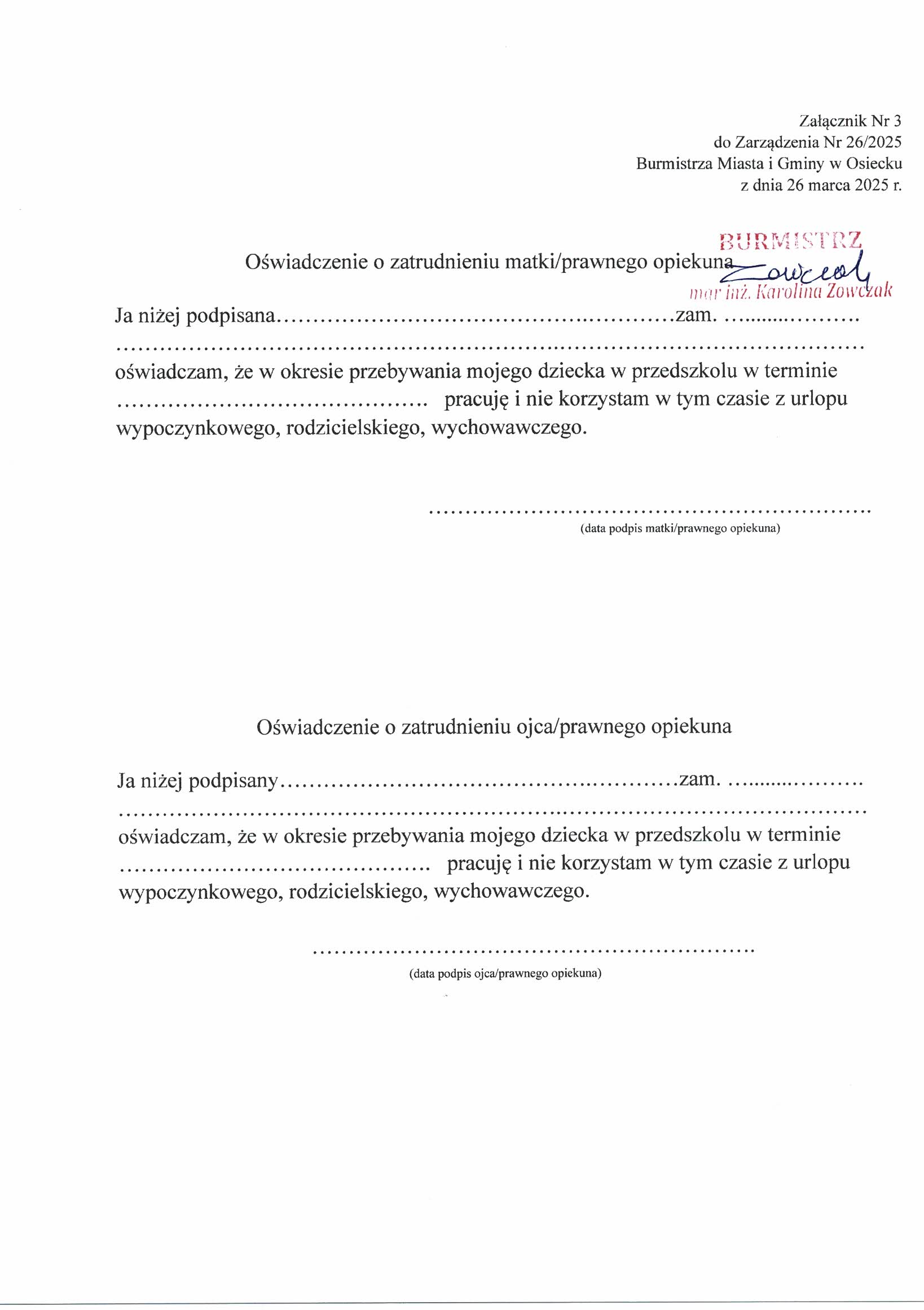 ZARZĄDZENIE NR 26/2025 Burmistrza Miasta i Gminy Osieck z dnia 26 marca 2025 roku w sprawie zasad organizacji dyżuru wakacyjnego przedszkola i oddziałów przedszkolnych przy szkołach podstawowych prowadzonych przez Miasto i Gminę Osieck