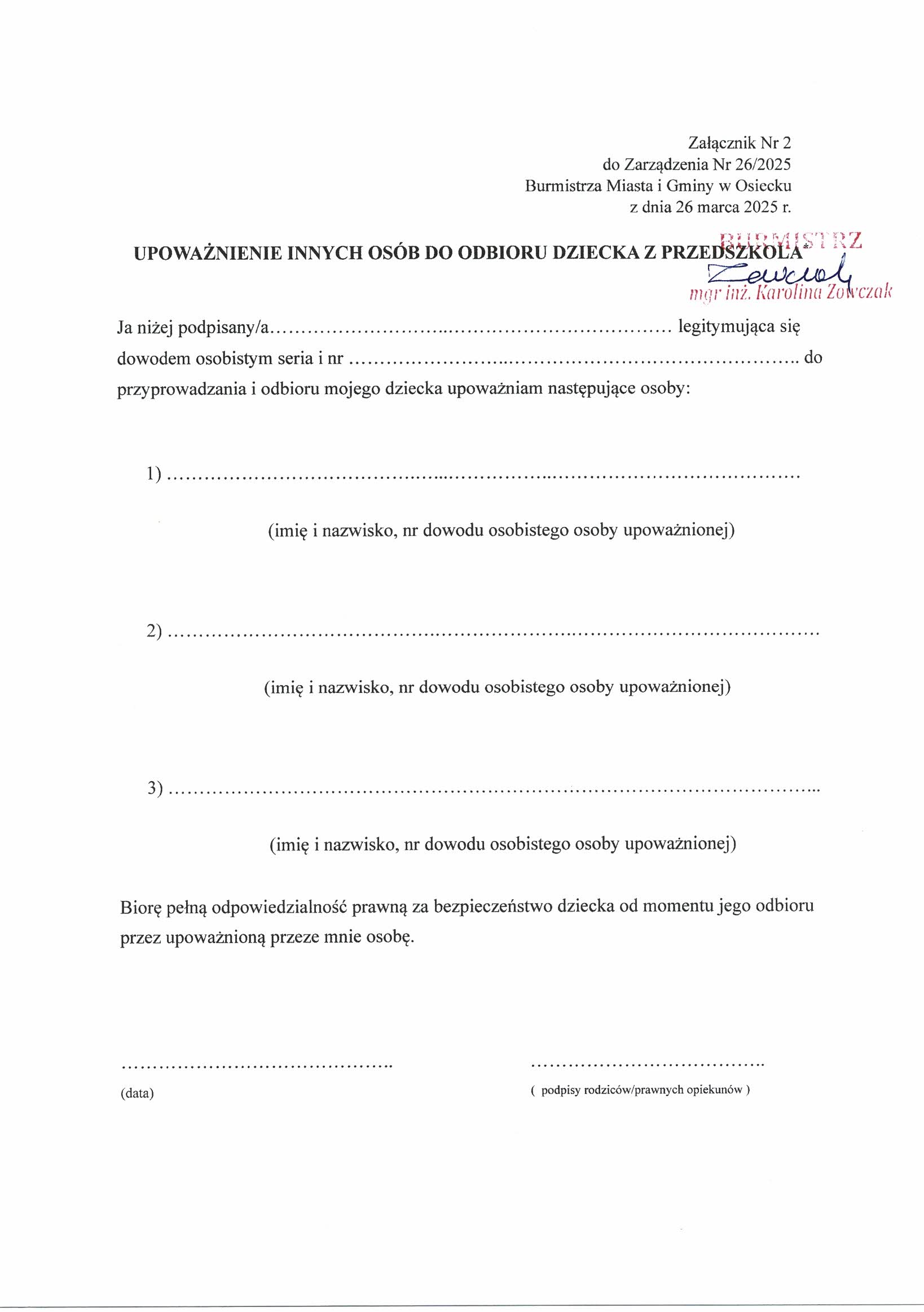 UPOWAŻNIENIE DO ODBIORU DZIECKA Z PRZEDSZKOLA