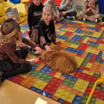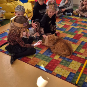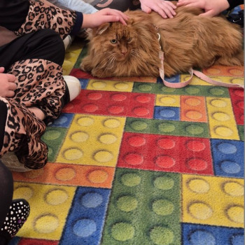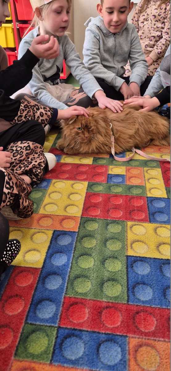 Dzieci spotkały się na żywo z dużym , rudym kotem