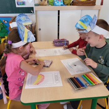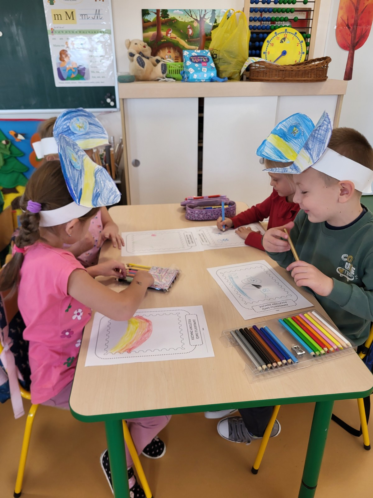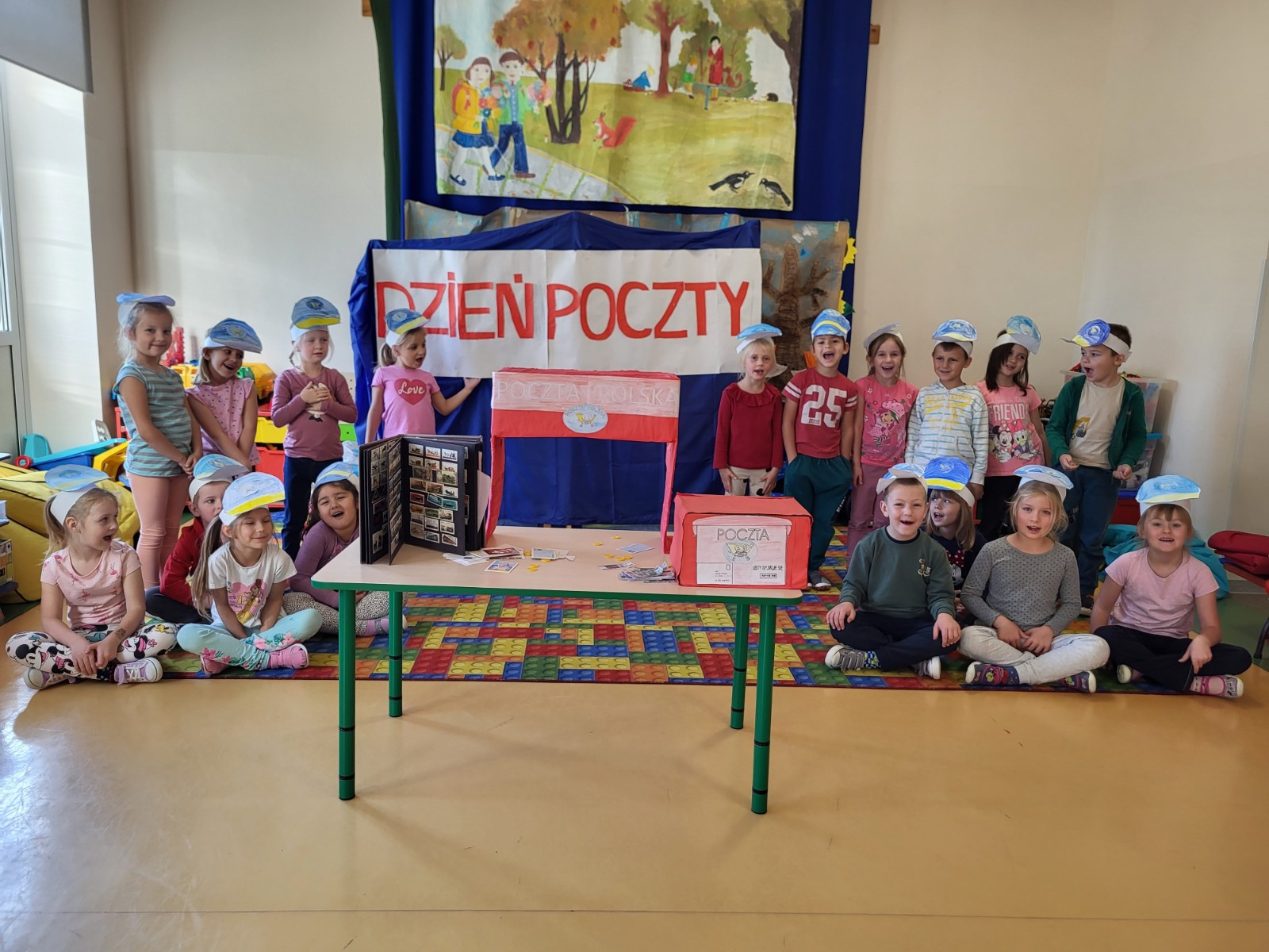 Podczas zajęć utrwaliły pojęcia związane z pocztą. Wykonały papierowe czapki listonosza i projektowały swoje znaczki.