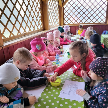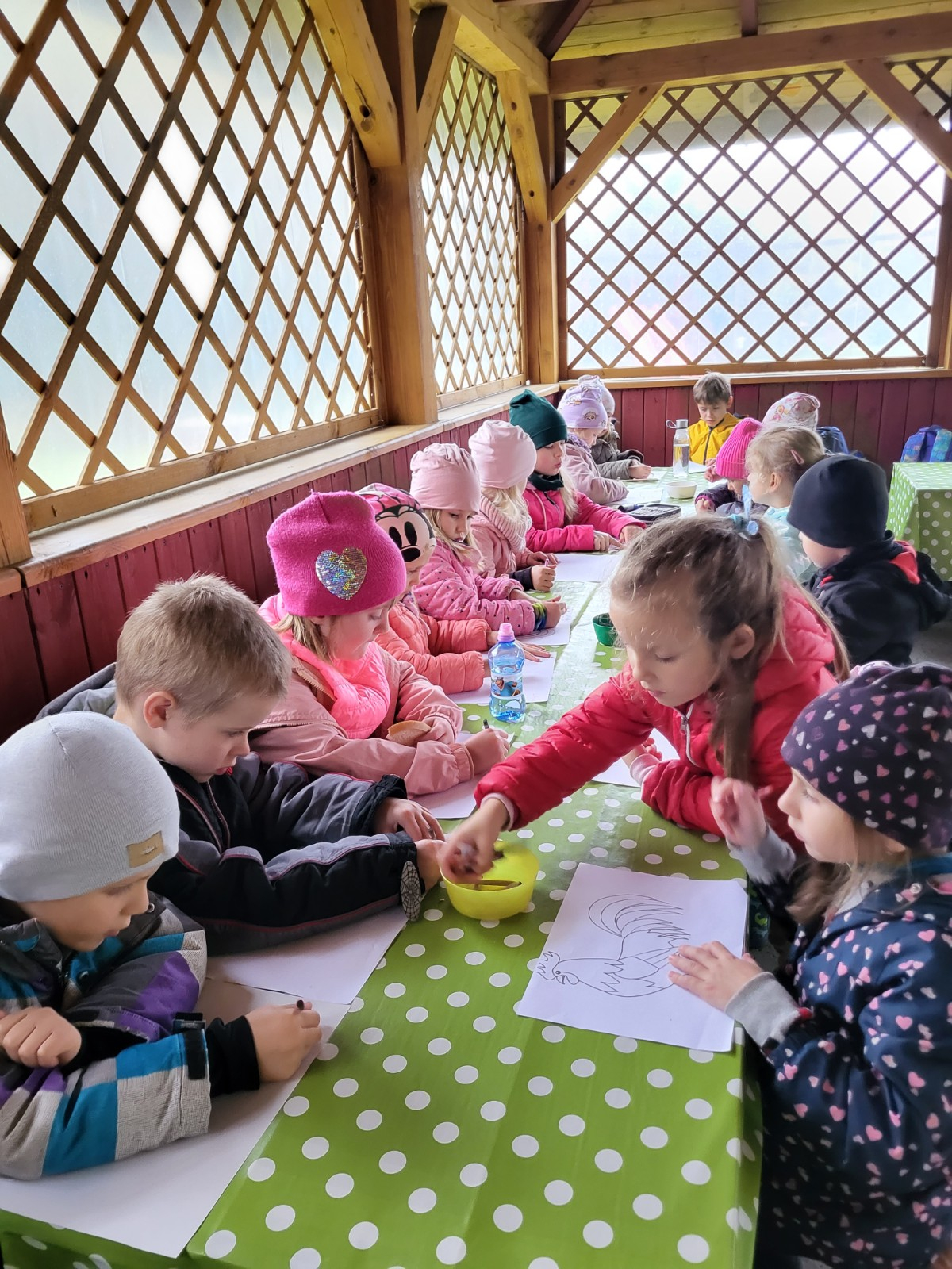Zmęczone intensywnymi zajęciami zasiadły przy stołach , na których podano grillowane kiełbaski. Pobyt został zakończony zajęciami plastycznymi.
