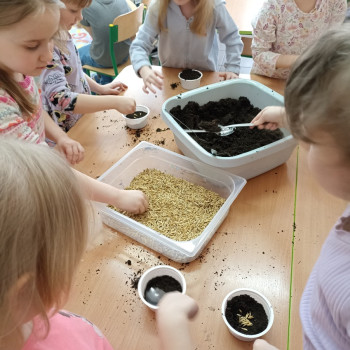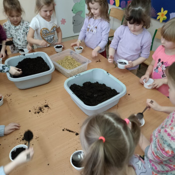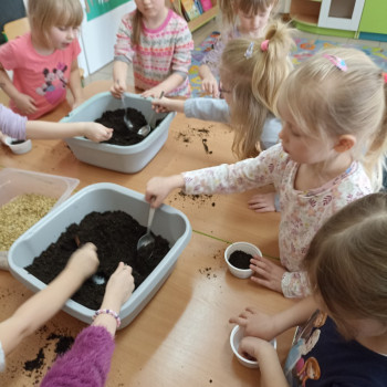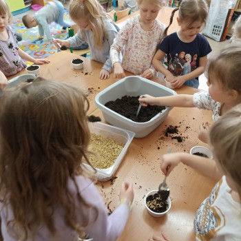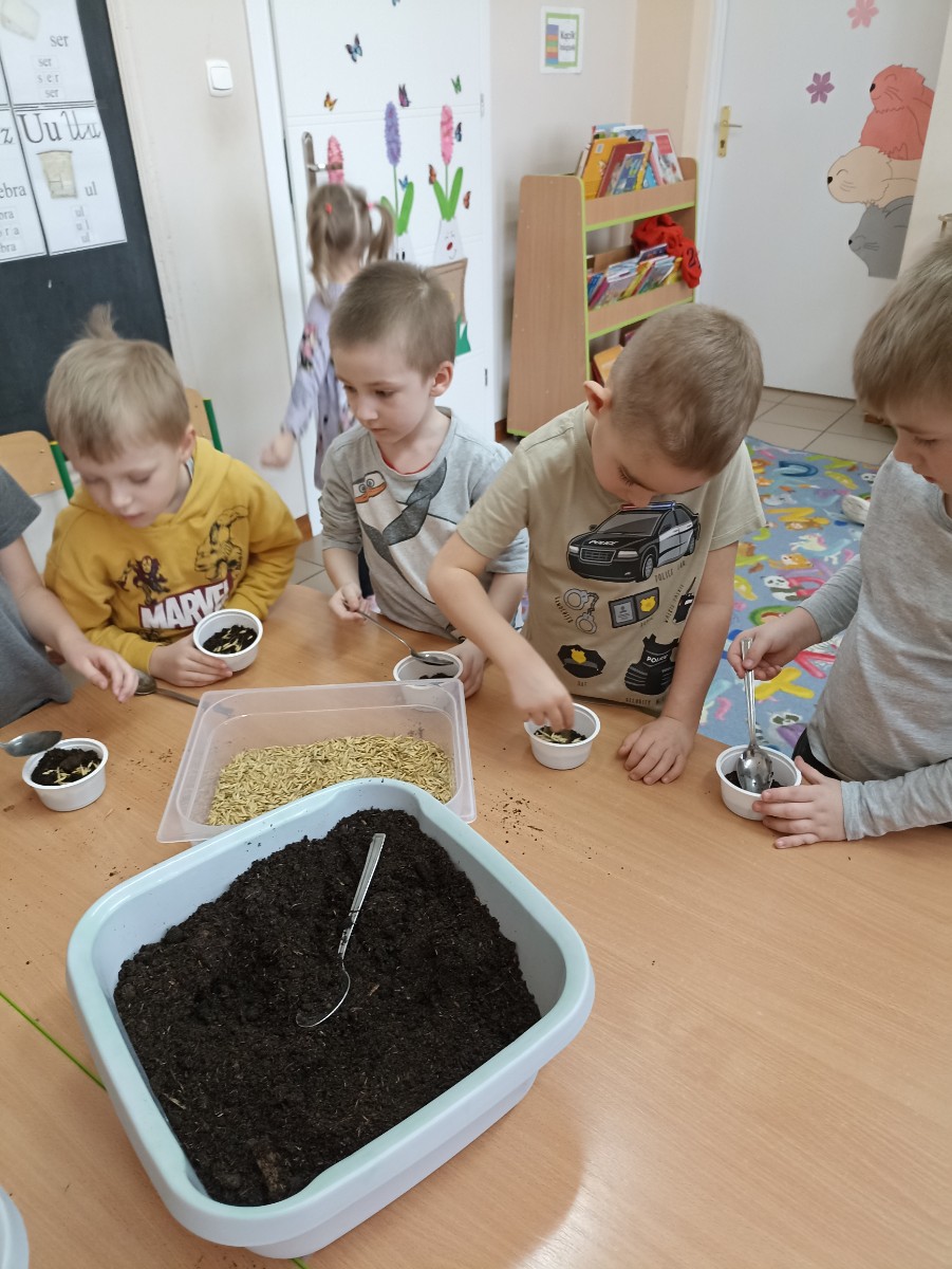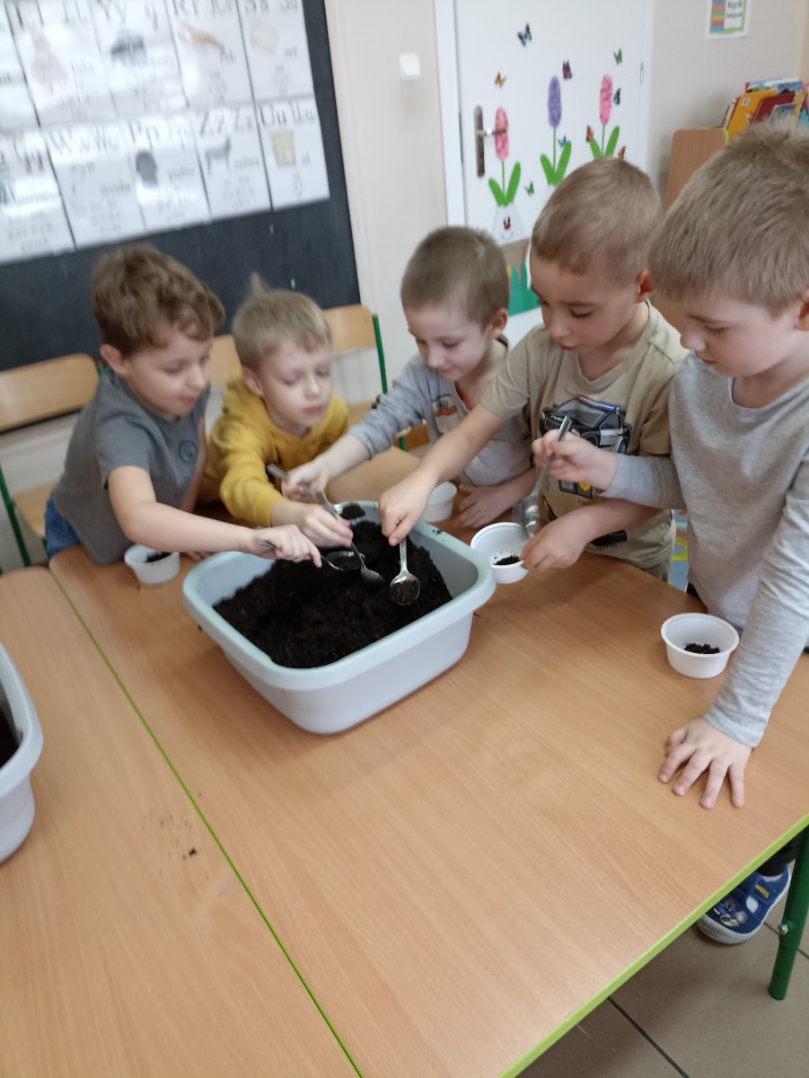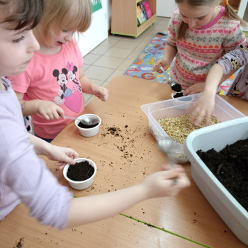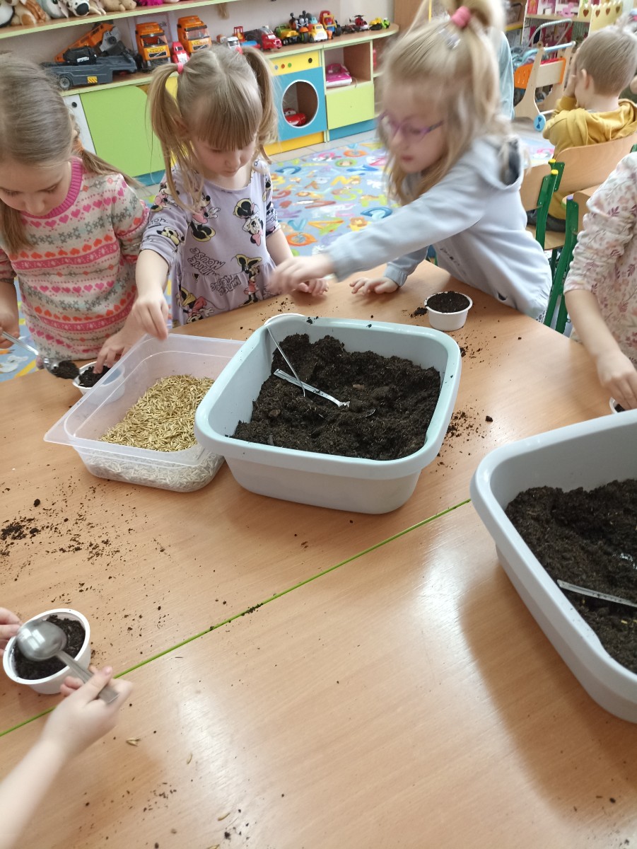 Mali ogrodnicy z grupy Sówek zasiali owies a także założyli hodowlę fasoli. Teraz już tylko podlewanie i obserwacje. Mamy nadzieję że nasz owies pięknie wyrośnie i ozdobi nasze stoliczki.
