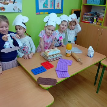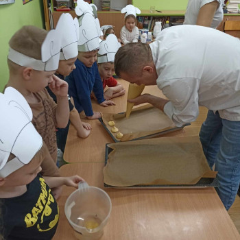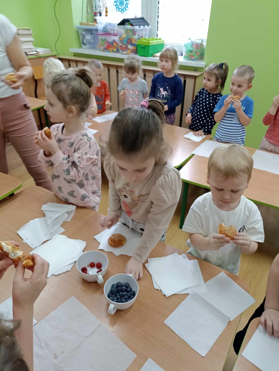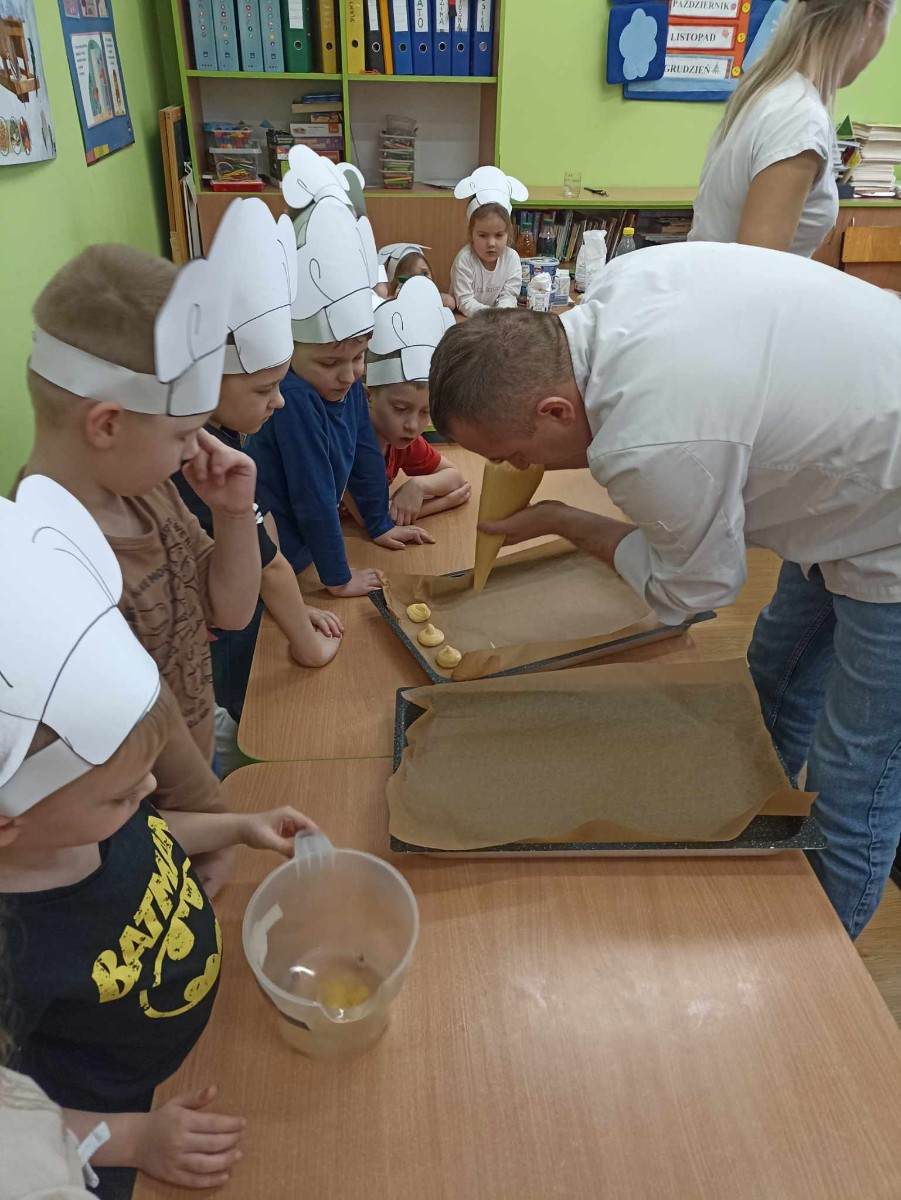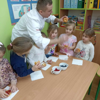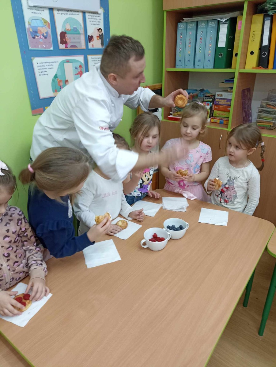 Zawody moich bliskich. Gościem dzisiejszym był Pan Piotr Binkowski z zawodu kucharz. Zdradził nam tajniki przepisu na pyszne ptysie z bitą śmietaną i owocami jak również na żelki owocowe, które wykonaliśmy razem z nim. Bardzo dziękujemy za wspaniałe warsztaty.