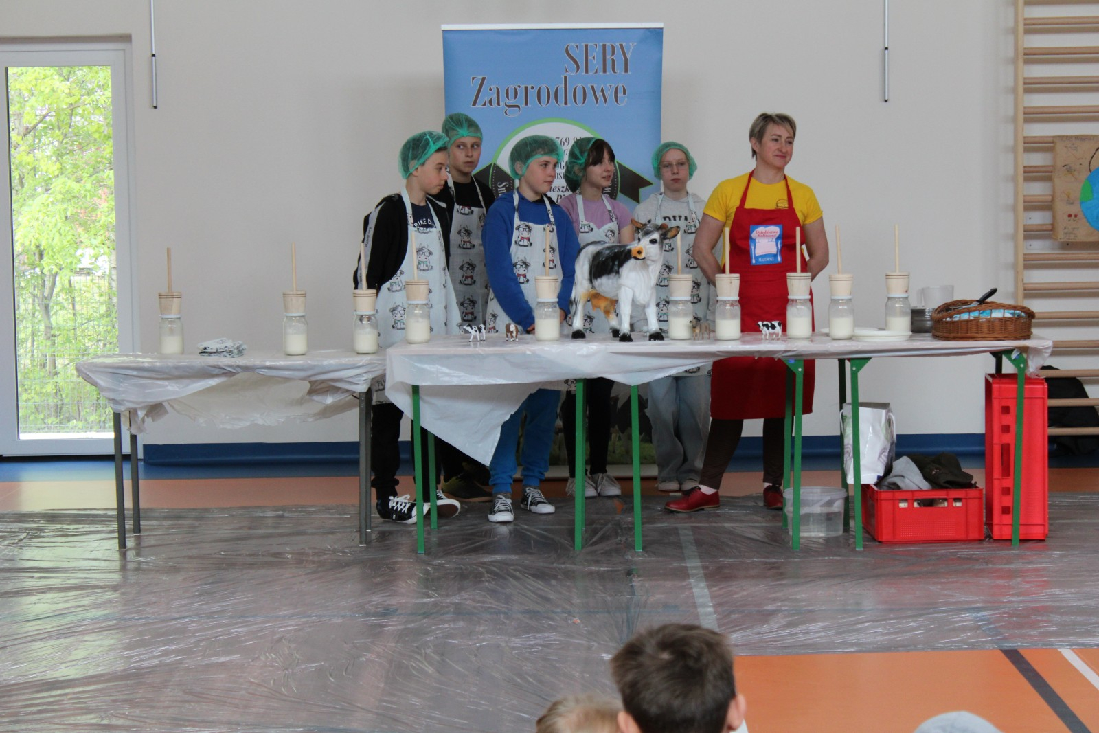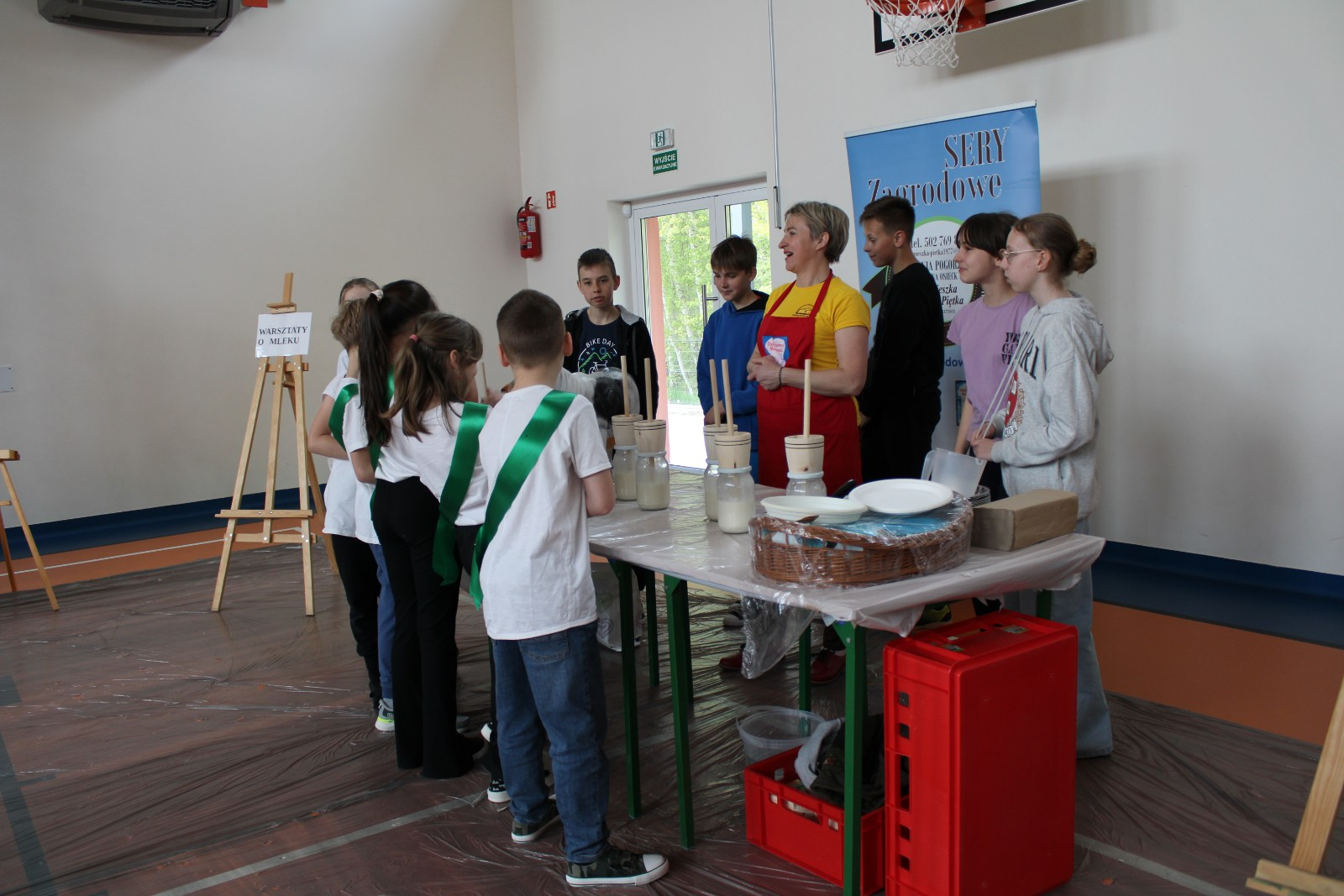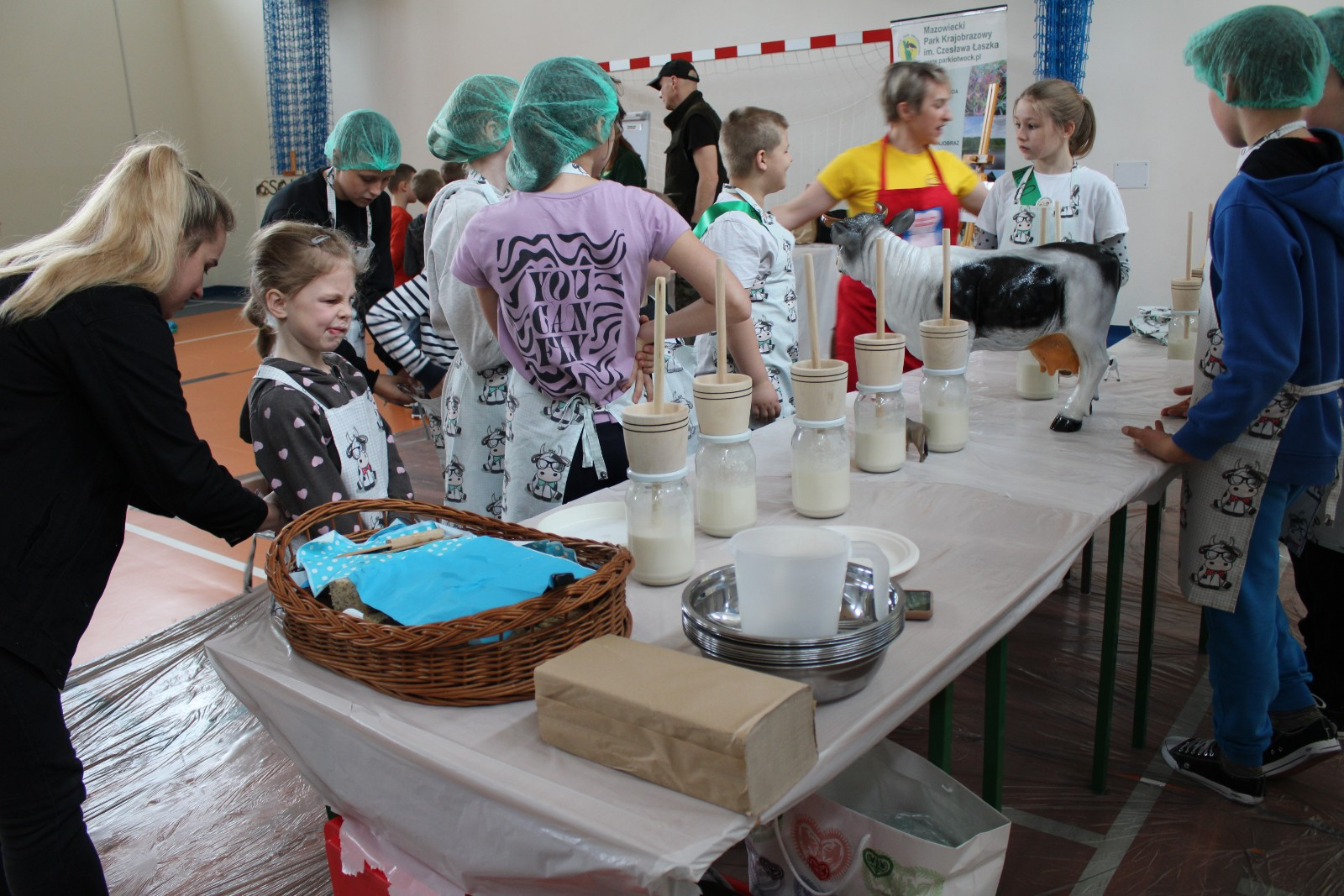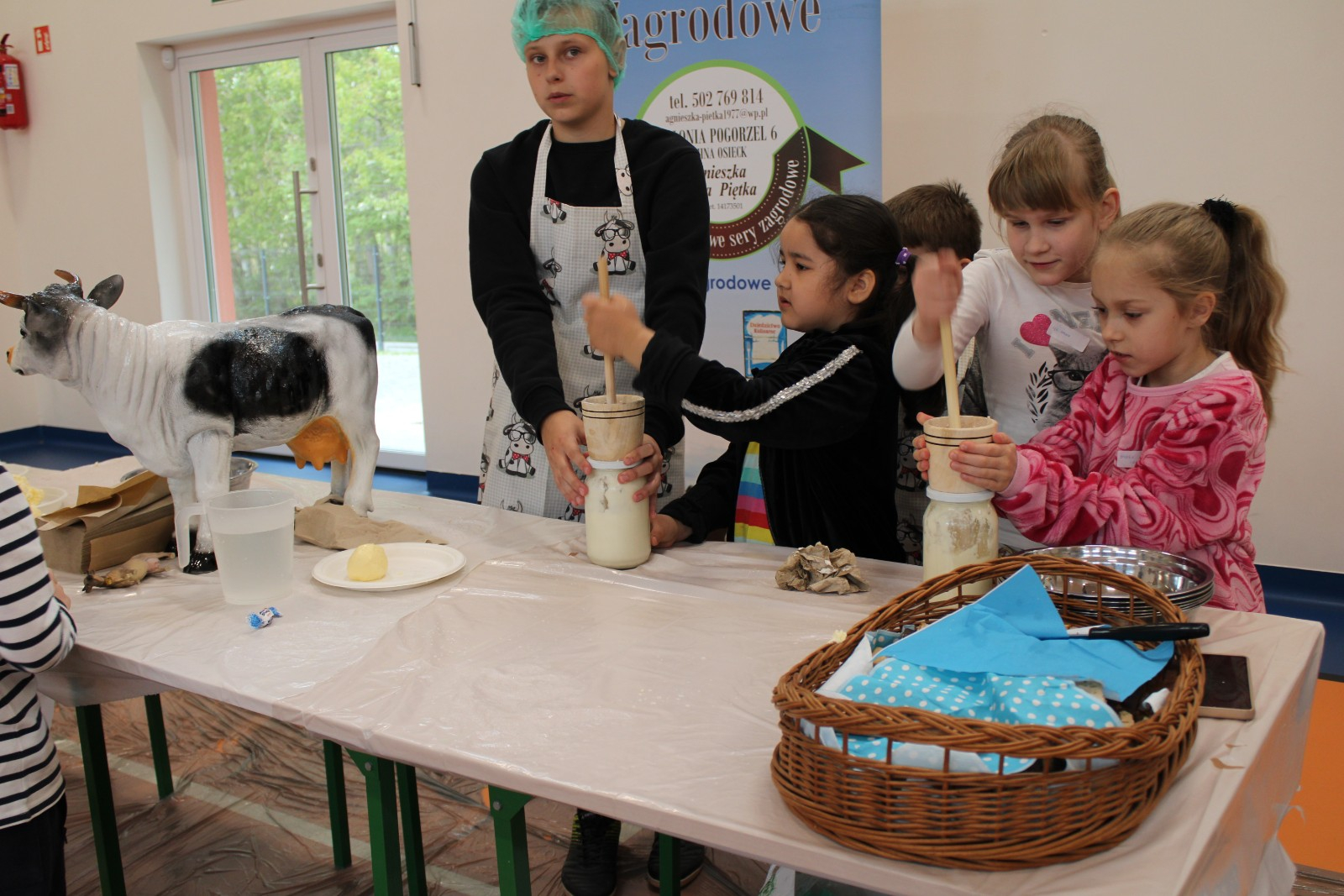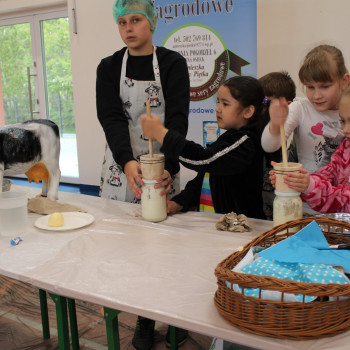 Pani Agnieszka Piętka, która na co dzień prowadzi gospodarstwo ekologiczne opowiedziała uczniom o pełnowartościowych produktach nabiałowych wytwarzanych tradycyjnymi metodami. Dzieci mogły samodzielnie zrobić masełko, a następnie spróbować chlebka posmarowanego tym smacznym produktem.