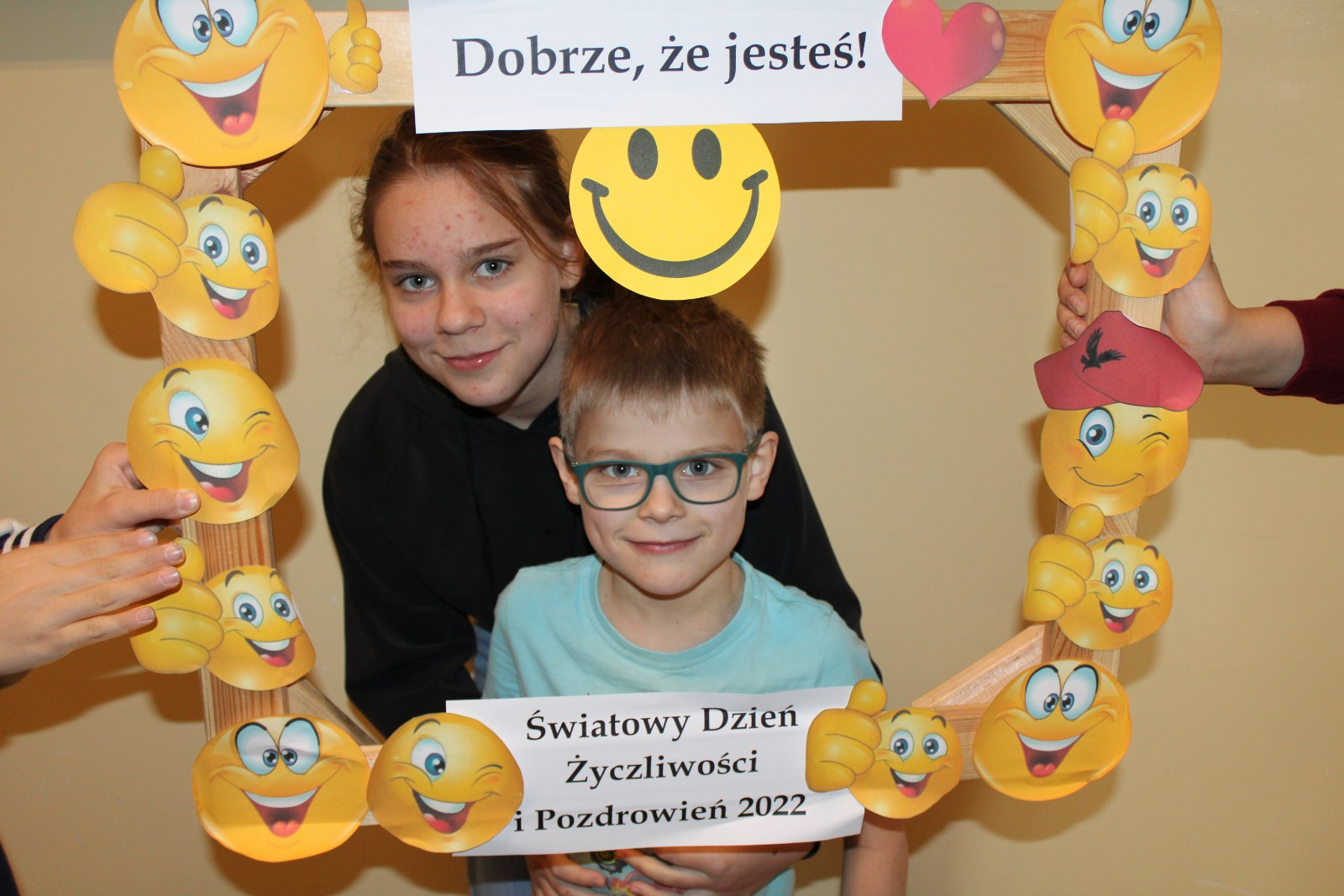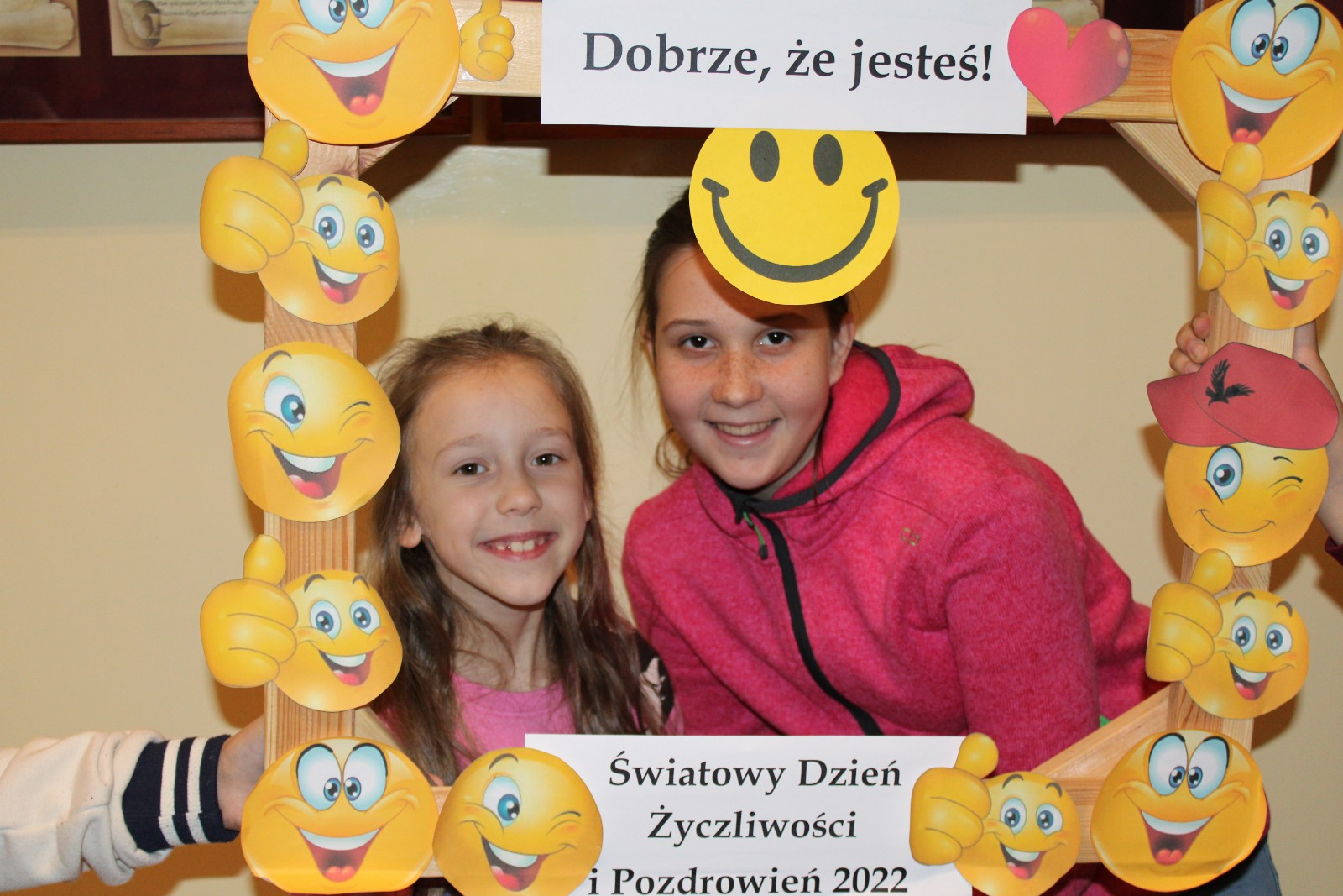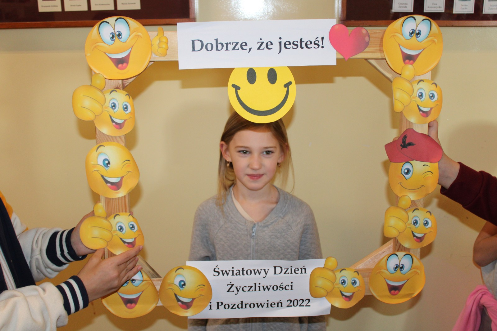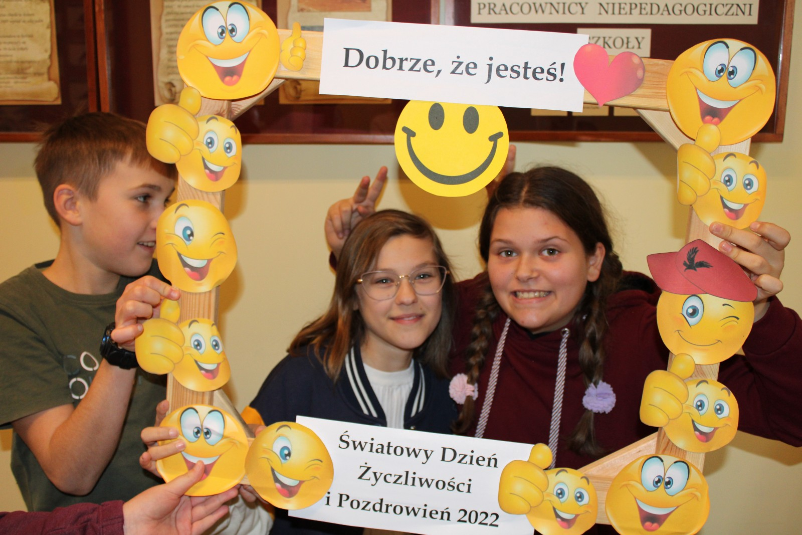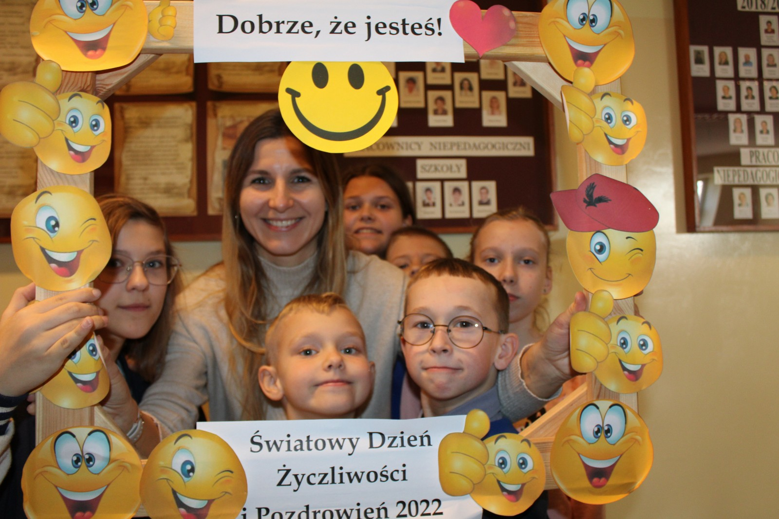 W poniedziałek 21 listopada 2022 roku obchodziliśmy w szkole Światowy Dzień Życzliwości i Pozdrowień. Z tej okazji pani pedagog przygotowała dwie gazetki tematyczne oraz „Drzewko Życzliwości”, na którym każdy z uczniów zawieszał swój liść z napisanym przez siebie miłym pozdrowieniem. W czasie długich przerw można było zrobić sobie zdjęcie w okolicznościowej ramce „Dobrze, że jesteś” przygotowaną przez panią pedagog na ten dzień. Przy okazji Dnia Życzliwości i Pozdrowień nie można było zapomnieć o naszej adopcyjnej siostrze Belsie. Uczniowie z pomocą pani Weroniki Golewskiej napisali list w języku angielskim oraz wykonali kartki na nadchodzące święta, które pani pedagog wysłała do Afryki.