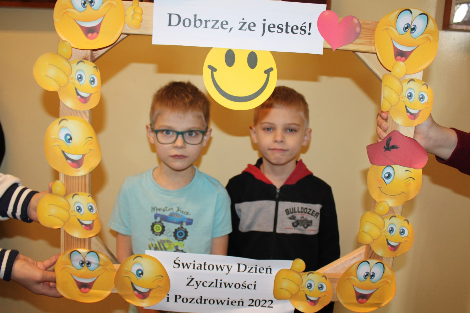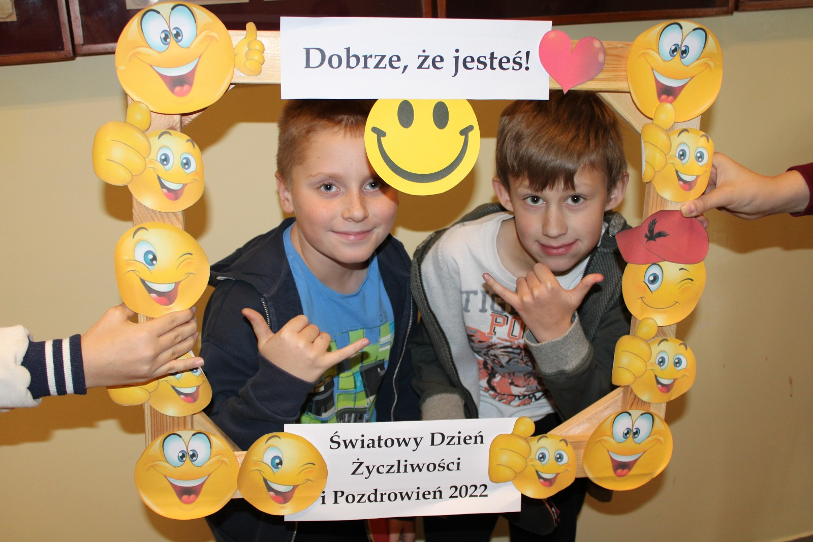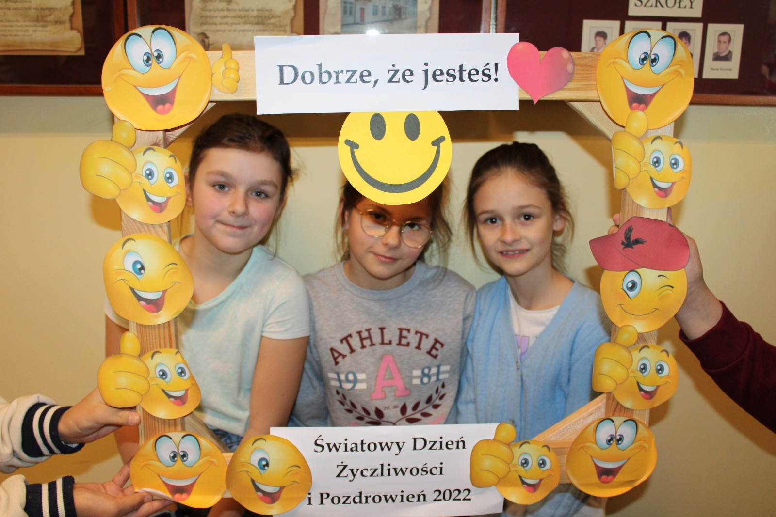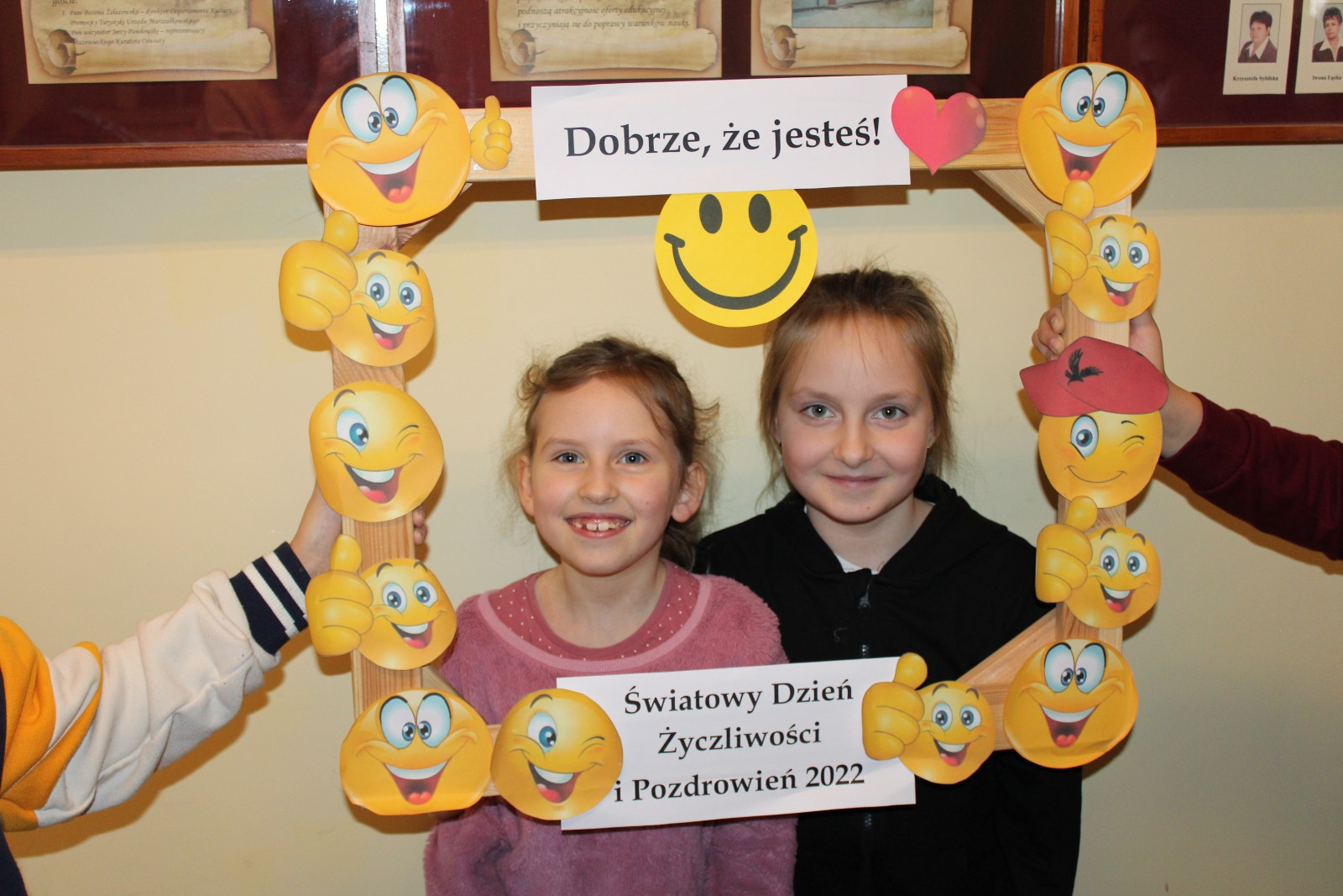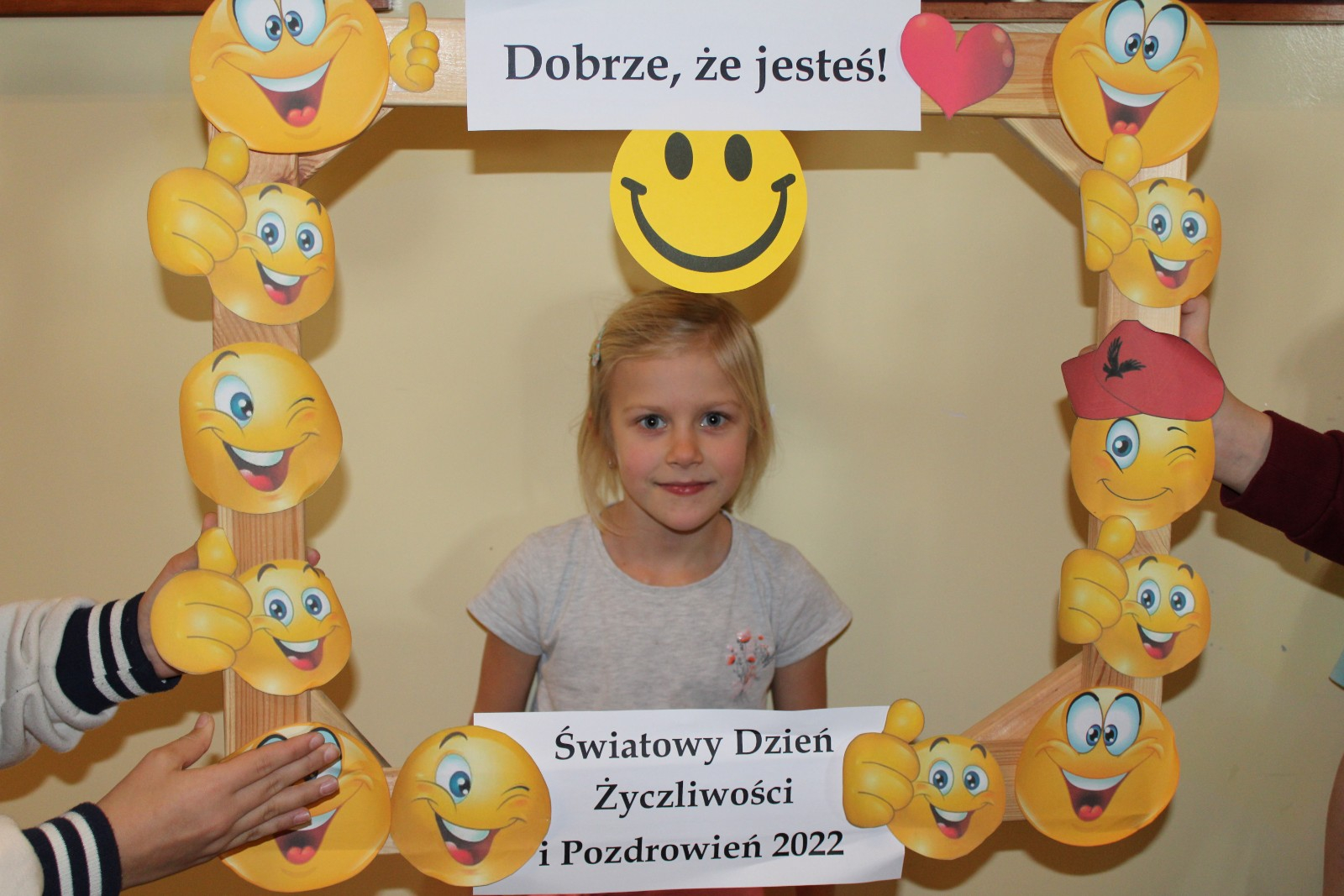 W poniedziałek 21 listopada 2022 roku obchodziliśmy w szkole Światowy Dzień Życzliwości i Pozdrowień. Z tej okazji pani pedagog przygotowała dwie gazetki tematyczne oraz „Drzewko Życzliwości”, na którym każdy z uczniów zawieszał swój liść z napisanym przez siebie miłym pozdrowieniem. W czasie długich przerw można było zrobić sobie zdjęcie w okolicznościowej ramce „Dobrze, że jesteś” przygotowaną przez panią pedagog na ten dzień. Przy okazji Dnia Życzliwości i Pozdrowień nie można było zapomnieć o naszej adopcyjnej siostrze Belsie. Uczniowie z pomocą pani Weroniki Golewskiej napisali list w języku angielskim oraz wykonali kartki na nadchodzące święta, które pani pedagog wysłała do Afryki.