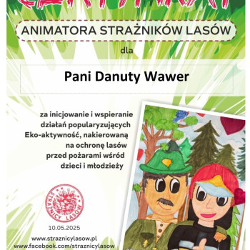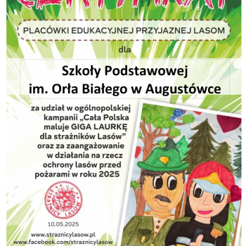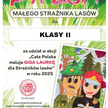 Uczniowie klas I-IV namalowały piękne laurki w formie scenek przedstawiające pracę Strażników Lasów. Z tysiąca nadesłanych prac z całej Polski, organizatorzy akcji stworzyli GIGA laurkę, która na 15 metrów długości.