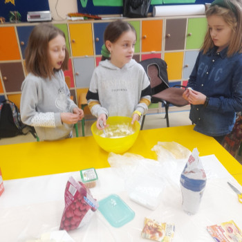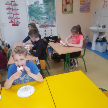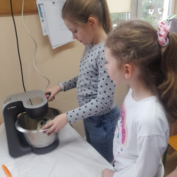 Przed przystapieniem do pracy dzieci zostały zapoznane ze sposobem urządzeń elektrycznych, a także poinstruowane jak nalezy bezpiecznie z nich korzystać. Nastepnie samodzielnie odczytały przepis na babkę i odmierzały odpowiednią ilość potrzebnych składników. Na efekt pracy uczniowie czekali z niecierpliwością. Kiedy ciasto było gotowe, odbyła się współna degustacja.