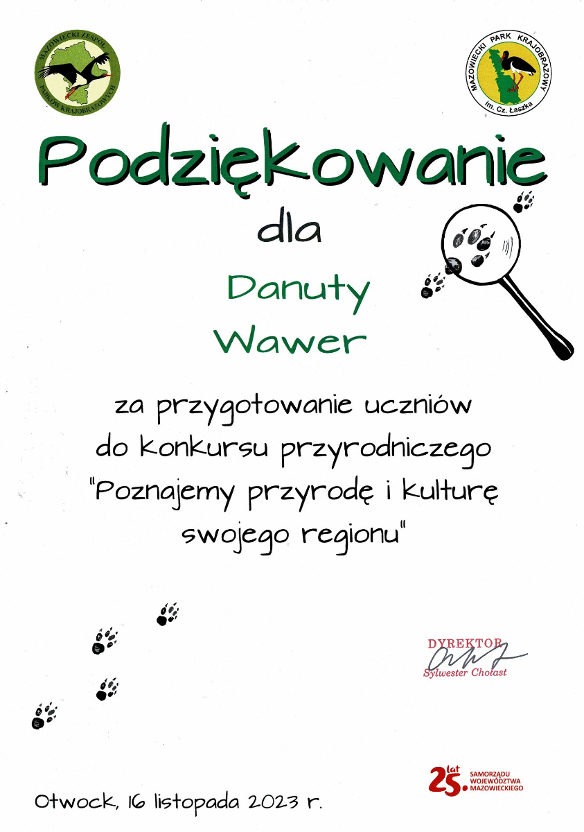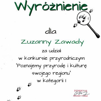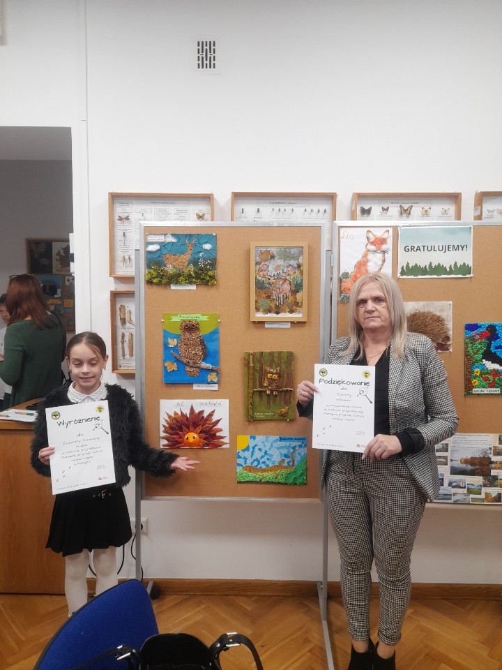 W dniu 16 listopada 2023 r. w siedzibie Mazowieckiego Zespołu Parków Krajobrazowych w Otwocku odbyło się uroczyste rozdanie nagród i dyplomów w konkursie ,,Poznajemy przyrodę i kulturę swojego regionu''. Wyróżnienie otrzymała Zuzanna Zawada uczennica klasy III.