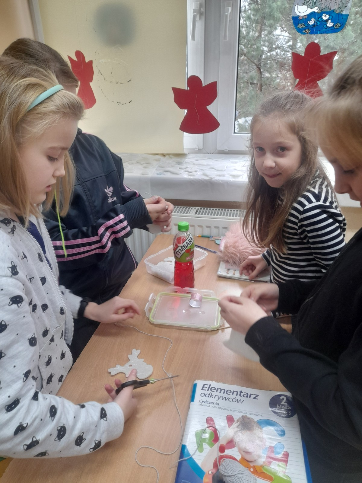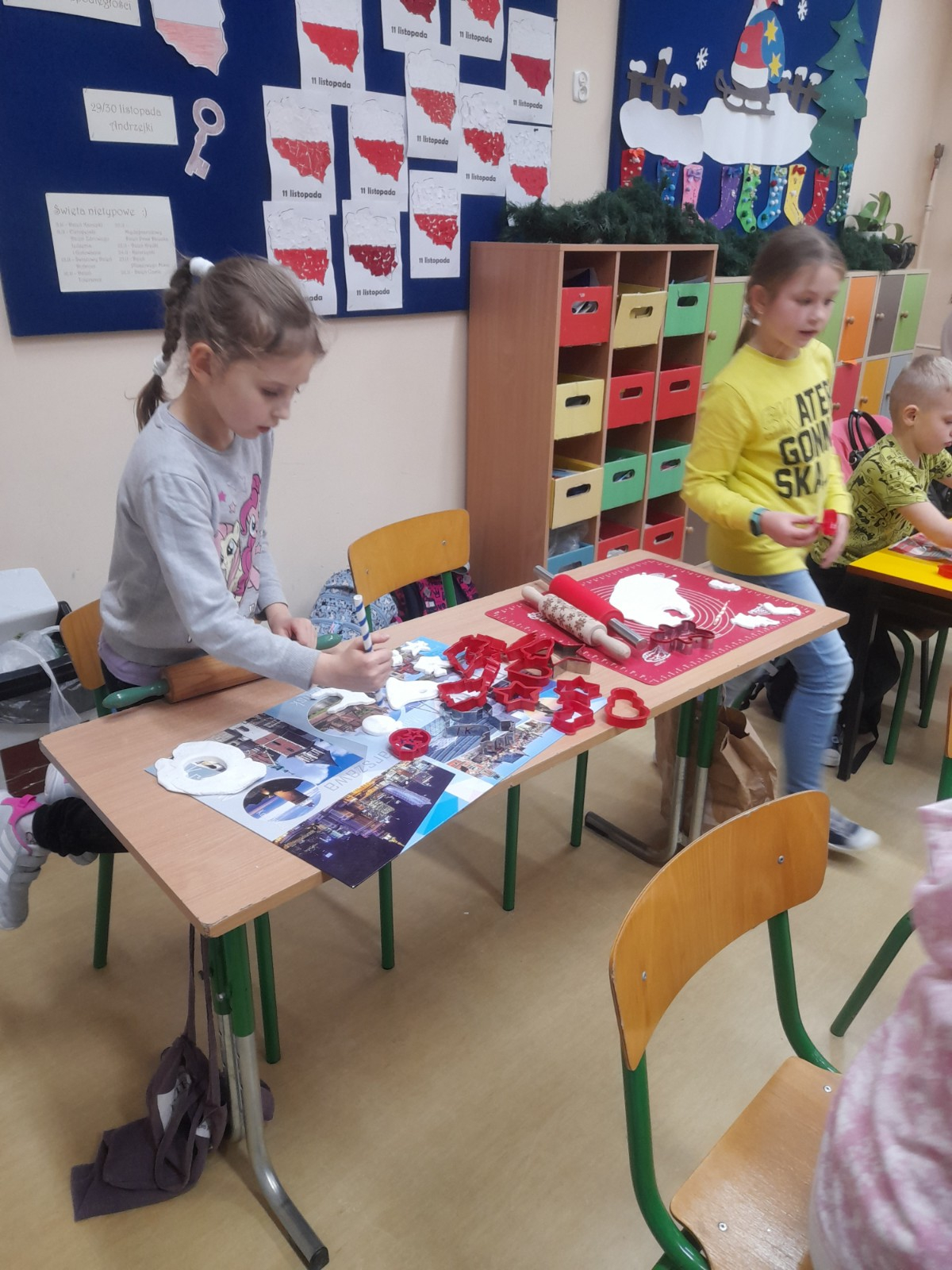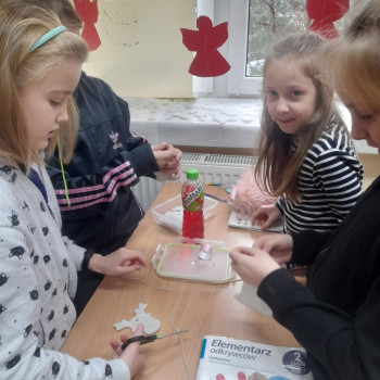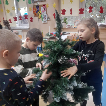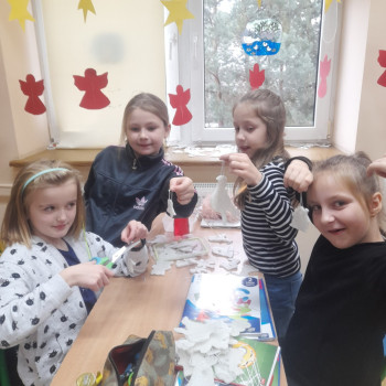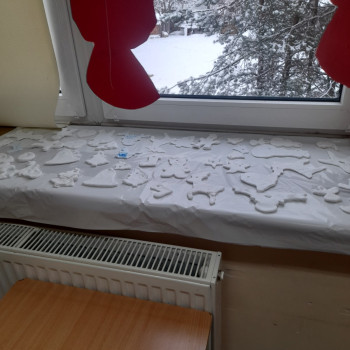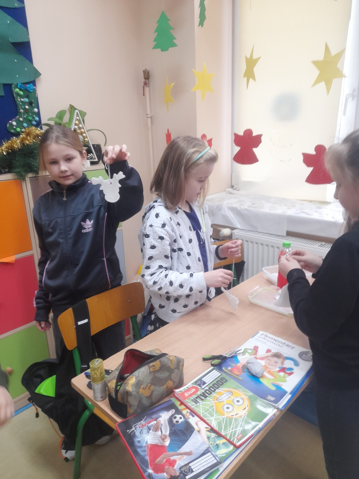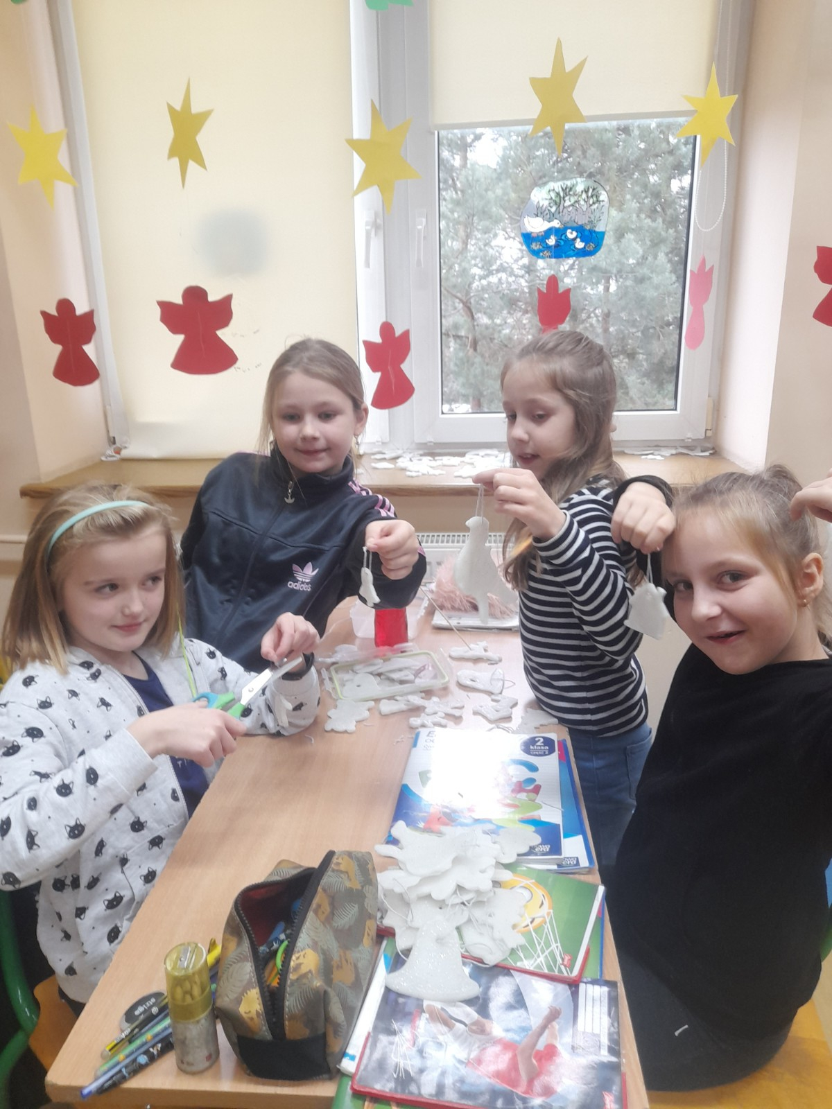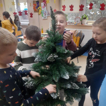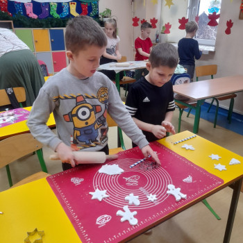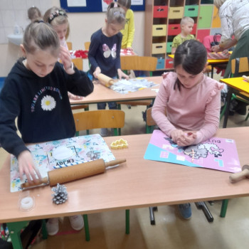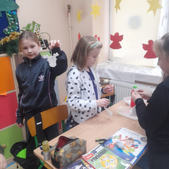 Trwaja przygotowania do świąt. Uczniowie klasy II robią ozdoby choinkowe z masy porcelanowej pod bacznym okiem Pani Danusi i Joasi. Praca dała dzieciom wiele satysfakcji. Teraz trzeba tylko poczekać aż wszystko wyschnie i zostanie powieszone na choince.