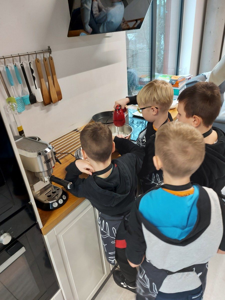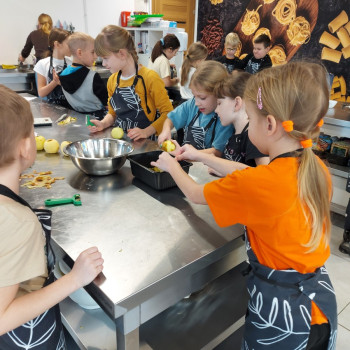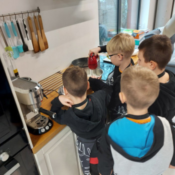 Uczniowie zgodnie oraz z pełnym zaangażowaniem i radością współpracowali podczas pracy w kuchni.