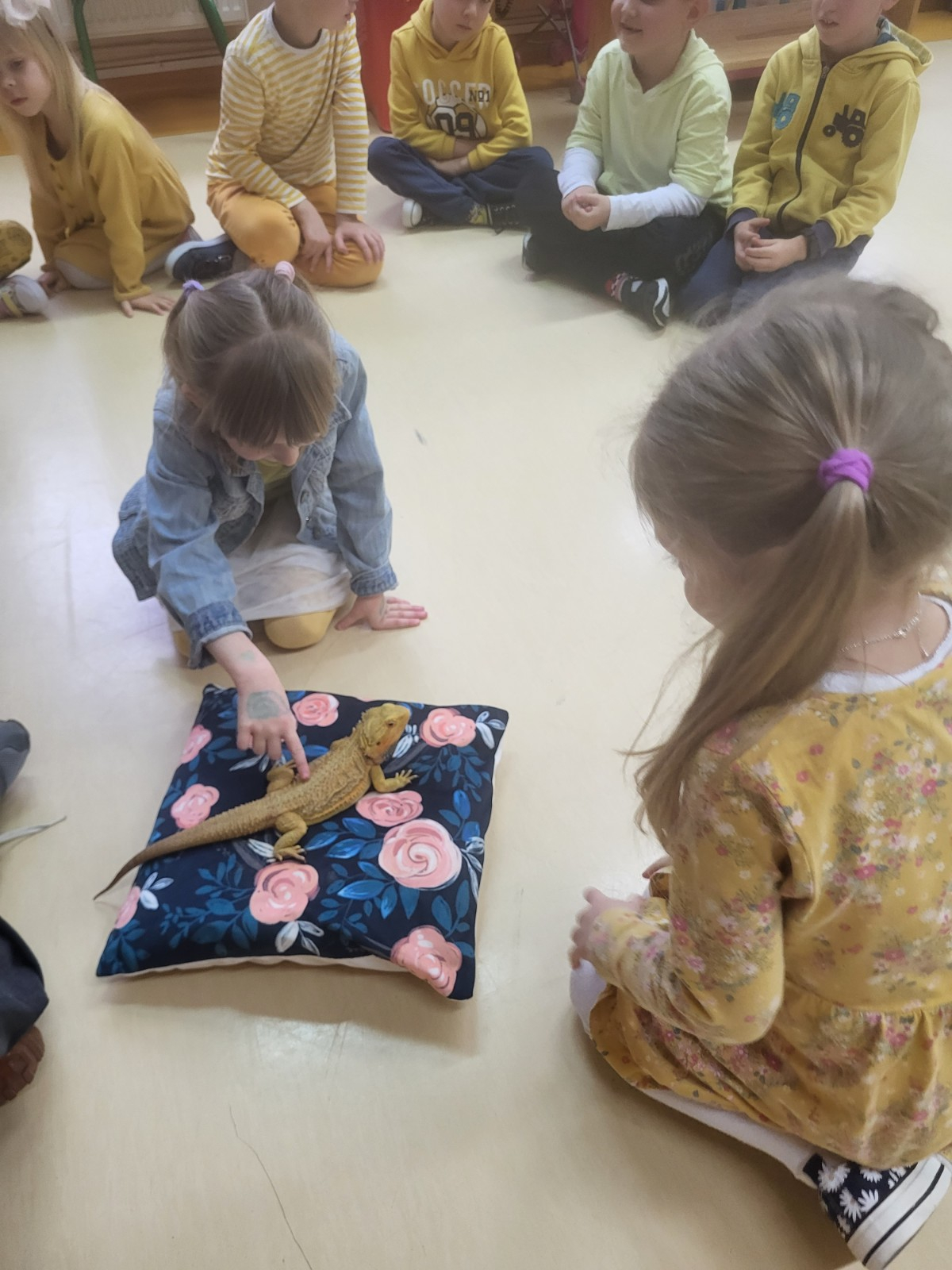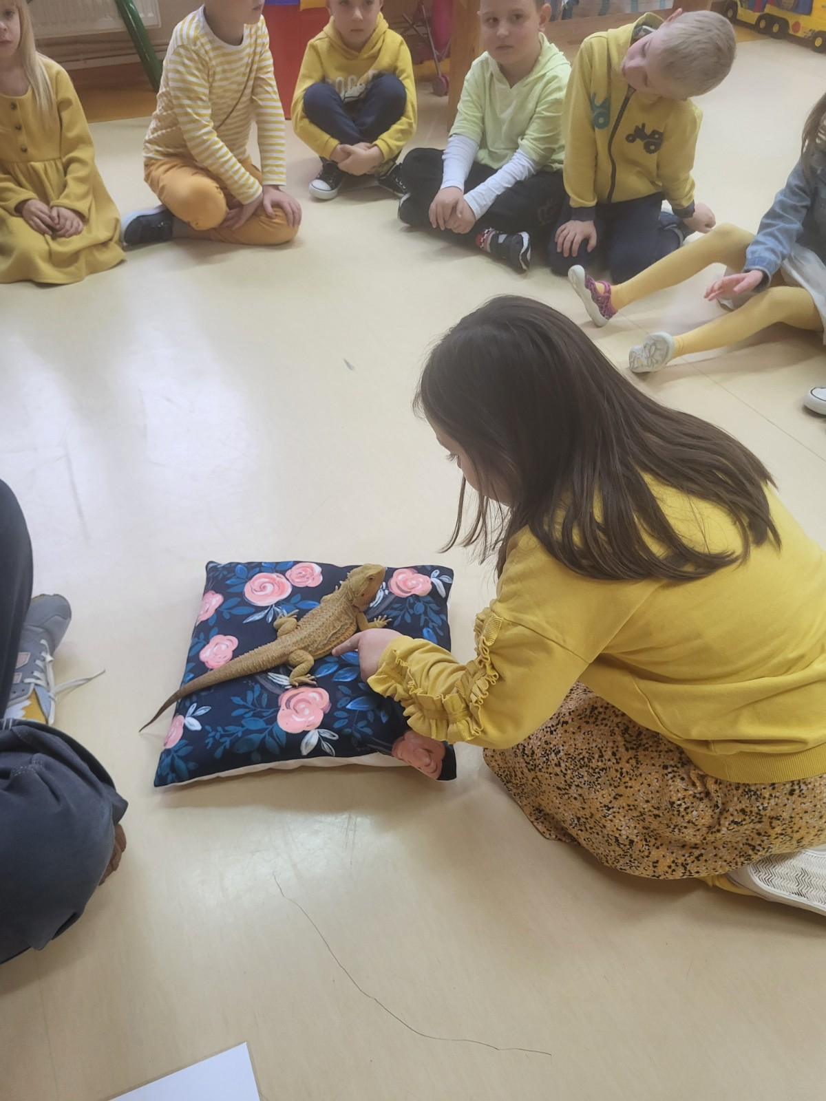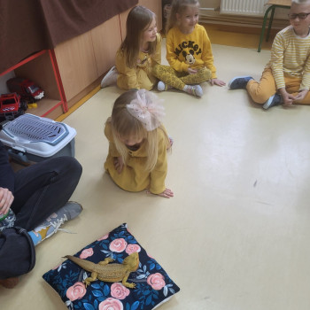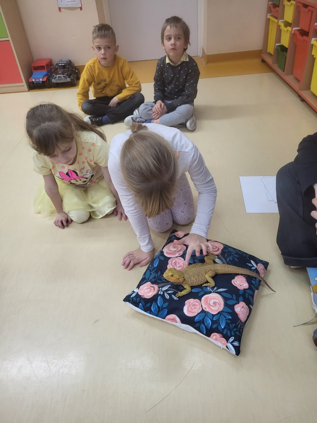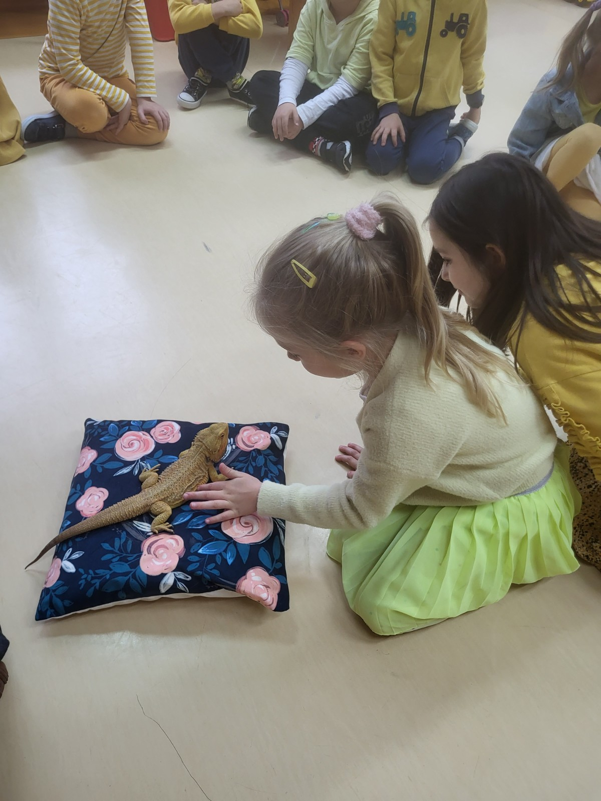 Dzieci z zainteresowaniem słuchały opowiesci o życiu i zwyczajach jaszczurki. Miały okazje obejrzeć pokarm zwierzątka, a nawet pogłaskać jaszczurkę.