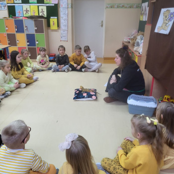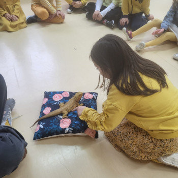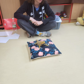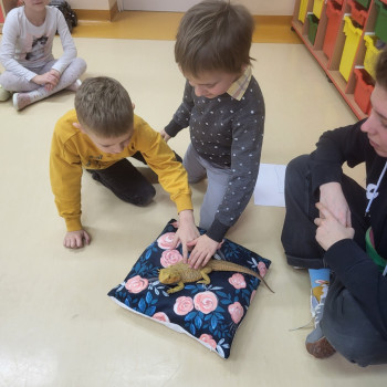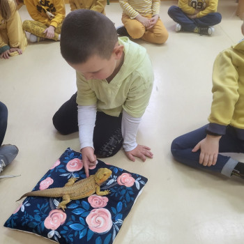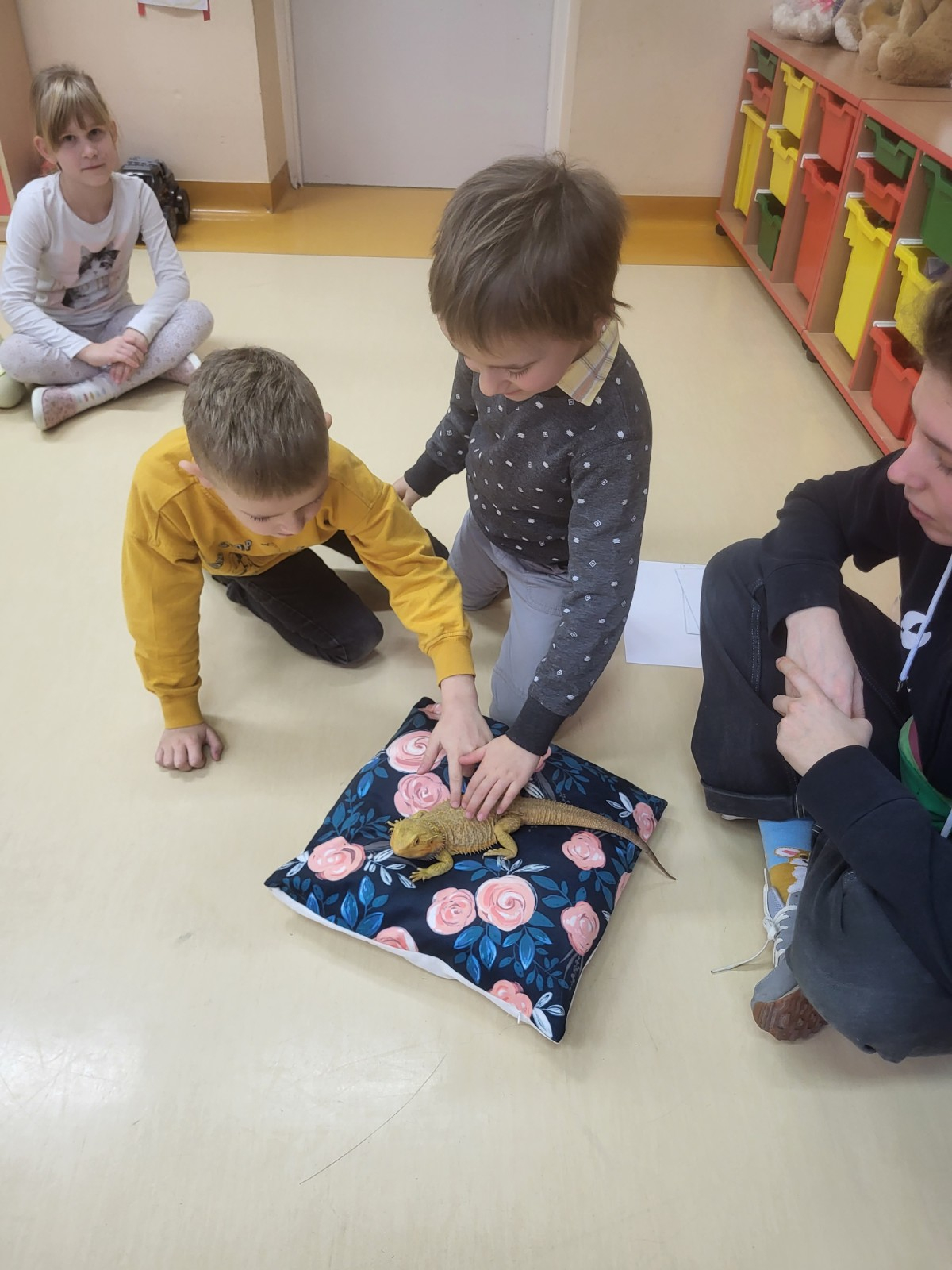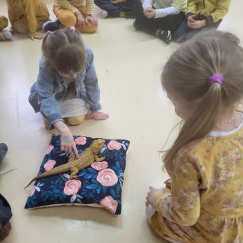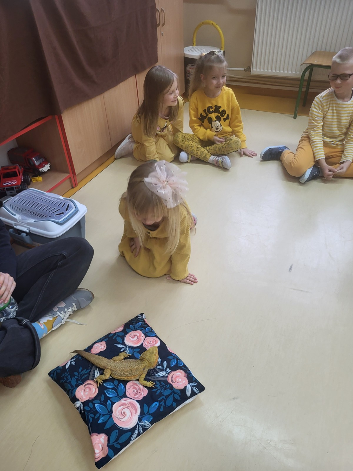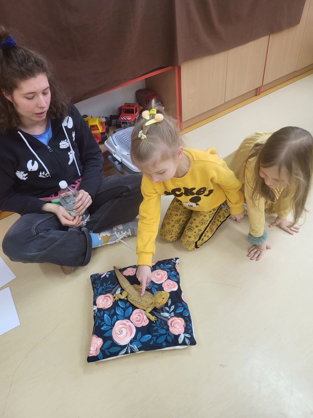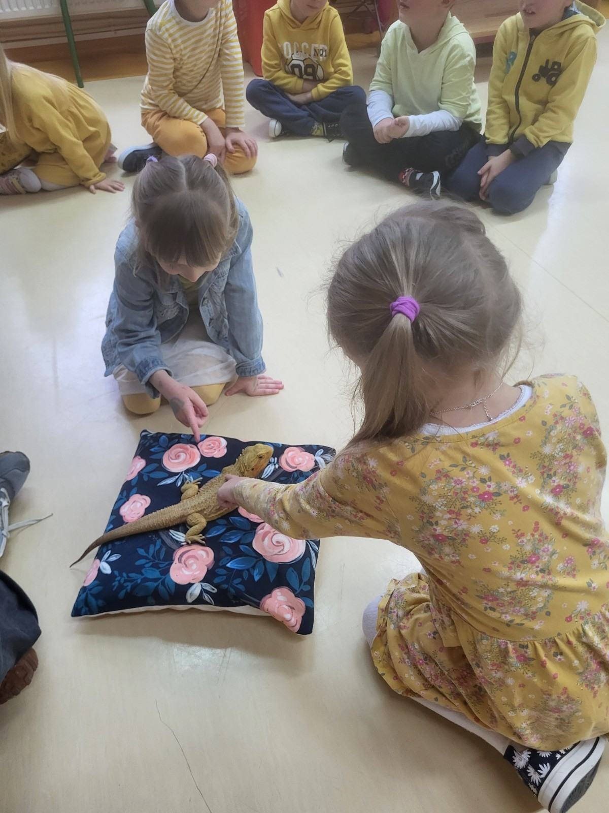 Dzieci z zainteresowaniem słuchały opowiesci o życiu i zwyczajach jaszczurki. Miały okazje obejrzeć pokarm zwierzątka, a nawet pogłaskać jaszczurkę.