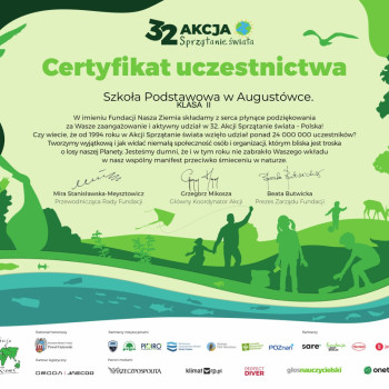 22 września uczniowie naszej szkoły włączyli się w 32 edycję ogólnopolskiej Akcji Sprzątanie Świata,która w tym roku przebiegała pod hasłem,,W naturę z kulturą''.Spotkanie rozpoczęła Burmistrz Miasta i Gminy Osieck Pani Karolina Zowczak,która podkreśliła znaczenie troski o środowisko.Wyposażeni w worki i rękawiczki,uczestnicy wyruszyli w wyznaczone rejony,by wspólnie zadbać o czystość najbliższej okolicy.Razem dbamy o czystą i piękną planetę! Serdecznie dziękuję uczniom i rodzicom za aktywny udział i zaangażowanie.
