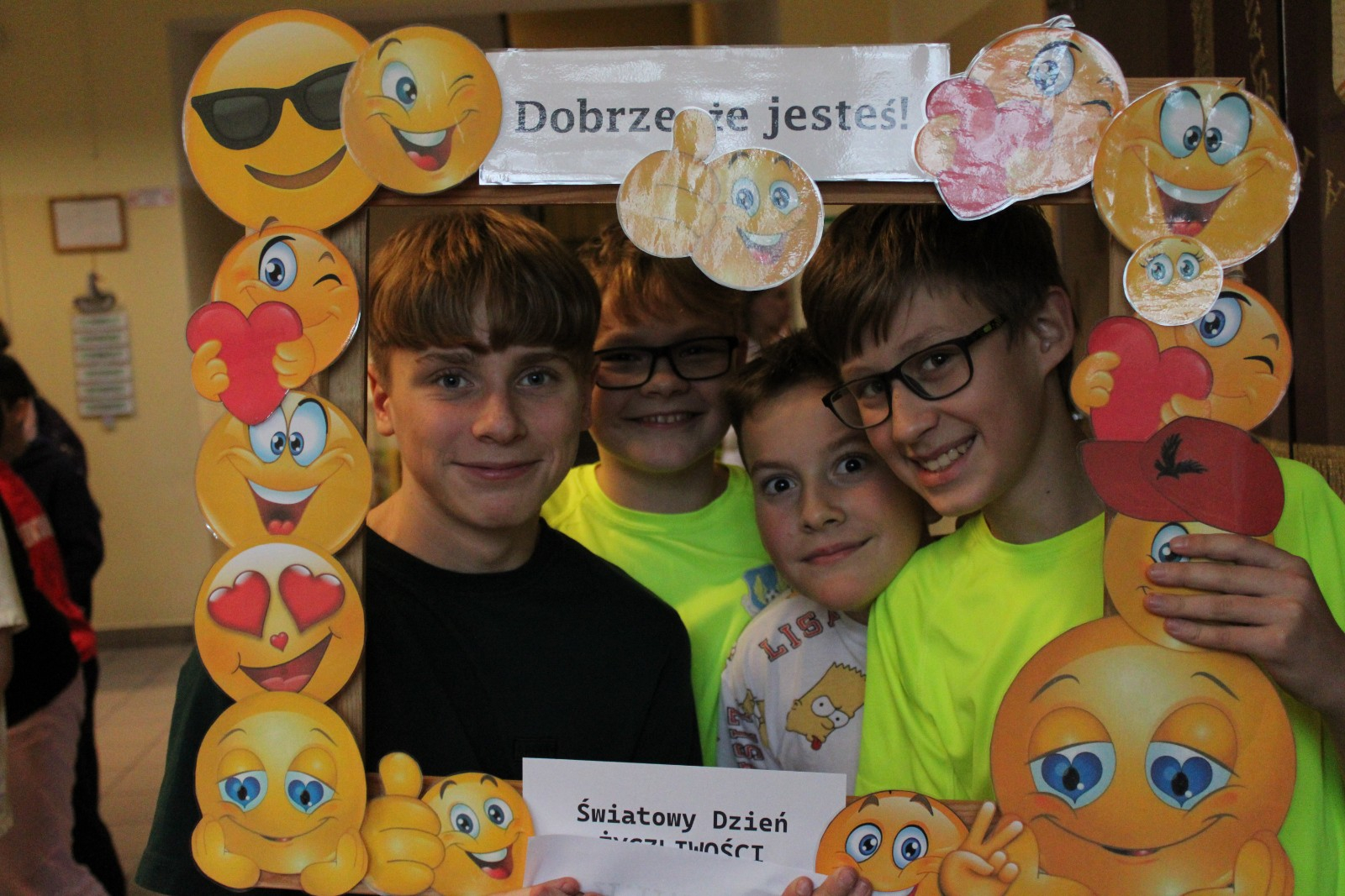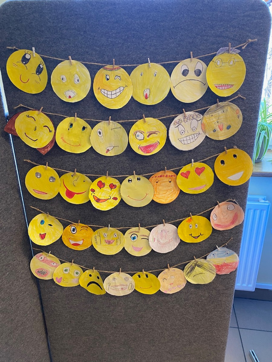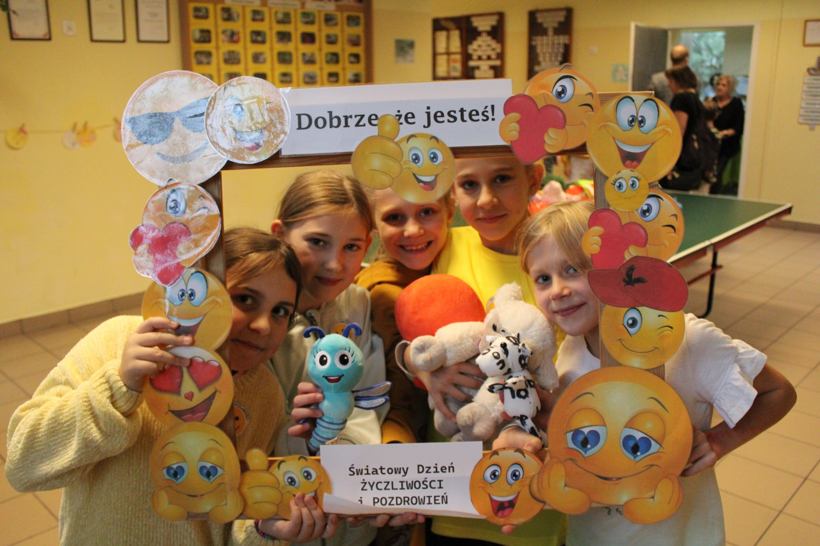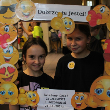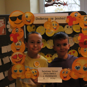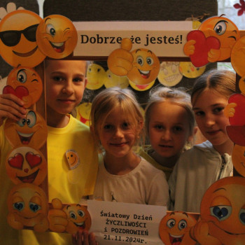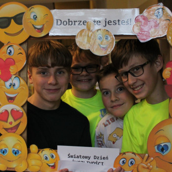 W środę obchodziliśmy Światowy Dzień Życzliwości i Pozdrowień. Tego dnia pani pedagog rozdawała uśmiechnięte ordery. Na przerwach można było zrobić sobie zdjęcie w okolicznościowej ramce oraz napisać serdeczne pozdrowienie, które zawisło na holu głównym, podobnie jak symboliczne emotki wykonane przez klasy I-III. Klasy VII i VIII miały tego dnia warsztaty z technik antystresowych przeprowadzone przez panią psycholog.