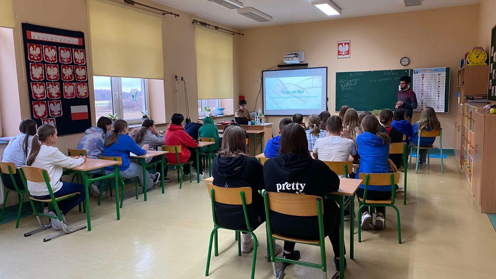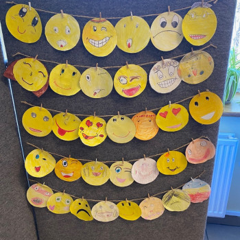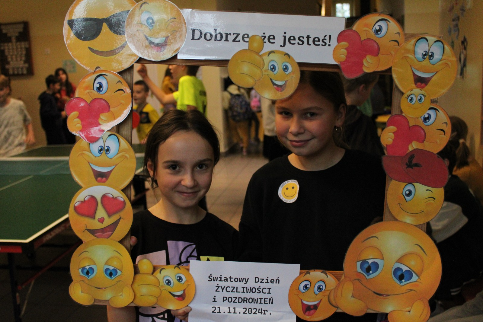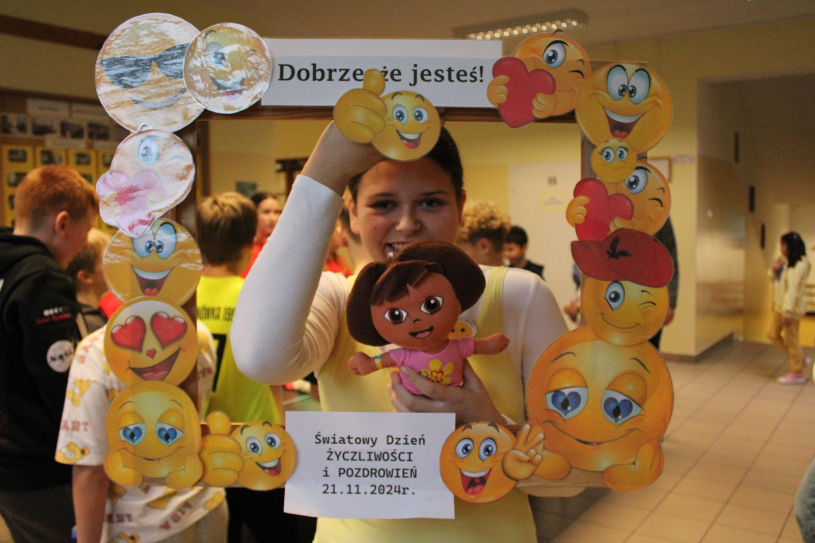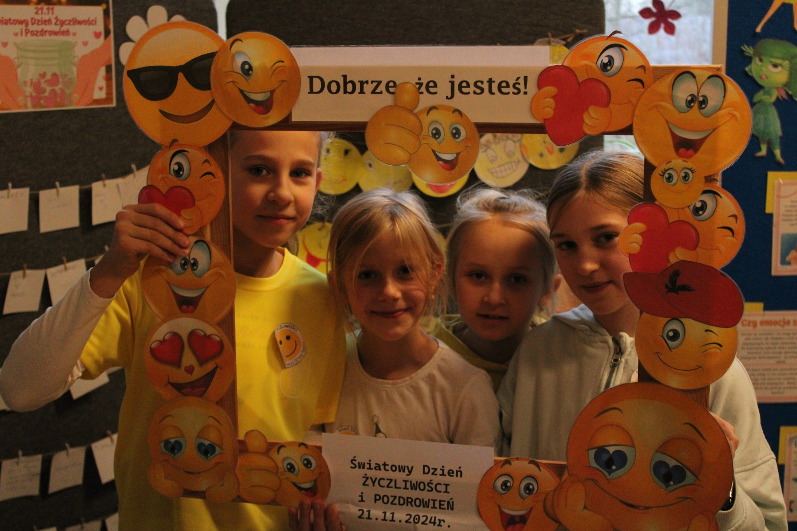 W środę obchodziliśmy Światowy Dzień Życzliwości i Pozdrowień. Tego dnia pani pedagog rozdawała uśmiechnięte ordery. Na przerwach można było zrobić sobie zdjęcie w okolicznościowej ramce oraz napisać serdeczne pozdrowienie, które zawisło na holu głównym, podobnie jak symboliczne emotki wykonane przez klasy I-III. Klasy VII i VIII miały tego dnia warsztaty z technik antystresowych przeprowadzone przez panią psycholog.