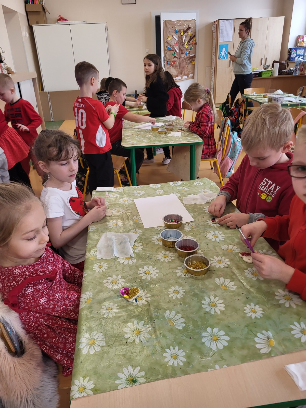 -Ozdabianie serc z masy solnej . Gotowe serca dla dzieci przygotowali rodzice..