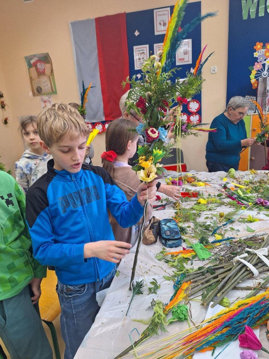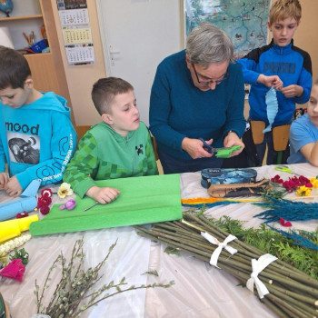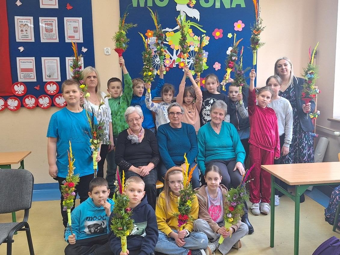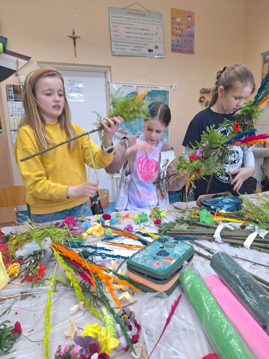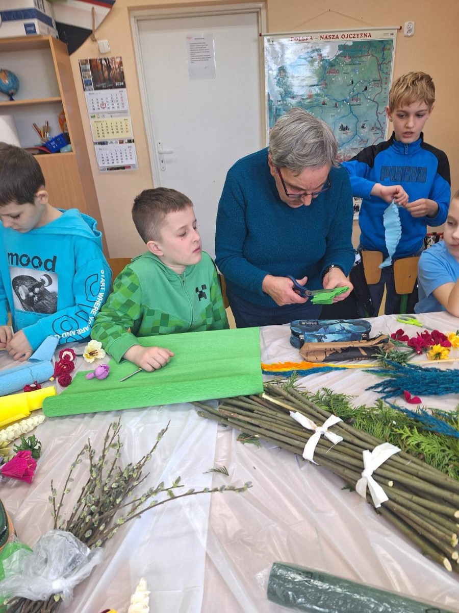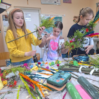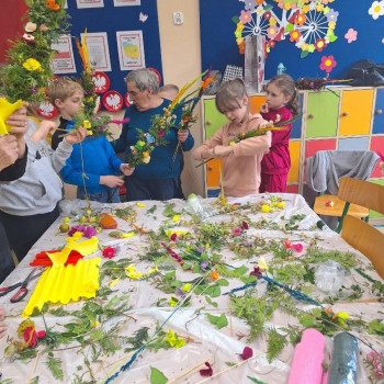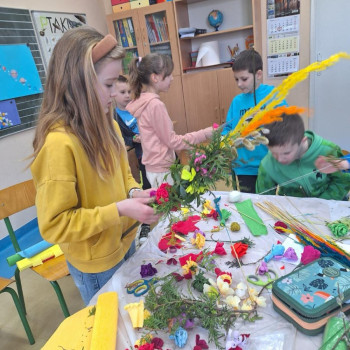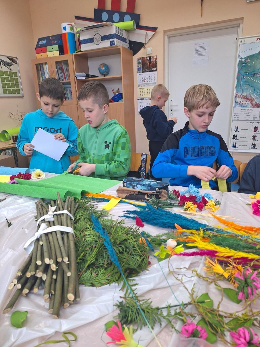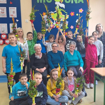 W ramach projektu ,,Zwyczaje i tradycje ziemi mazowieckiej" 20 marca 2024 r. uczniowie klasy III wykonali tradycyjne palmy wielkanocne zgodnie z obowiązującymi zasadami naszego regionu. Zajęcia prowadziły panie z Koła Gospodyń Wiejskich w Augustówce: Pani Jadwiga Jankowska, Pani Kazimiera Witak, Pani Jadwiga Zielonka.