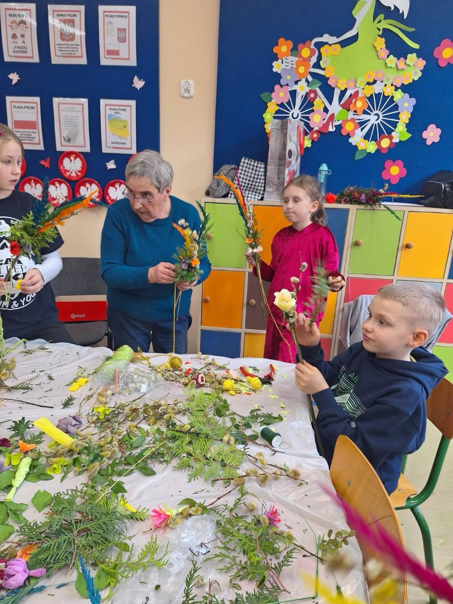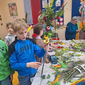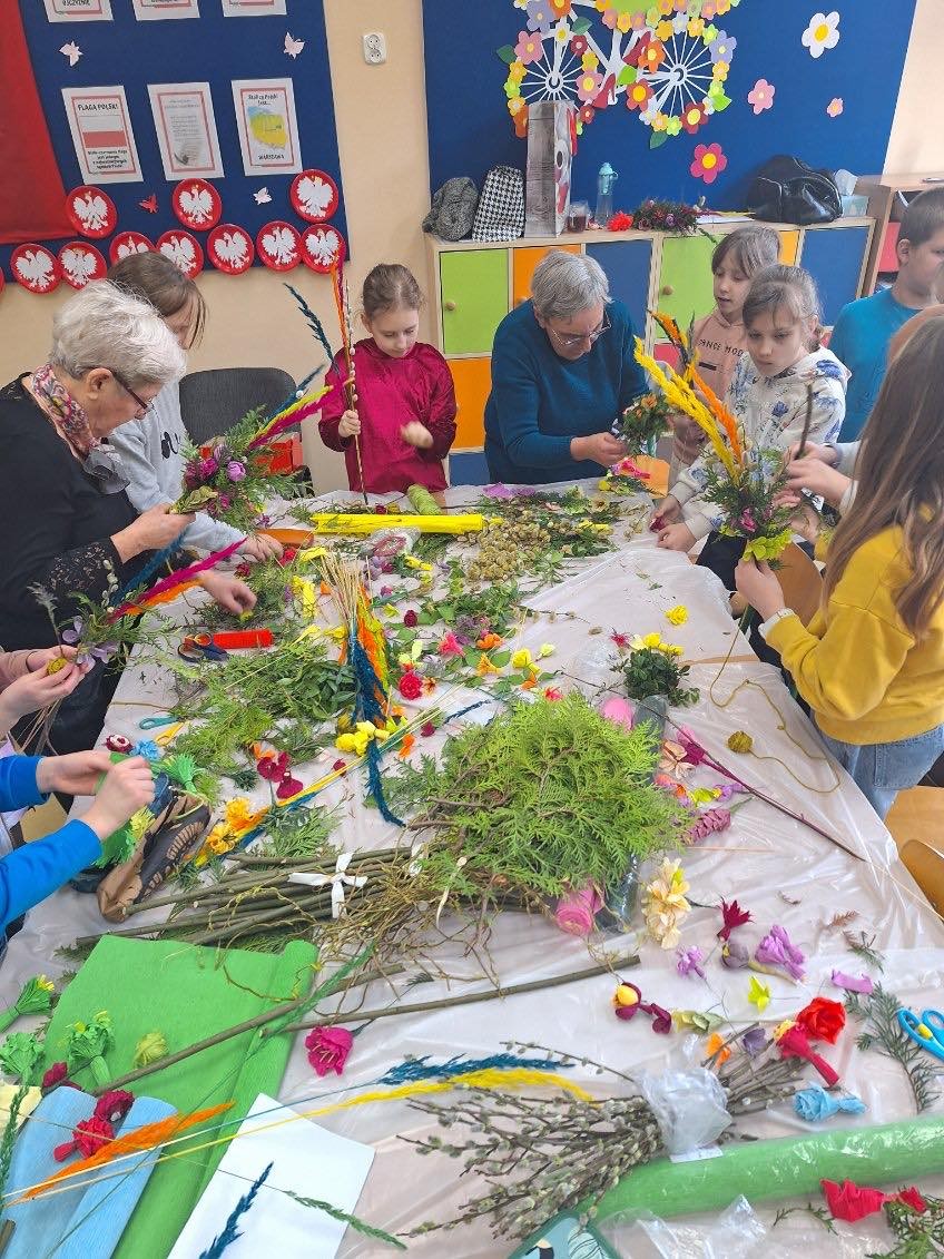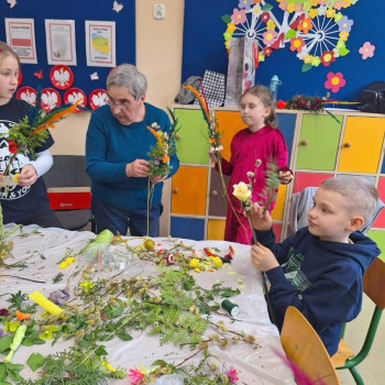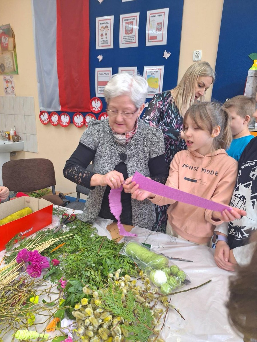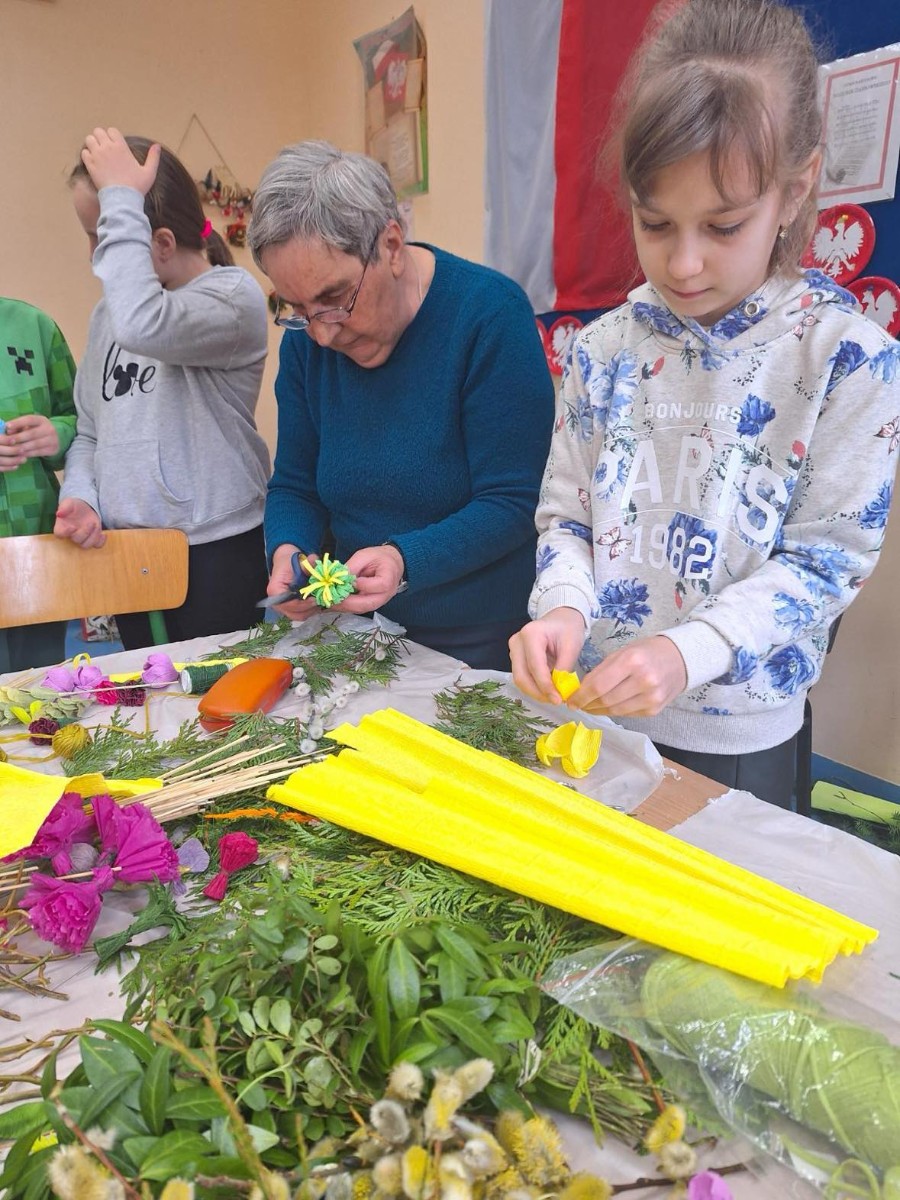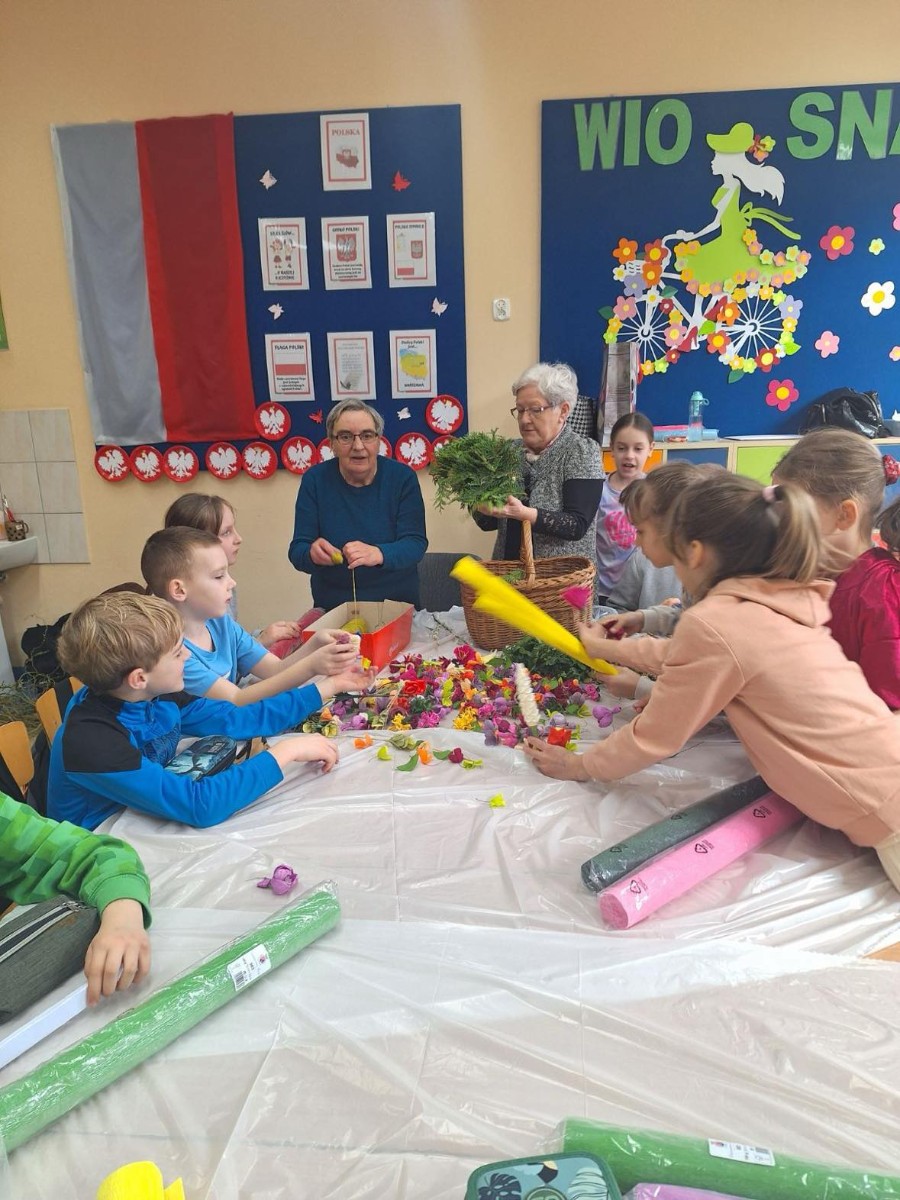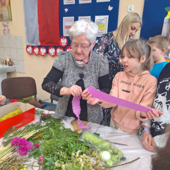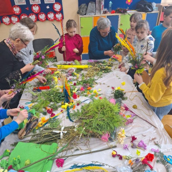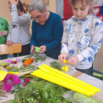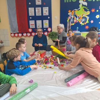 Panie zaprezentowały różne sposoby wykonywania kwiatów z bibuły, którymi ozdabia się palmy wielkanocne. Podczas zajęć panowała miła, serdeczna atmosfera. Celem zajęć było przybliżenie tradycji Świąt Wielkanocnych oraz rozwój kreatywności, sprawności manualnej oraz wrażliwości estetycznej dzieci.