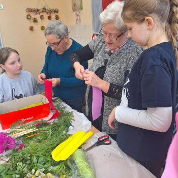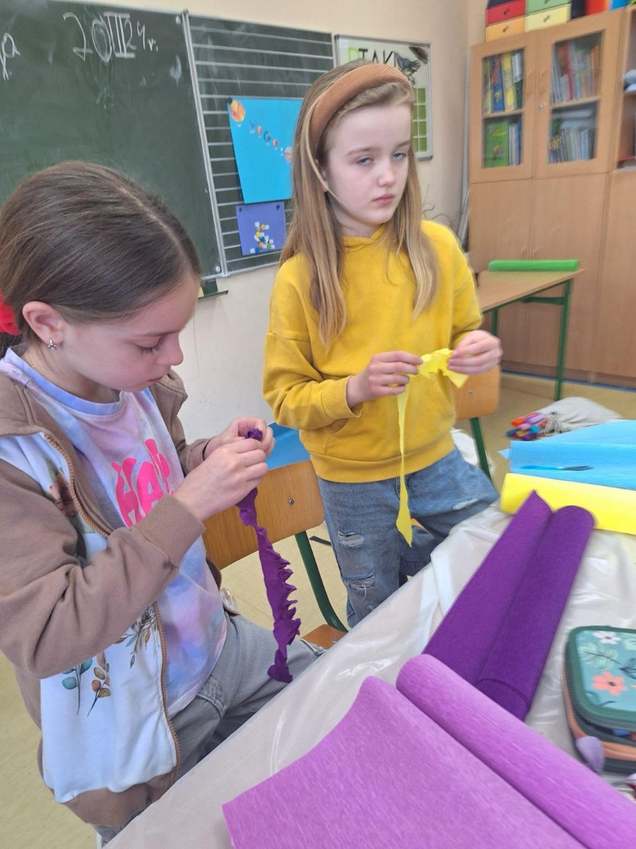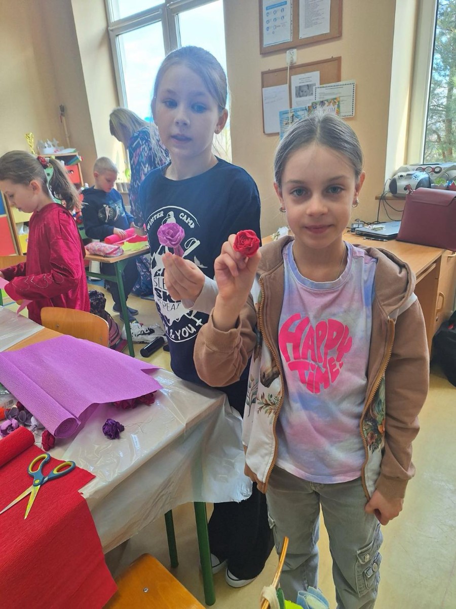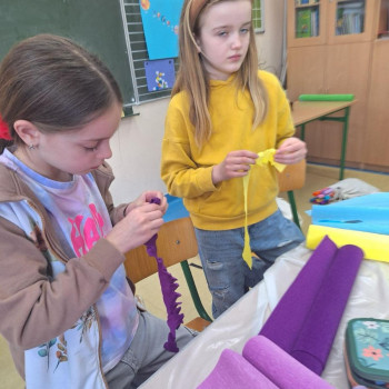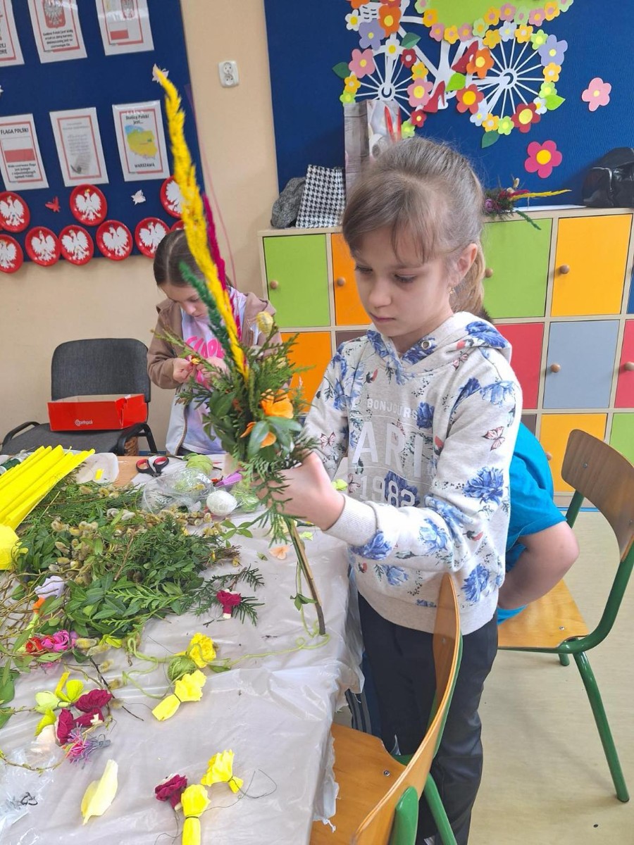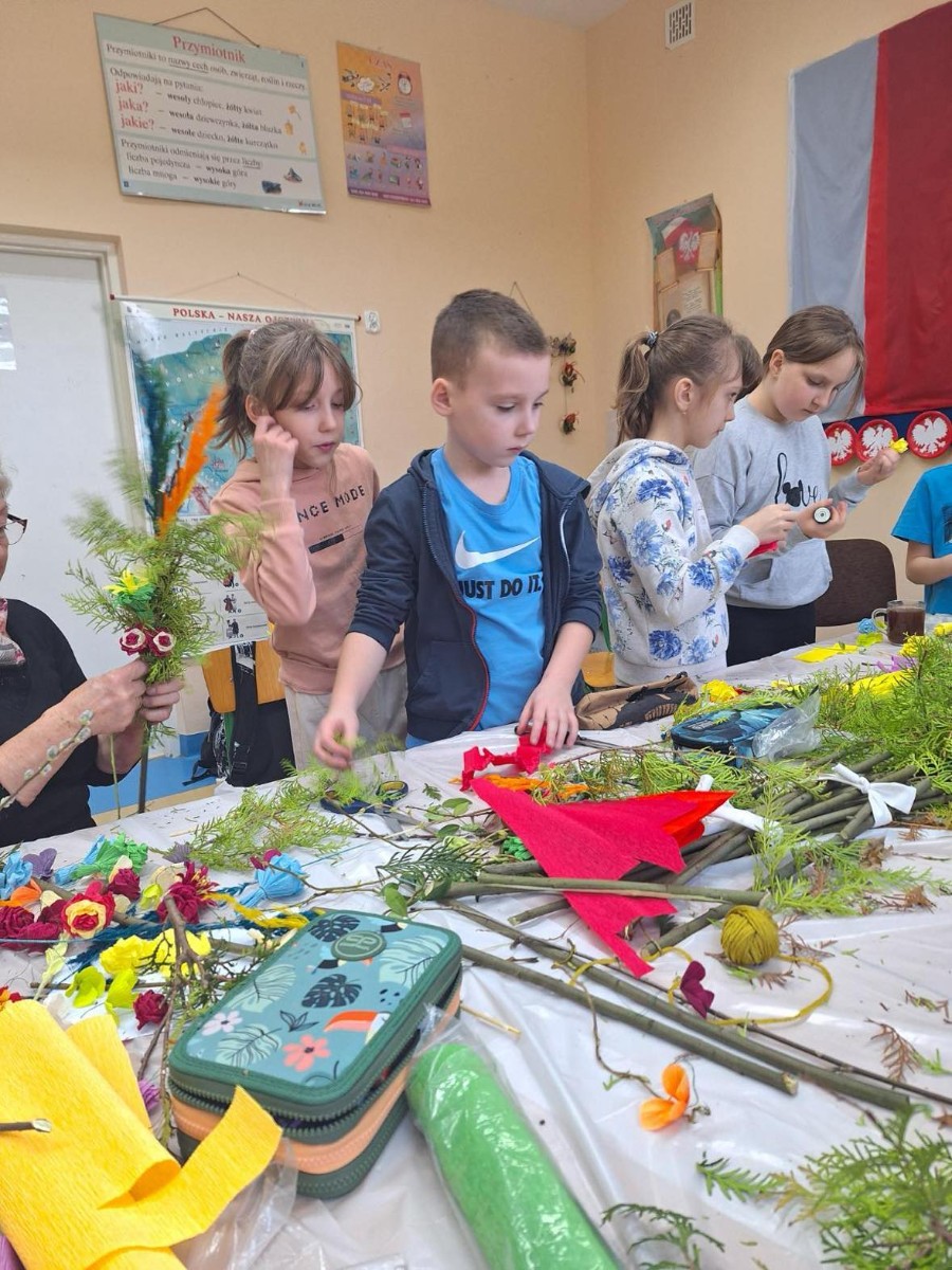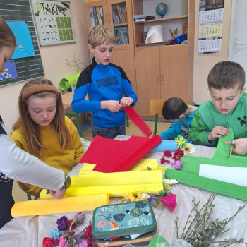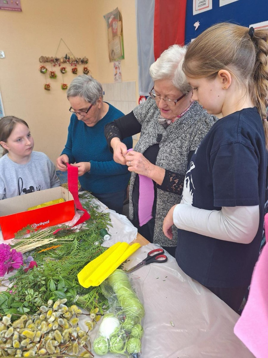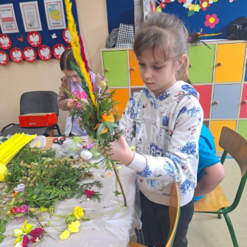 Panie zaprezentowały różne sposoby wykonywania kwiatów z bibuły, którymi ozdabia się palmy wielkanocne. Podczas zajęć panowała miła, serdeczna atmosfera. Celem zajęć było przybliżenie tradycji Świąt Wielkanocnych oraz rozwój kreatywności, sprawności manualnej oraz wrażliwości estetycznej dzieci.