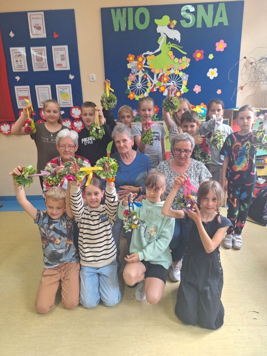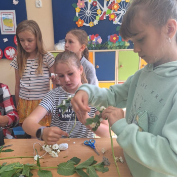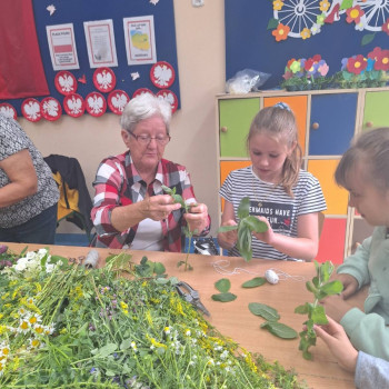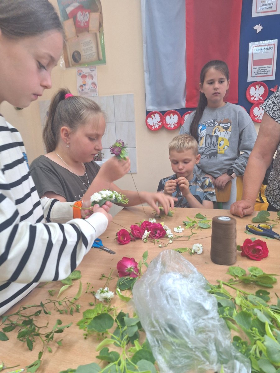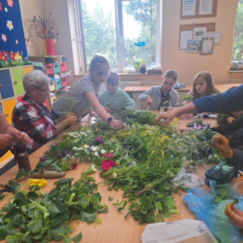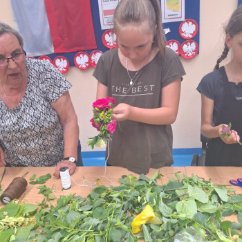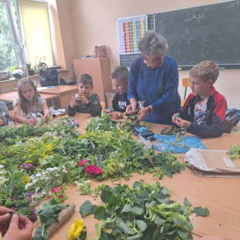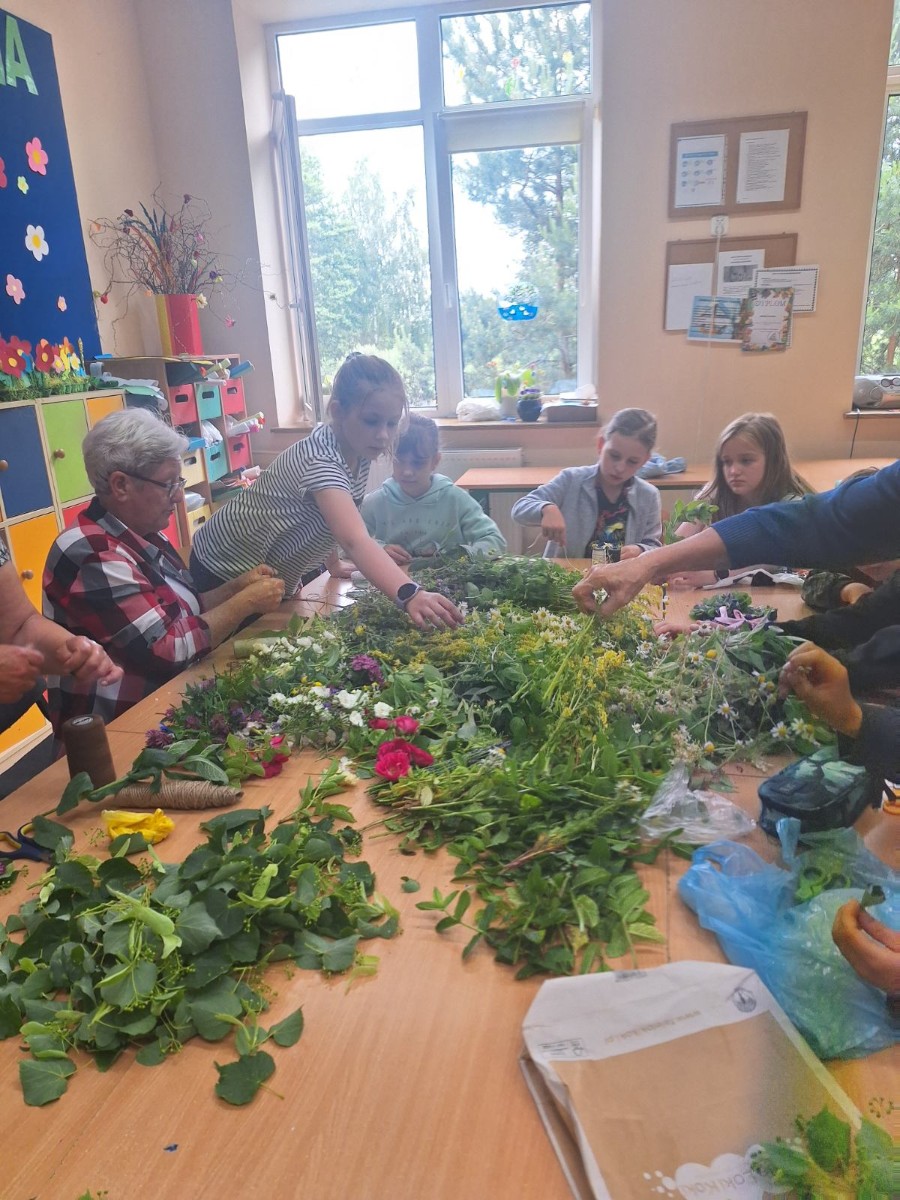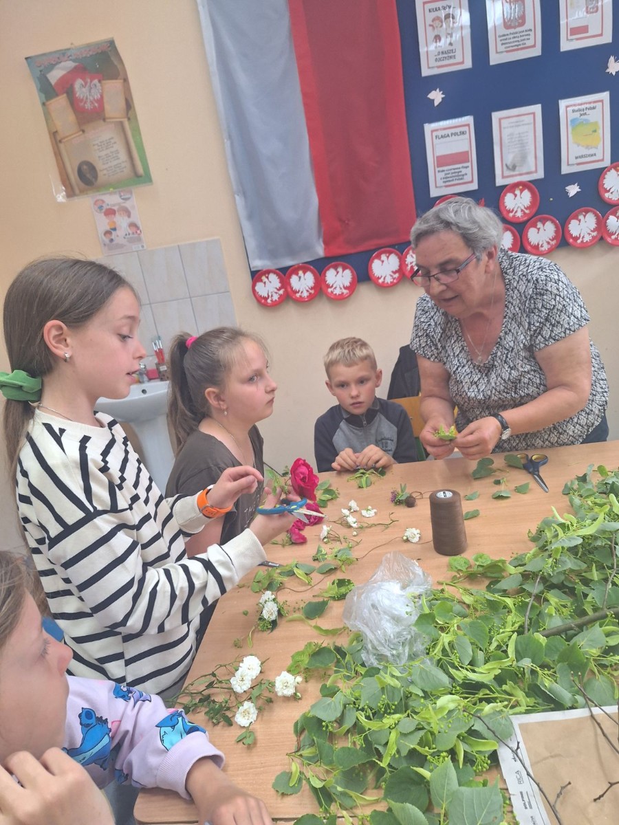 Coraz częściej mówi się o zwyczajach święcenia wianków na zakończenie Oktawy Bożego Ciała,ale mało kto zna jego znaczenie i symbolikę.Przed czym chroni poświęcony wianek i z jakich roślin powinien być wypleciony.Stąd pomysł na warsztaty wicia wianuszków, które odbyły się w ramach projektu,,Tradycje i zwyczaje ziemi mazowieckiej'' 03 czerwca bieżącego roku w naszej szkole pod bacznym okiem Pań z Koła Gospodyń Wiejskich z Augustówki.Uczniowie klasy trzeciej poznali zwyczaj tworzenia wianków oraz nauczyli się ich wyplatania.Barwne kompozycje zostaną poświęcone na zakończenie oktawy Bożego Ciała.
