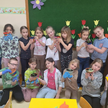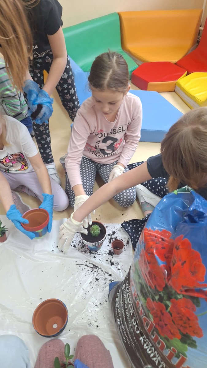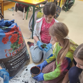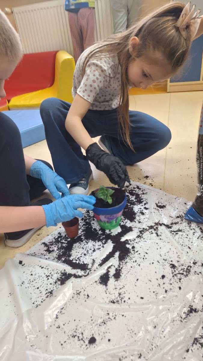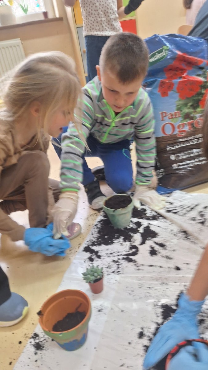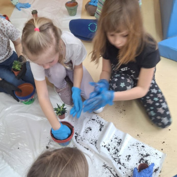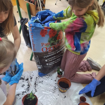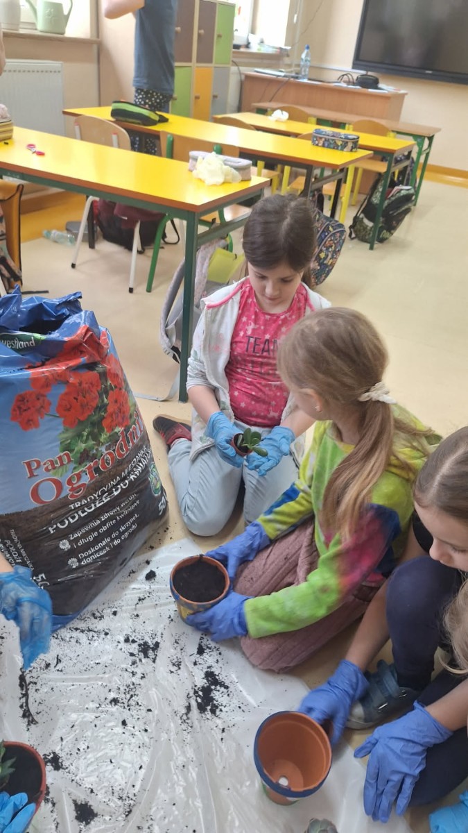 Wiosenne sadzenie kwiatów doniczkowych w klasie 1.