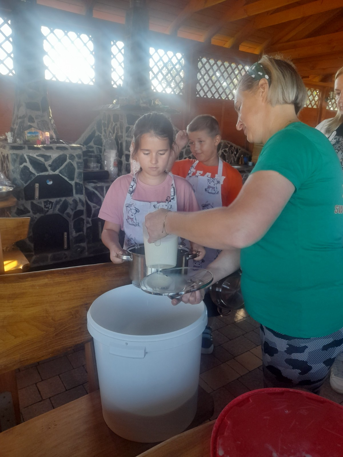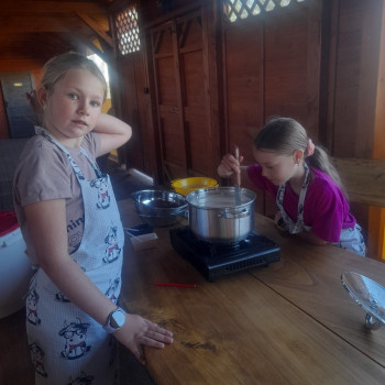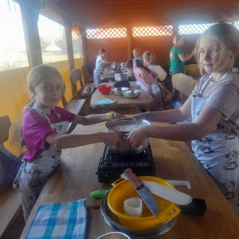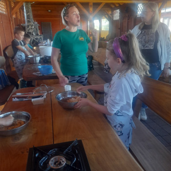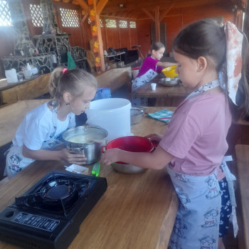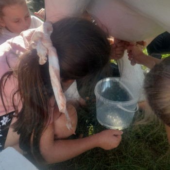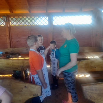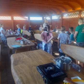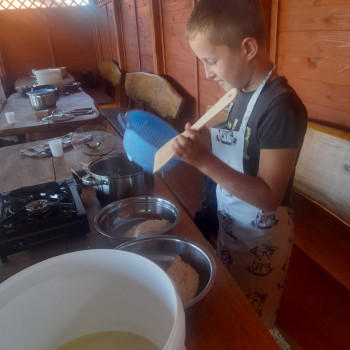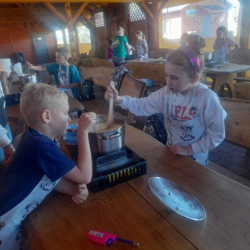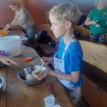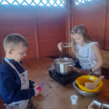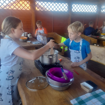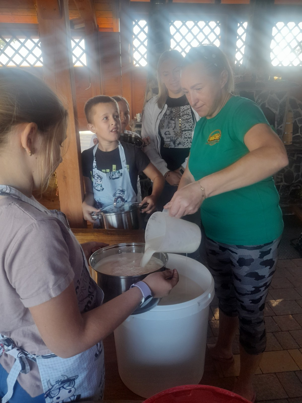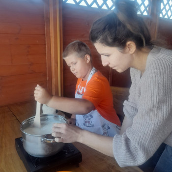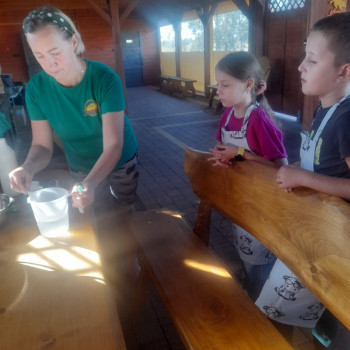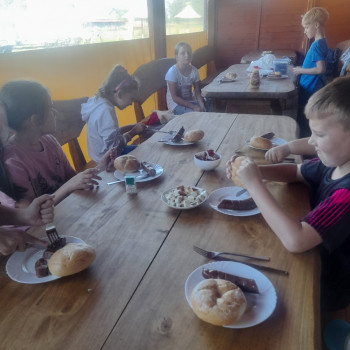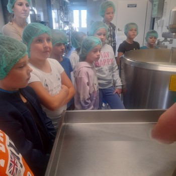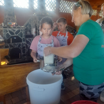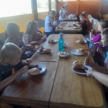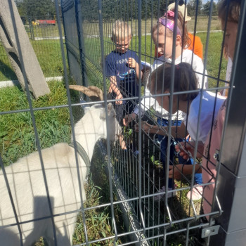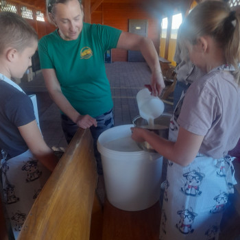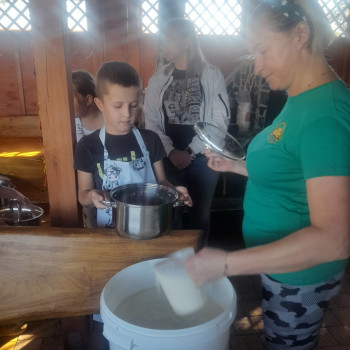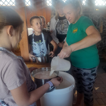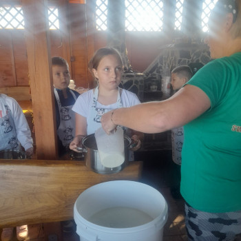 Uczniowie wraz z opiekunami zwiedzali malowniczo położone gospodarstwo agroturystyczne, które zamieszkuje wiele zwierząt. Gospodyni opowiedziała dzieciom o zwierzętach, o ich zwyczajach żywieniowych oraz rytuałach dnia codziennego. Po wyczerpujących wędrówkach dzieci brały udział w warsztatach serowarskich. Poznali proces produkcji sera krok po kroku. Sami też odkryli smak świeżego sera, zrobionego ręcznie w domowej kuchni. Każdy z uczestników mógł spróbować swoich sił w serowarstwie. Kończąc wycieczkę samodzielnie dzieci upiekły sobie kiełbaski na grilu.