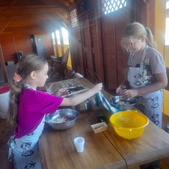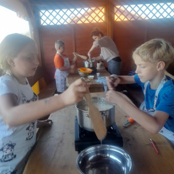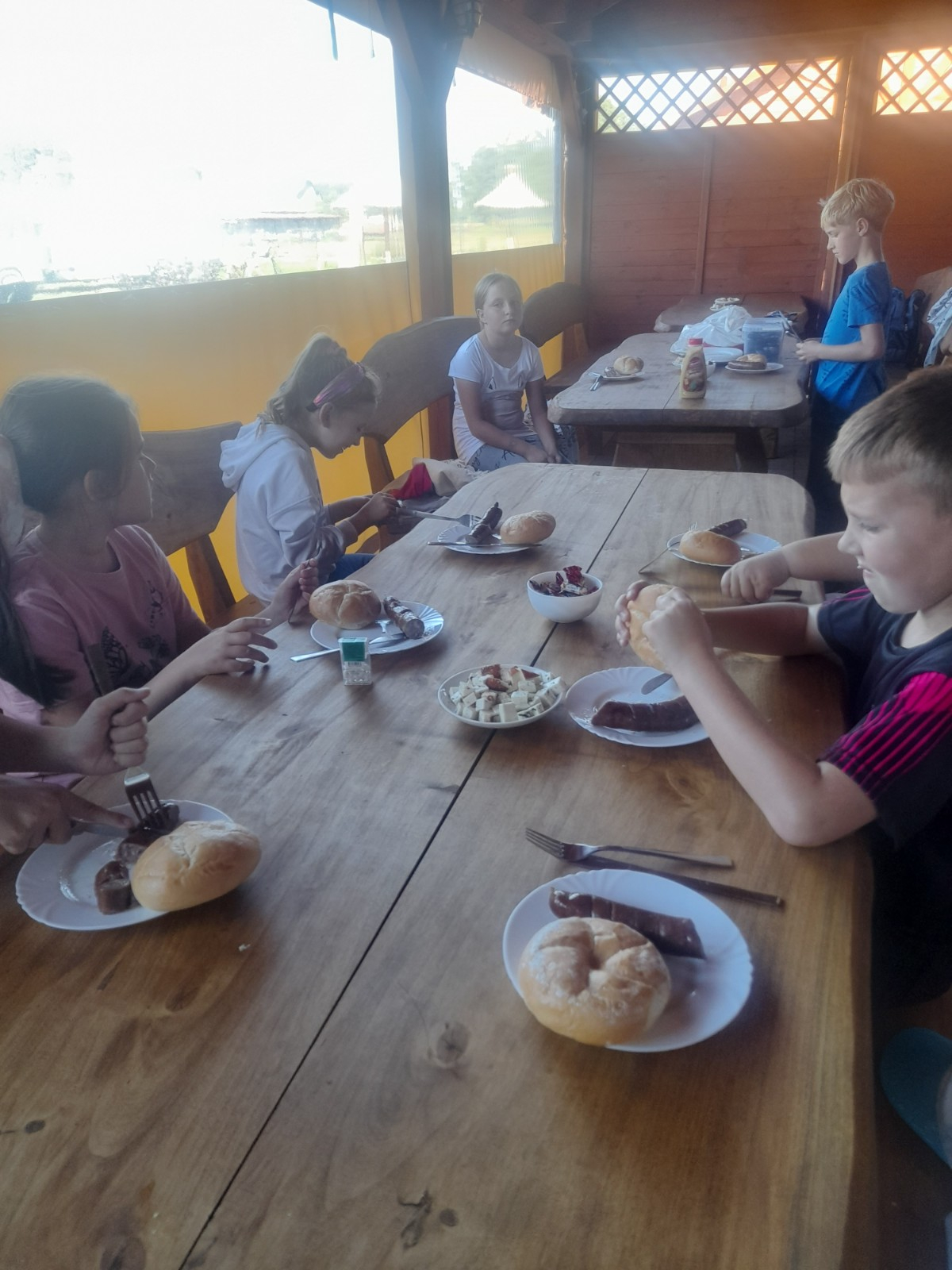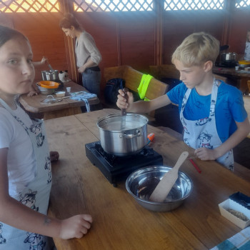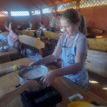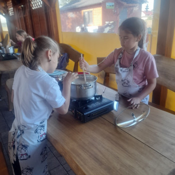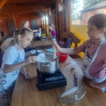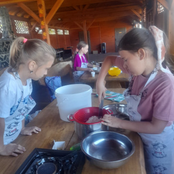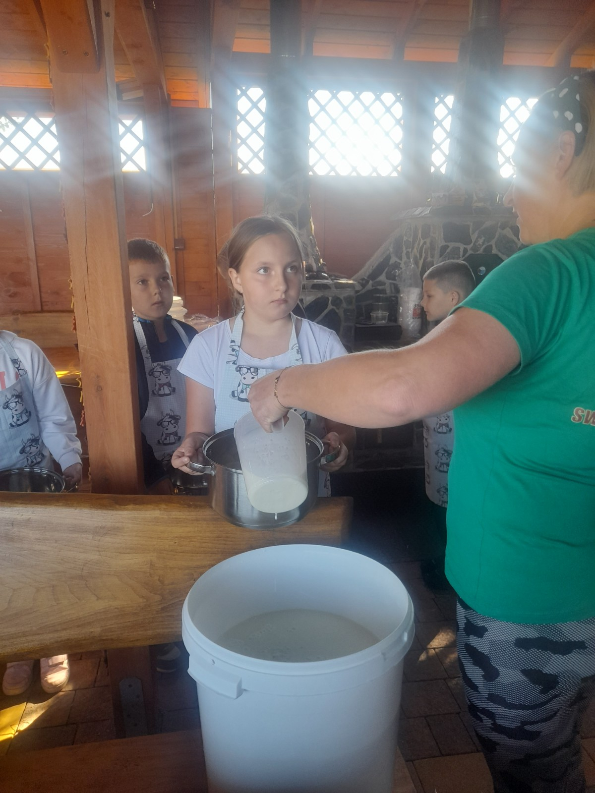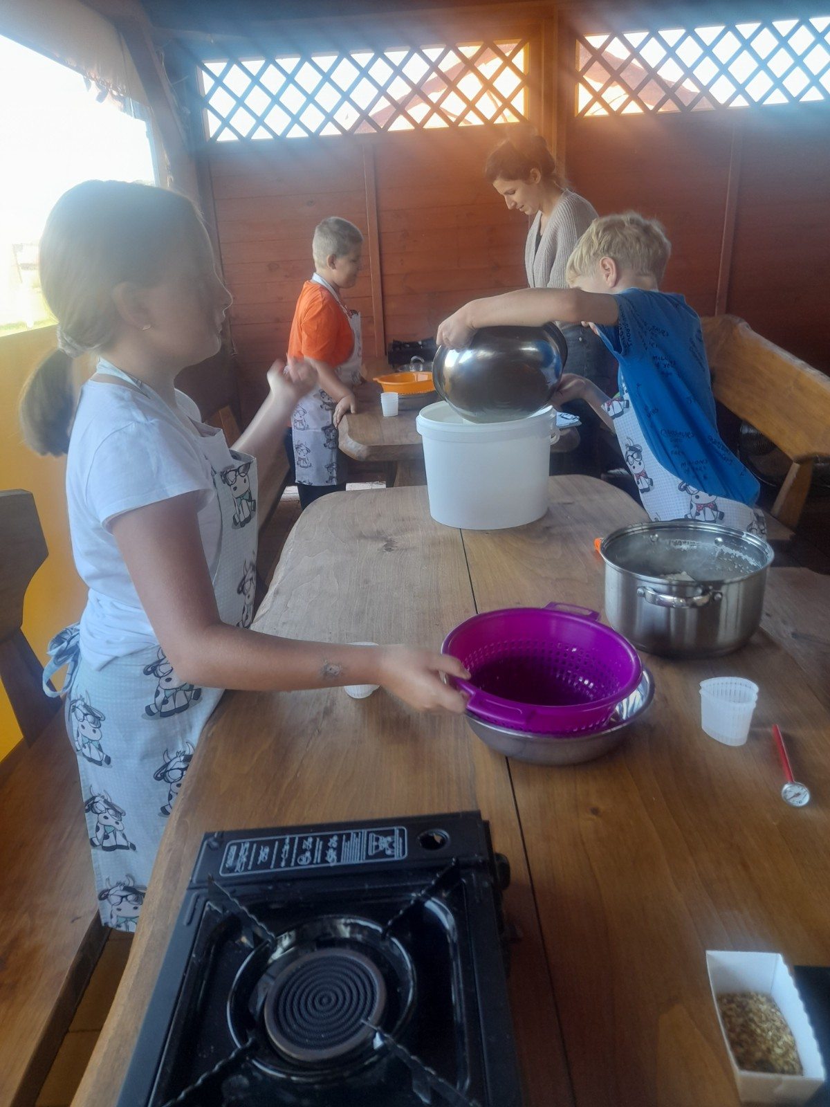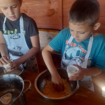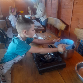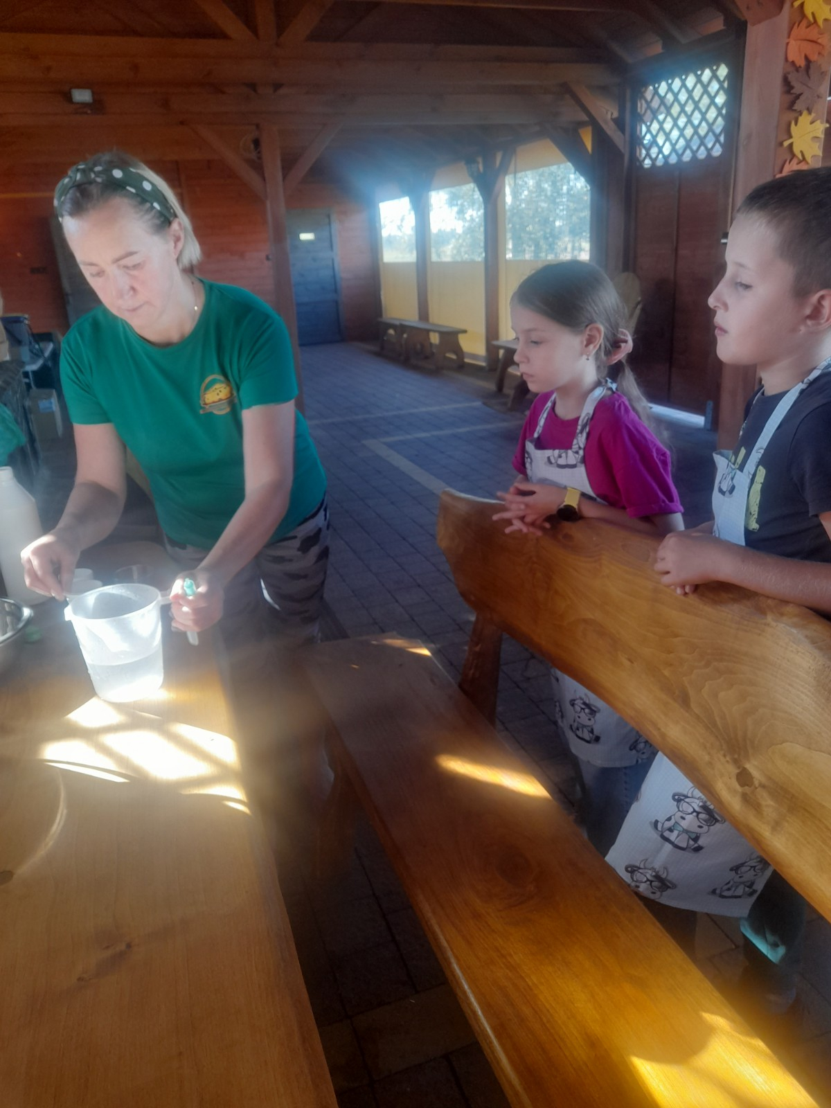 Uczniowie wraz z opiekunami zwiedzali malowniczo położone gospodarstwo agroturystyczne, które zamieszkuje wiele zwierząt. Gospodyni opowiedziała dzieciom o zwierzętach, o ich zwyczajach żywieniowych oraz rytuałach dnia codziennego. Po wyczerpujących wędrówkach dzieci brały udział w warsztatach serowarskich. Poznali proces produkcji sera krok po kroku. Sami też odkryli smak świeżego sera, zrobionego ręcznie w domowej kuchni. Każdy z uczestników mógł spróbować swoich sił w serowarstwie. Kończąc wycieczkę samodzielnie dzieci upiekły sobie kiełbaski na grilu.