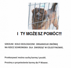 Członkowie Koła Ekologicznego serdecznie zapraszają do przyłączenia się do zbiórki karmy dla psów ze schroniska w Celestynowie.