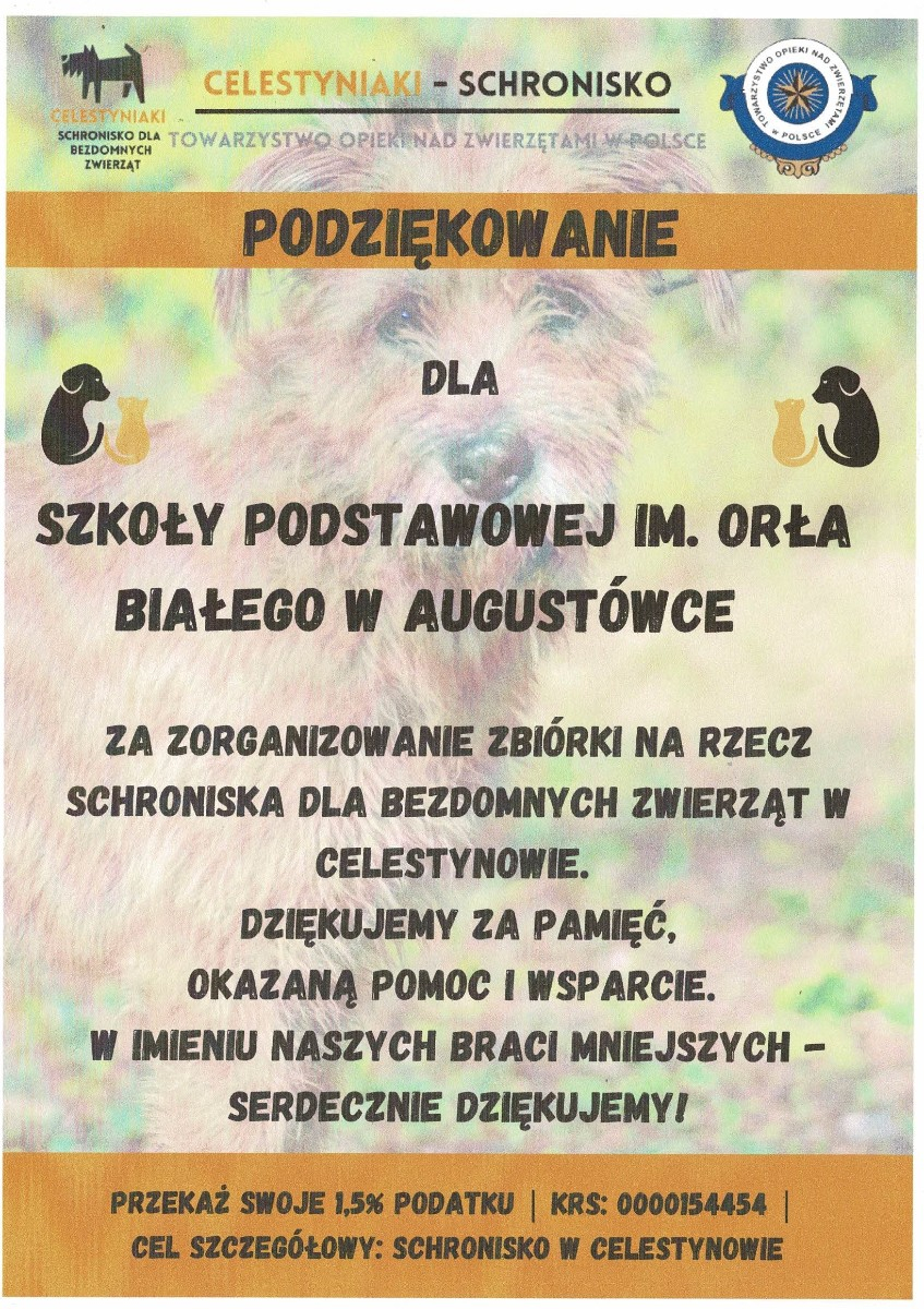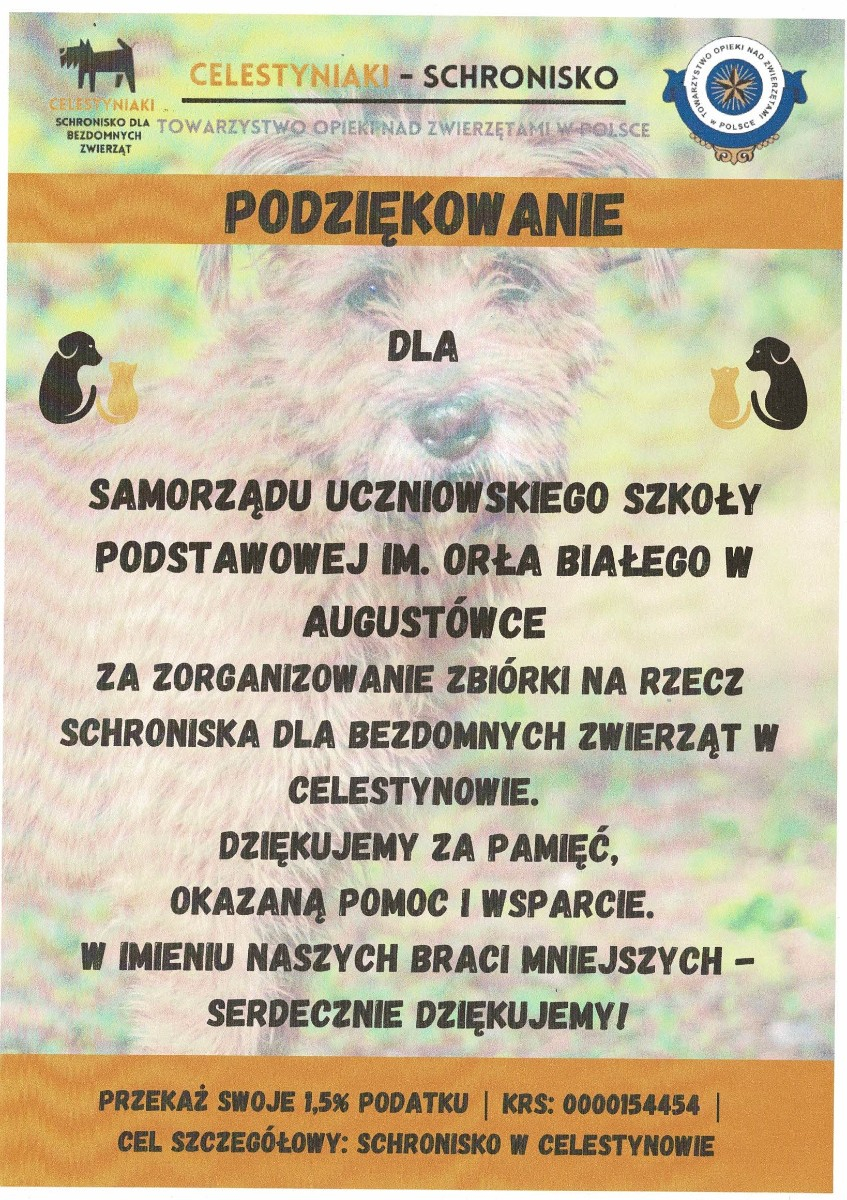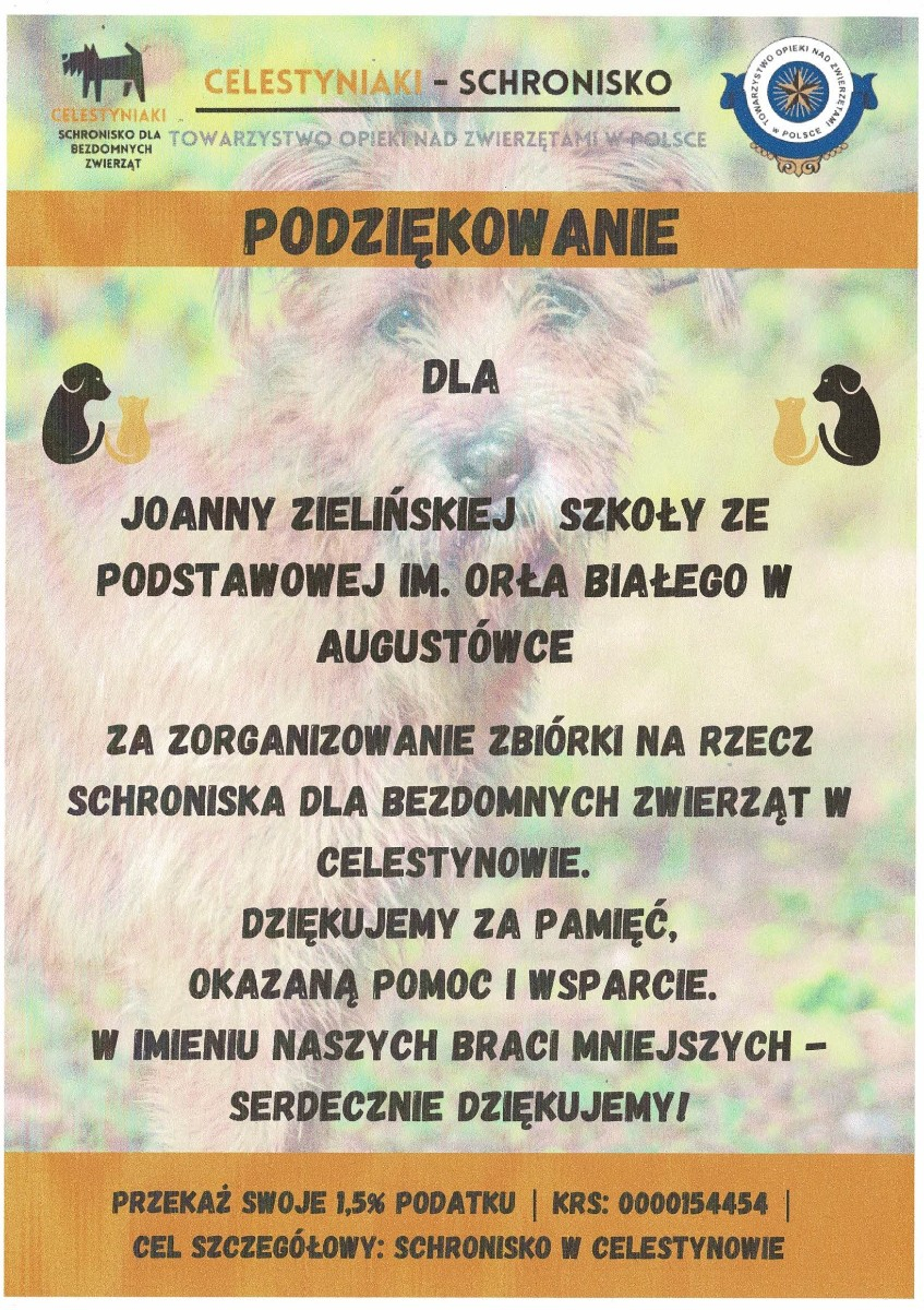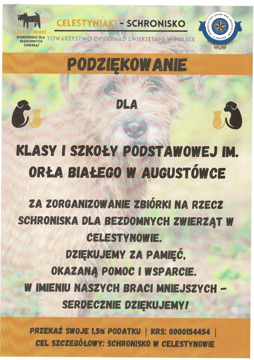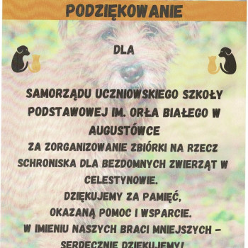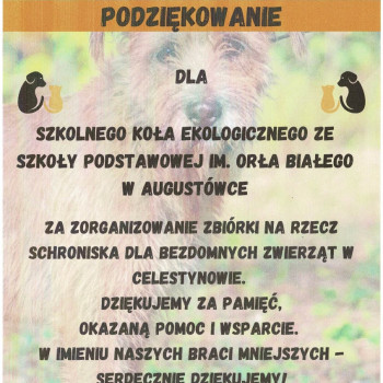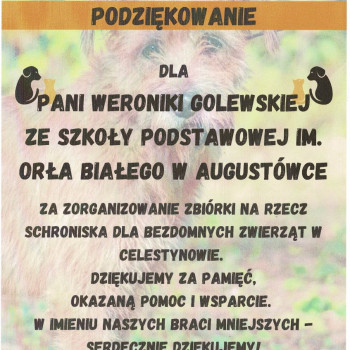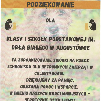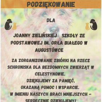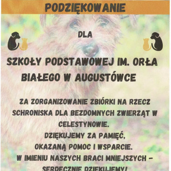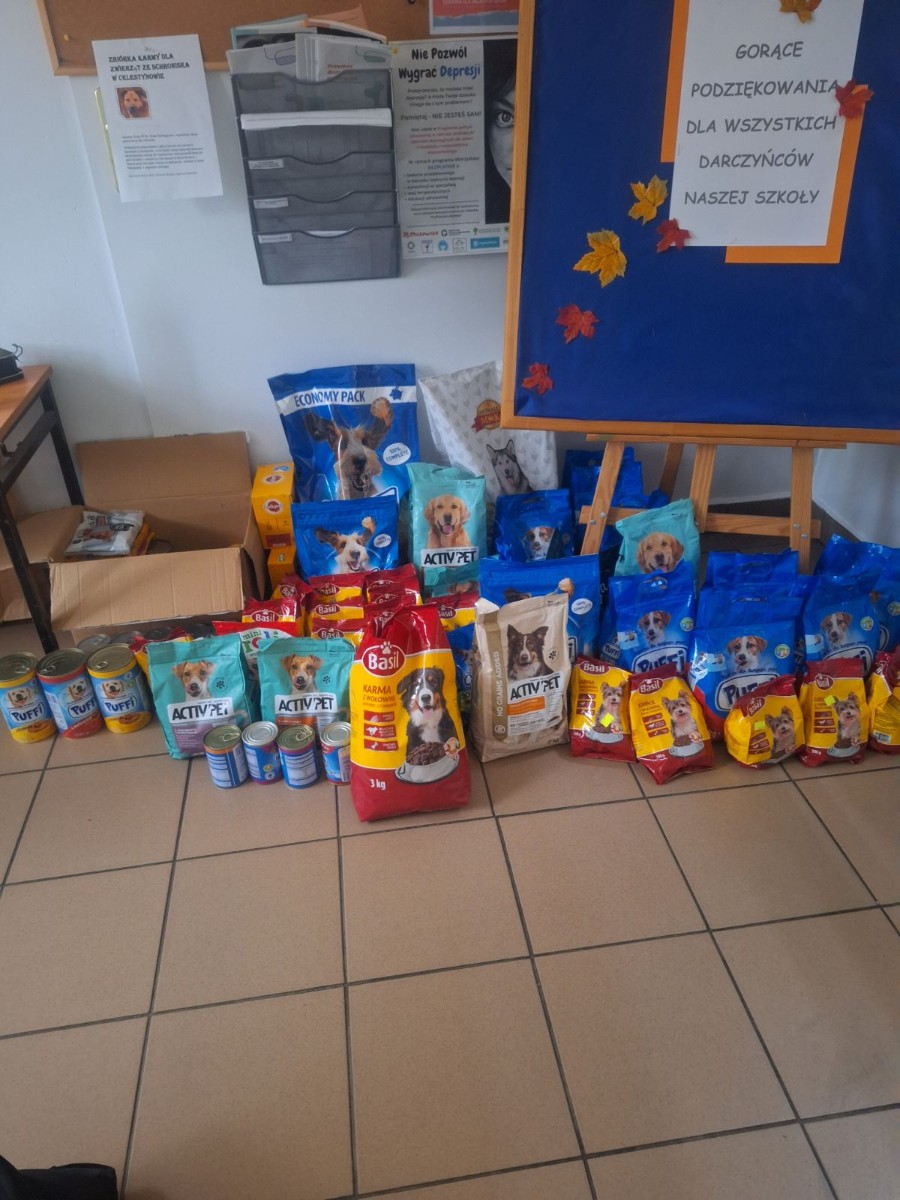 W naszej szkole zorganizowana została zbiórka karmy dla bezdomnych zwierząt w Celestynowie.Celem tego przedsięwzięcia była poprawa standardu pobytu zwierząt w schronisku,kształtowanie postawy przyjaciela zwierząt oraz wdrażanie dzieci i osób dorosłych do aktywnego udziału w zbiórce karmy.