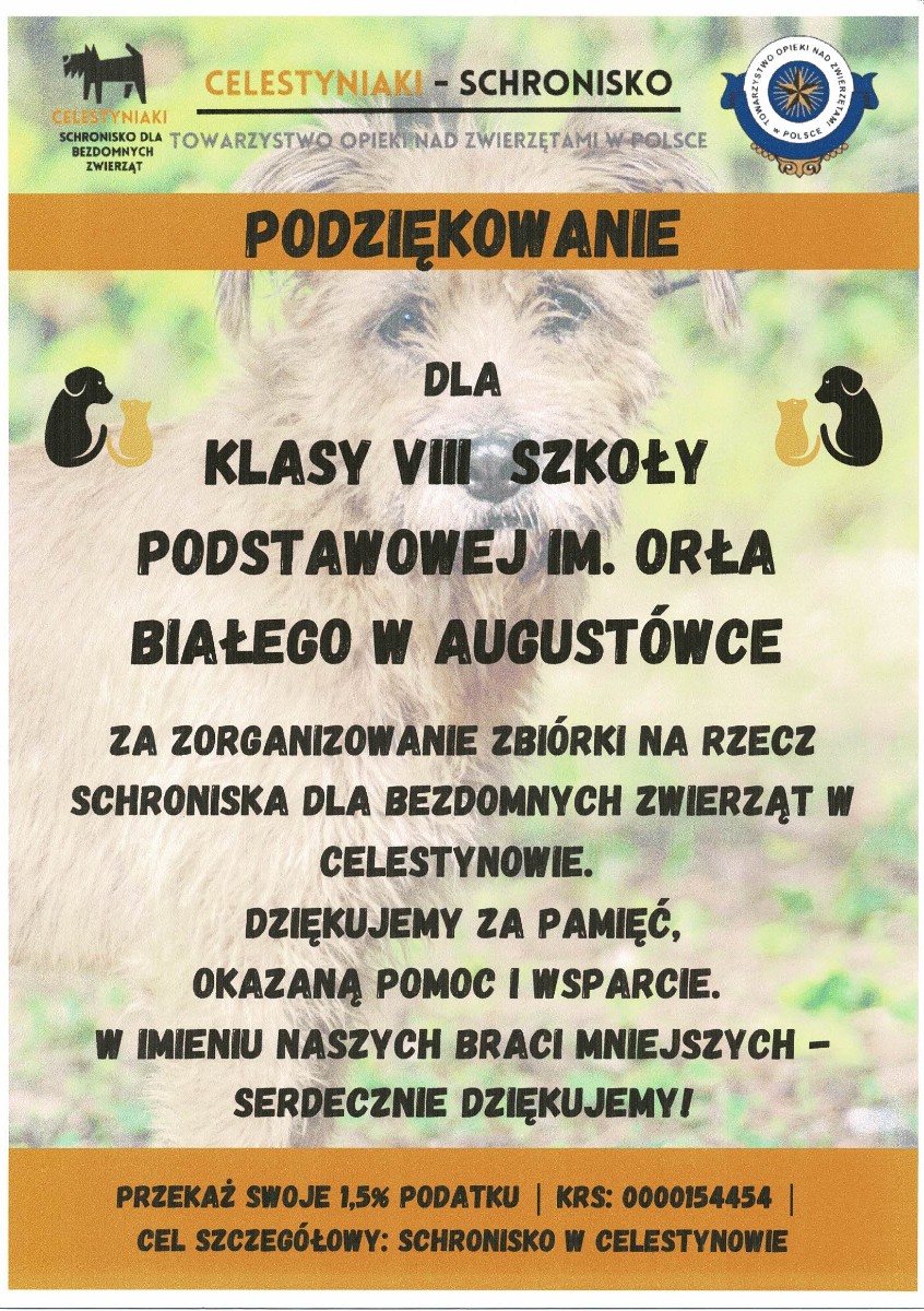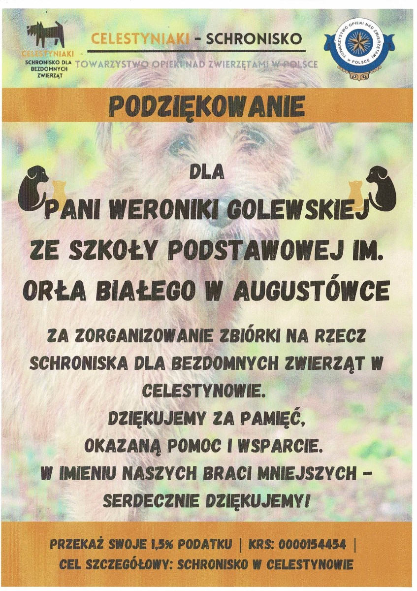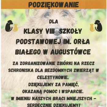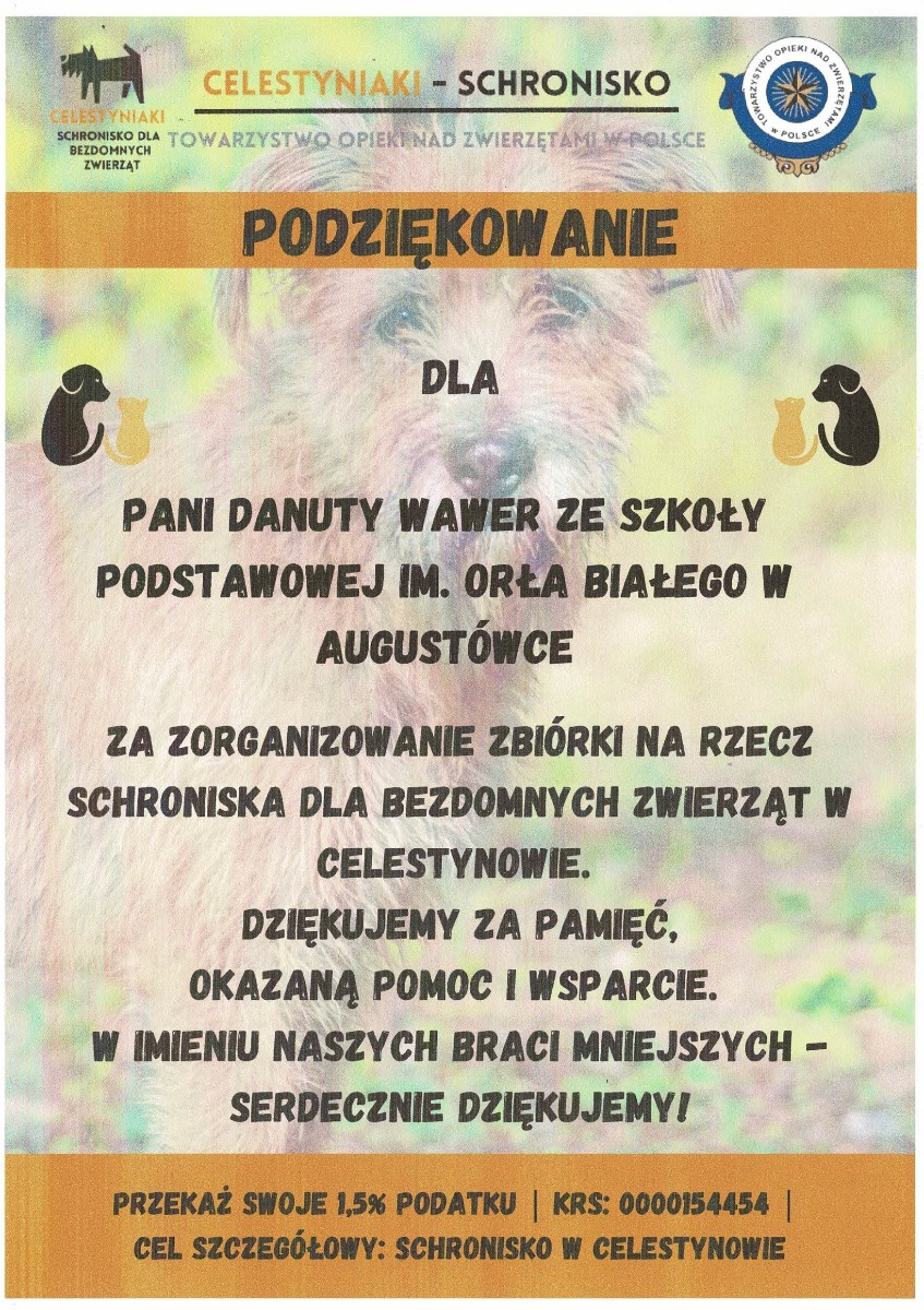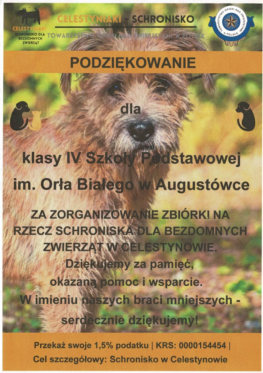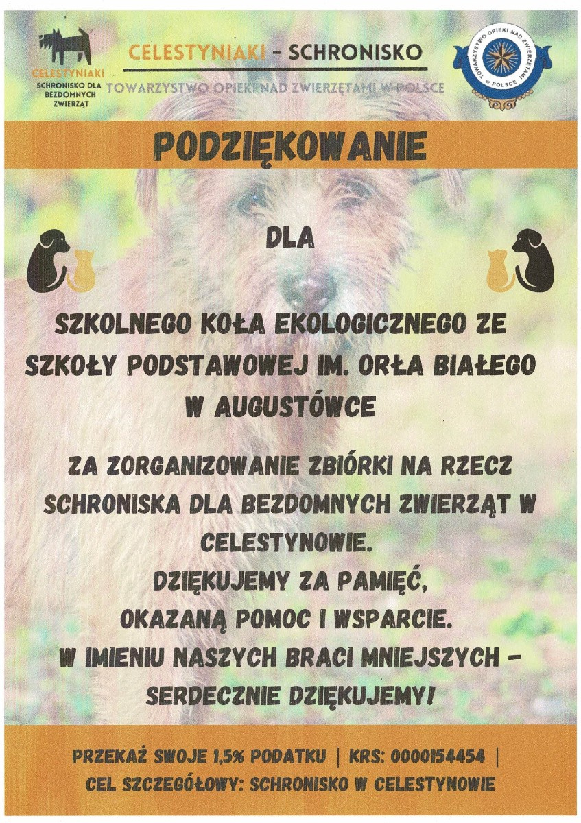 W naszej szkole zorganizowana została zbiórka karmy dla bezdomnych zwierząt w Celestynowie.Celem tego przedsięwzięcia była poprawa standardu pobytu zwierząt w schronisku,kształtowanie postawy przyjaciela zwierząt oraz wdrażanie dzieci i osób dorosłych do aktywnego udziału w zbiórce karmy.