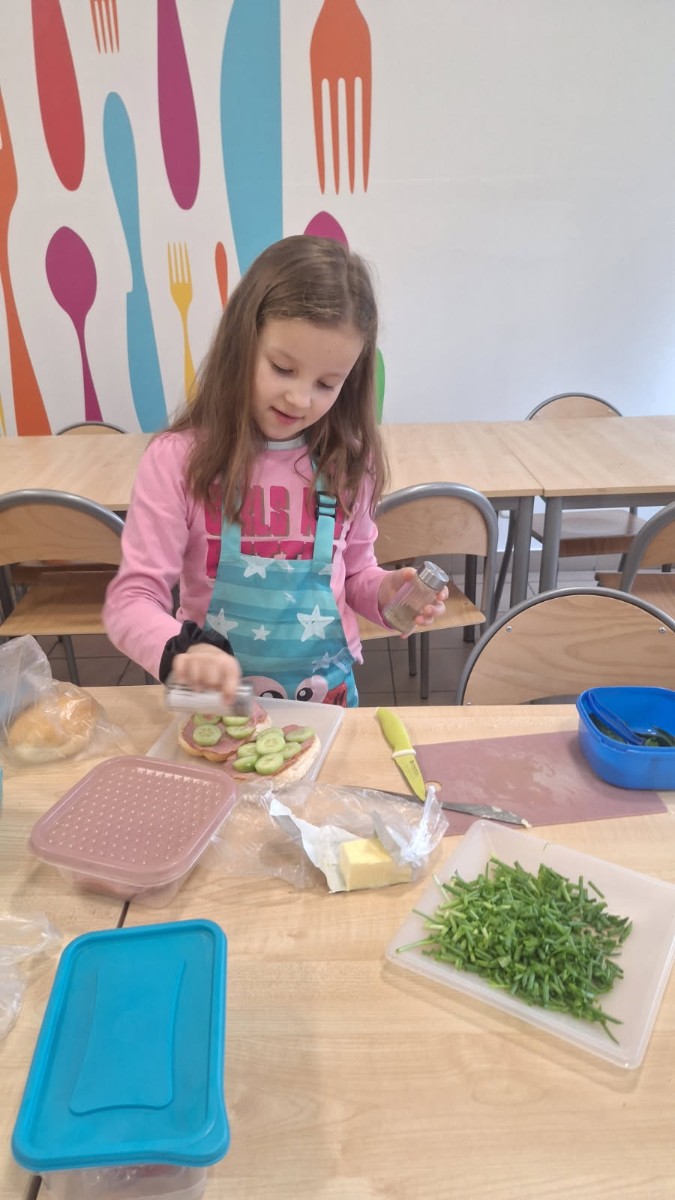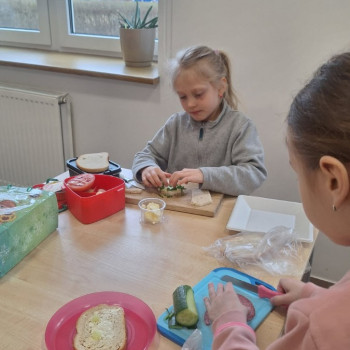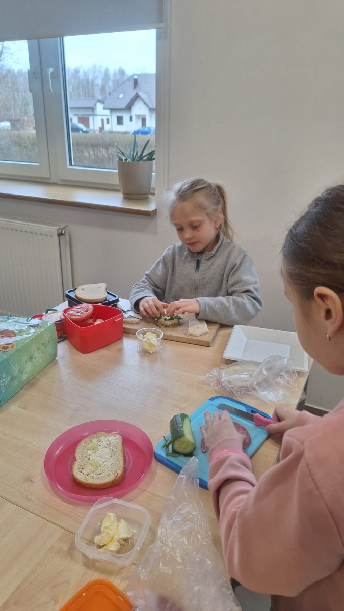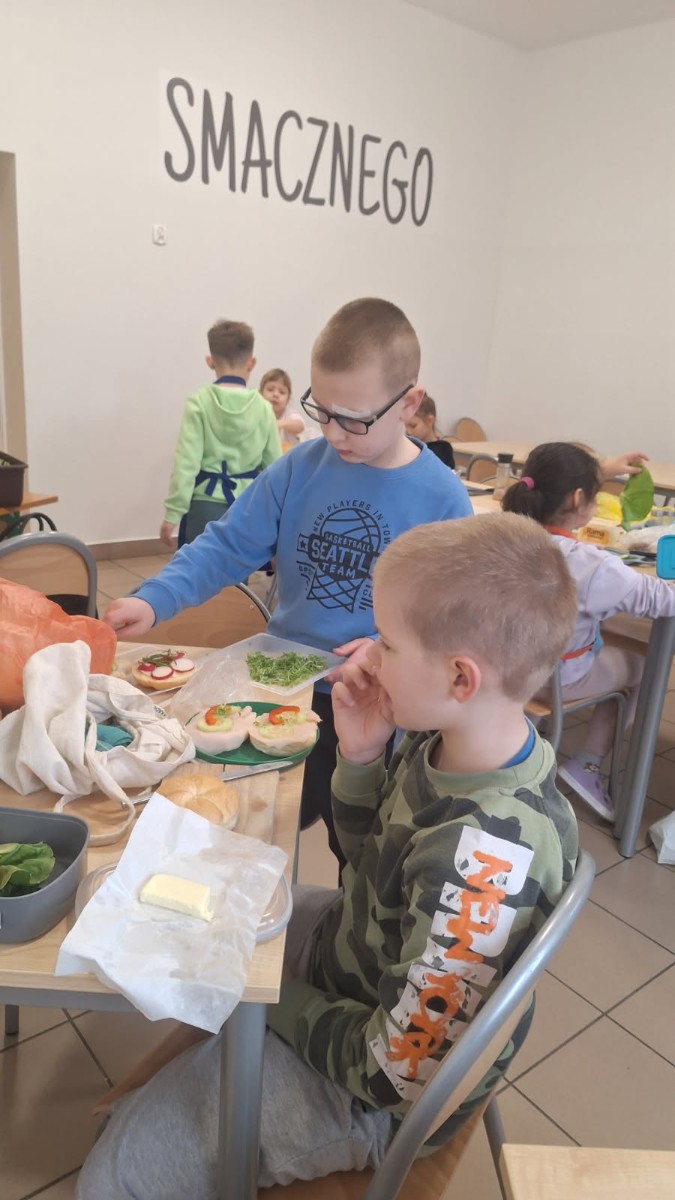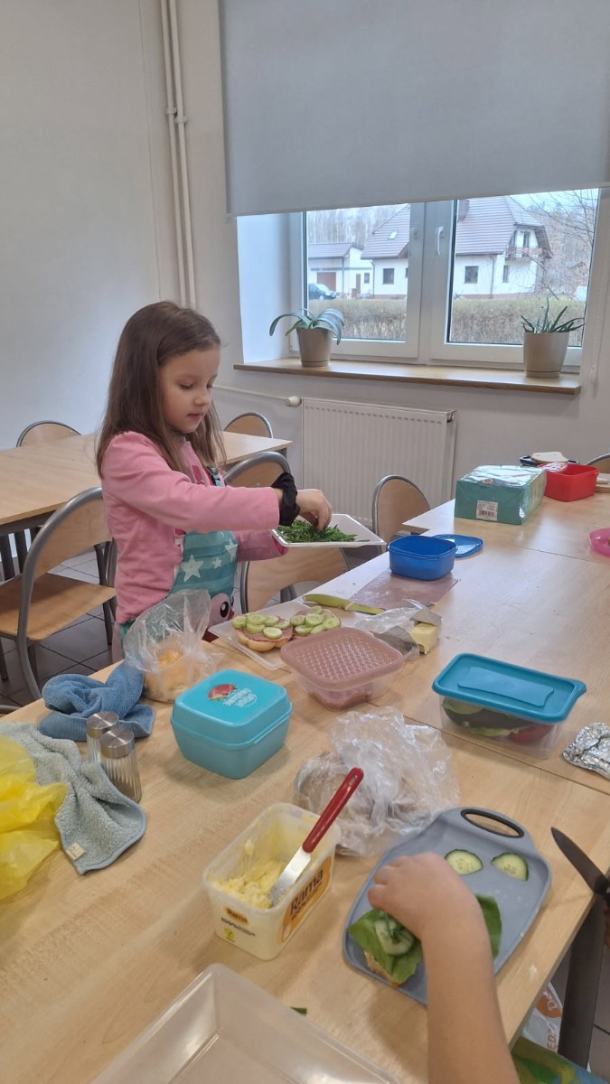 Pierwszaki z Zespołu Szkolno-Przedszkolnego w Augustówce przygotowały zdrowe,kolorowe kanapki.Wszystkie dzieci z zaangażowaniem dobierały składniki, aby każda wykonana kanapka wyglądała wyjątkowo.Na stole nie zabrakło sałaty, pomidorów,ogórków, papryki oraz samodzielnie wyhodowanej rzeżuchy i szczypiorku.Dzięki takim zajęciom dzieci kształciły w sobie odpowiednie nawyki żywieniowe,rozwijały kreatywność,wyobraźnię oraz dbałość o higienę podczas spożywania posiłków.