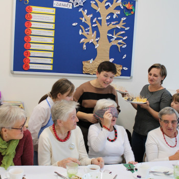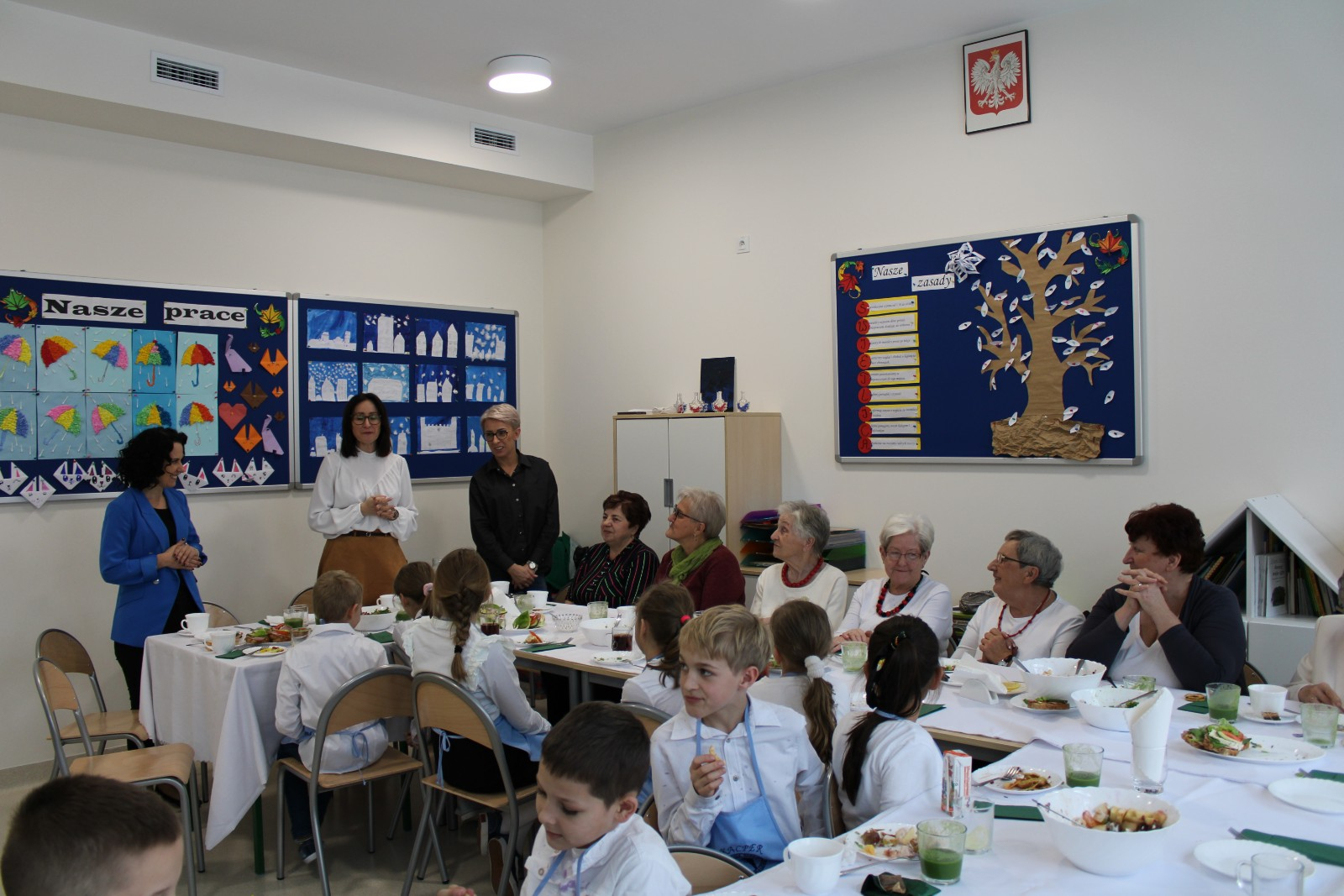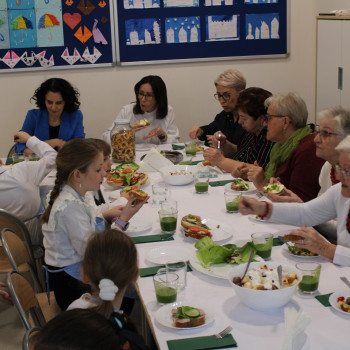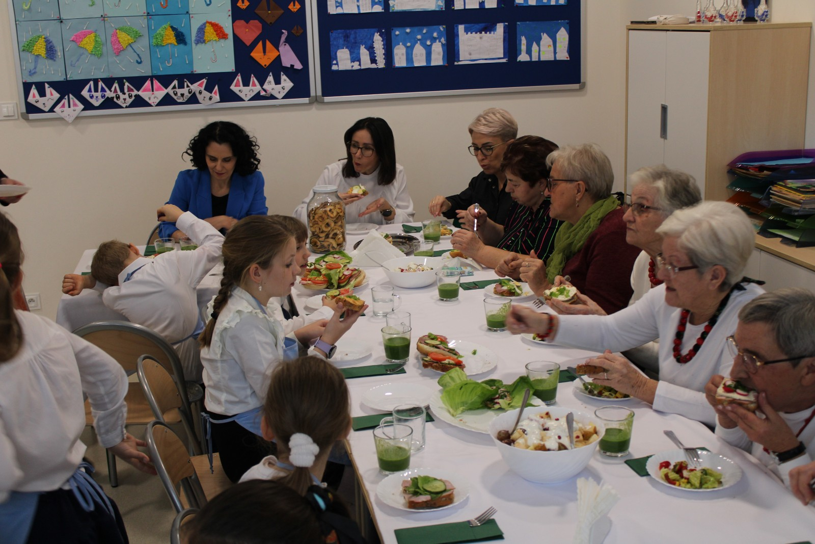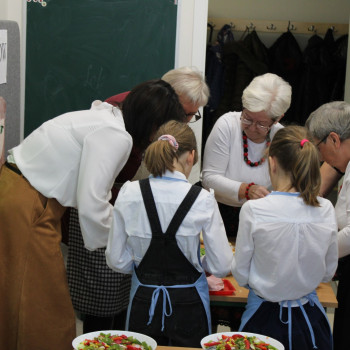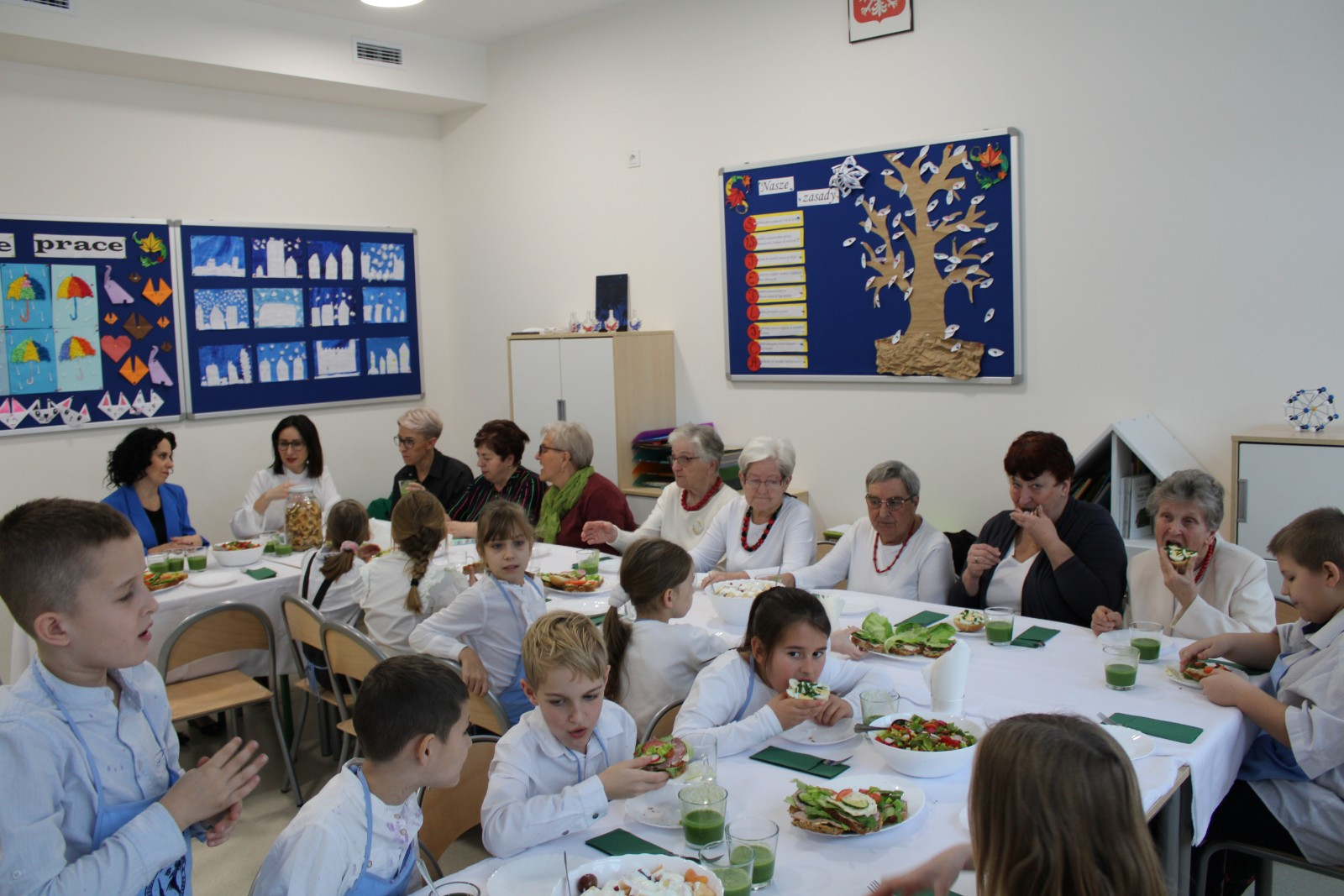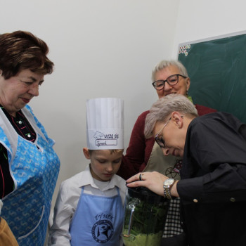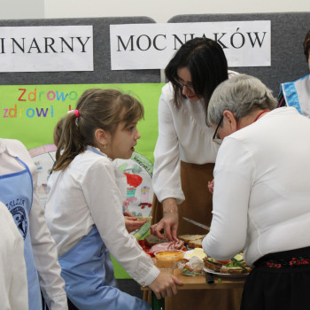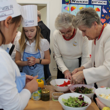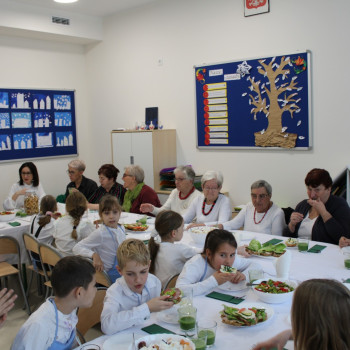 Niesamowicie zaangażowali się w tę akcję rodzice wyrażając aprobatę oraz uznanie do takich działań.To właśnie oni dostarczyli produkty potrzebne do zorganizowania śniadania.Na stole znalazły się zatem:chleb,bułeczki upieczone przez rodziców,masło,jajka,wędliny,warzywa,owoce,herbatka.Dzieci wraz z seniorkami i P Wójt przystąpili w 4 grupach do pracy.Każda grupa przygotowała coś innego:I grupa-kolorowe ,zdrowe kanapki;II grupa-sałatka z brokułem;III grupa sałatka owocowa;IV grupa-smufi.Następnie dzieci wraz z paniami prezentowały swoje dzieła.Zapach roznosił się po całej szkole.Później wszyscy uśmiechnięci i zadowoleni przystąpili do wspólnego spożywania przygotowanego przez siebie śniadania.Takie śniadanie było dla wszystkich prawdziwą frajdą.Na twarzach promieniały uśmiech i zachwyt.Była to niezapomniana przygoda edukacyjna na temat zdrowego odżywiania,a także zachęta do tego ,aby w ten sposób spędzić czas z osobami starszymi.