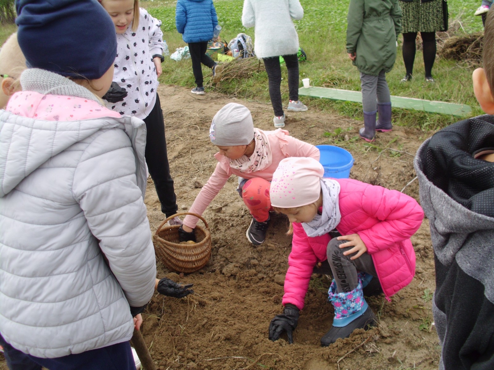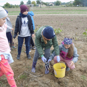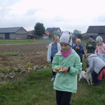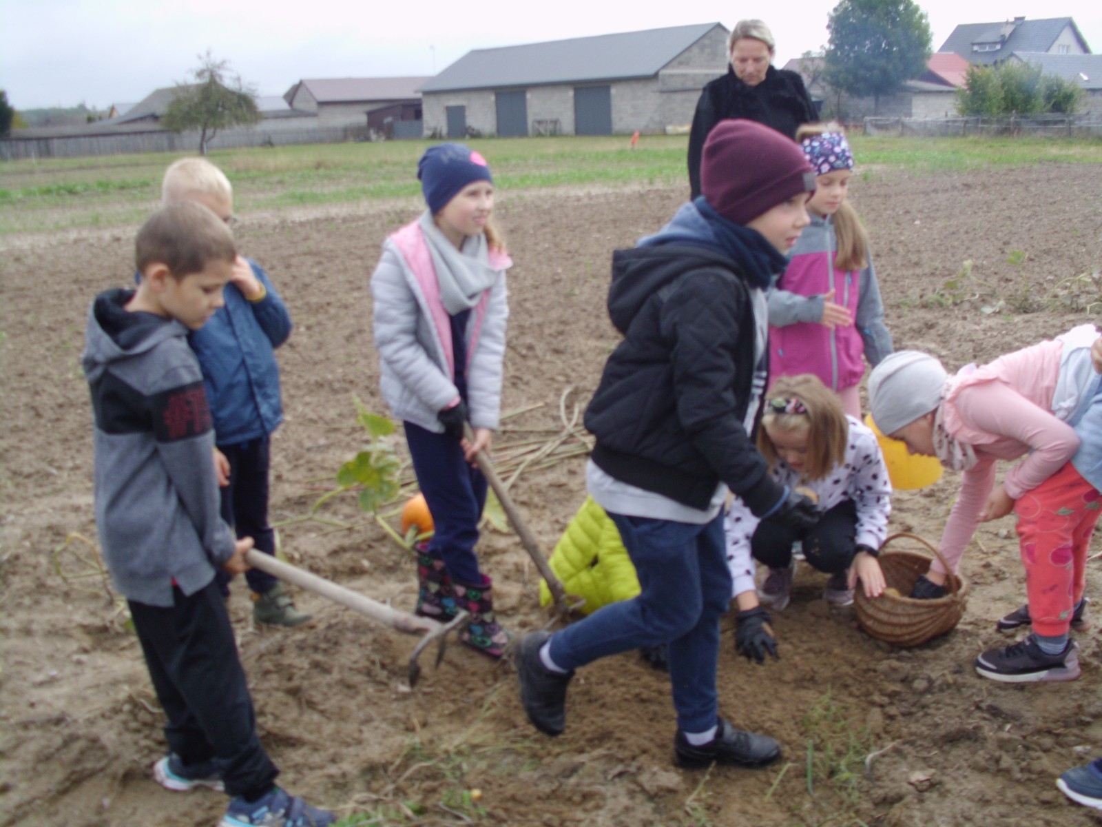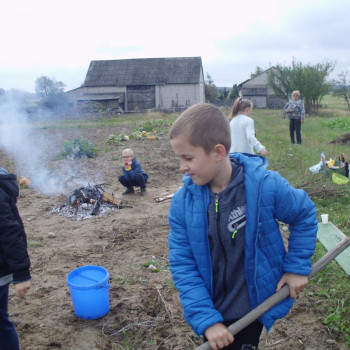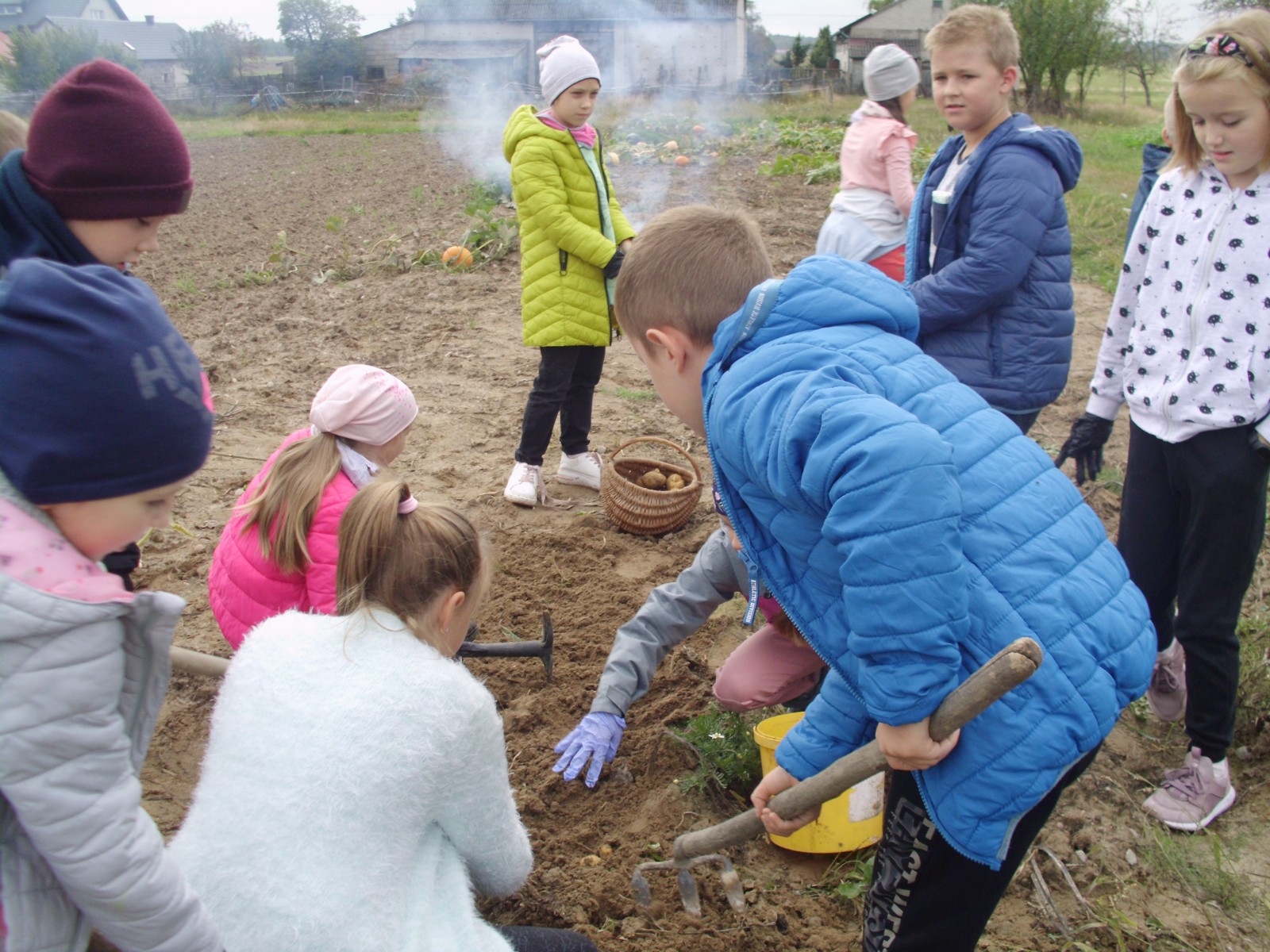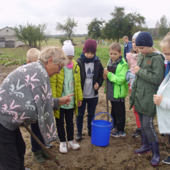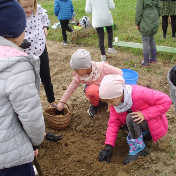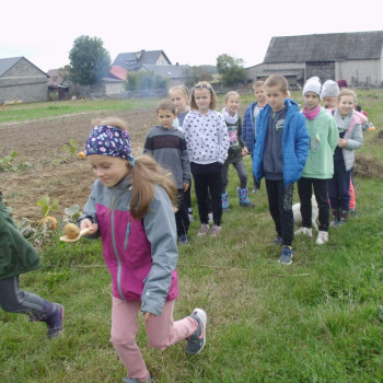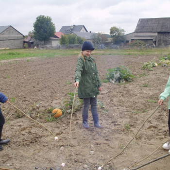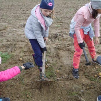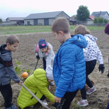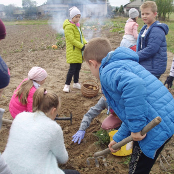 Wspólną zabawę rozpoczelismy od wykopków ziemniaka. Za pomocą motyki i pod okiem pani Możdżonek uczniowie wykopali ziemniaki.