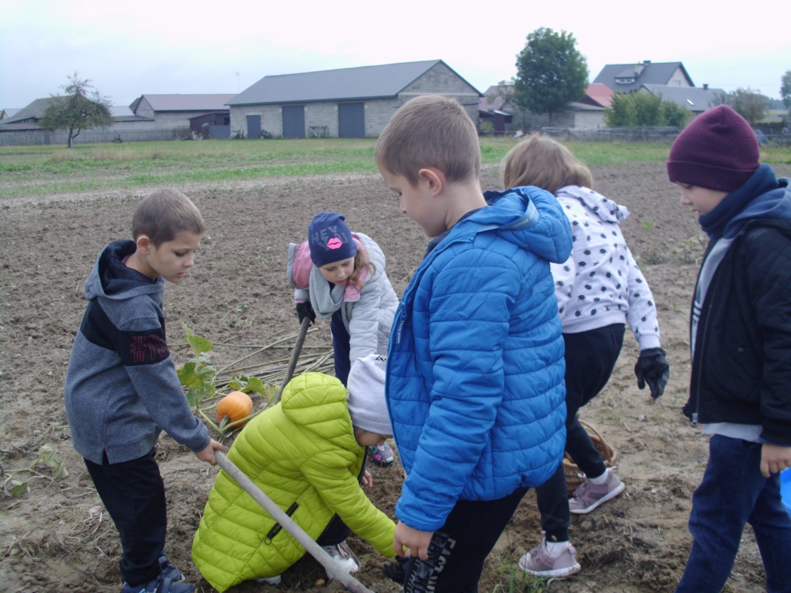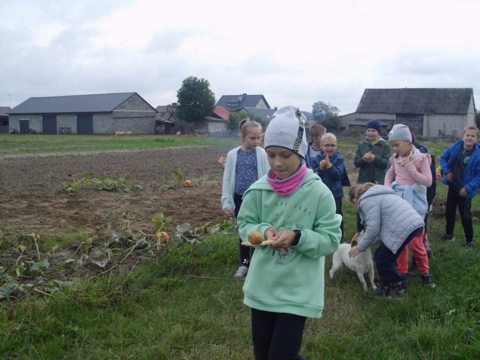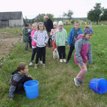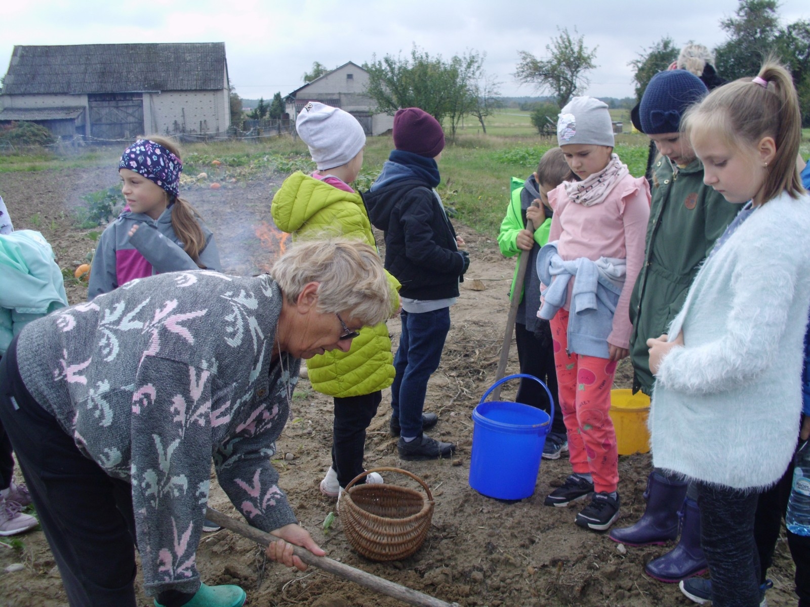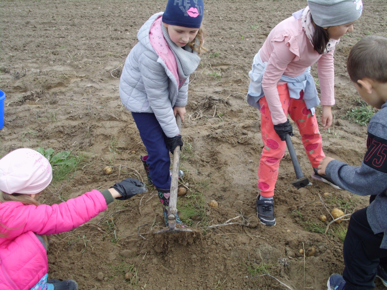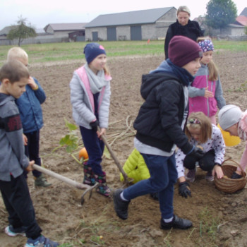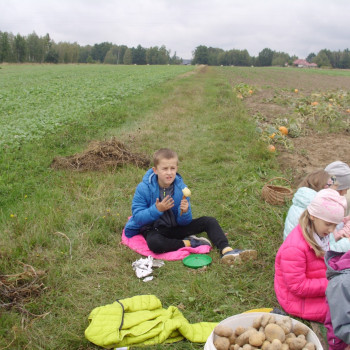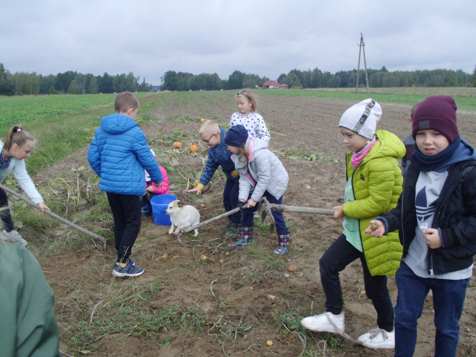Wspólną zabawę rozpoczelismy od wykopków ziemniaka. Za pomocą motyki i pod okiem pani Możdżonek uczniowie wykopali ziemniaki.