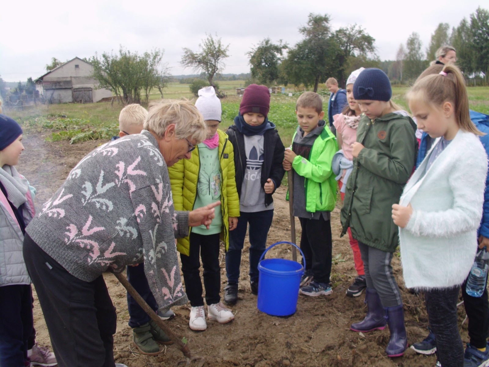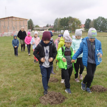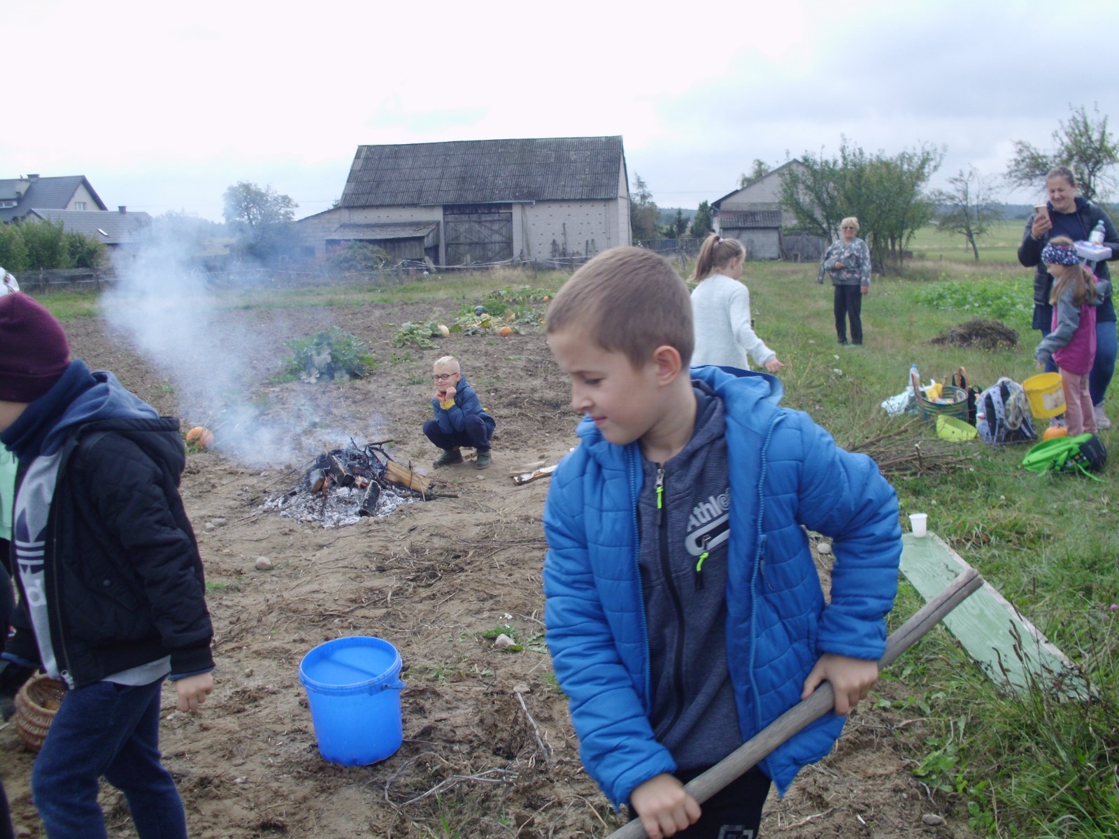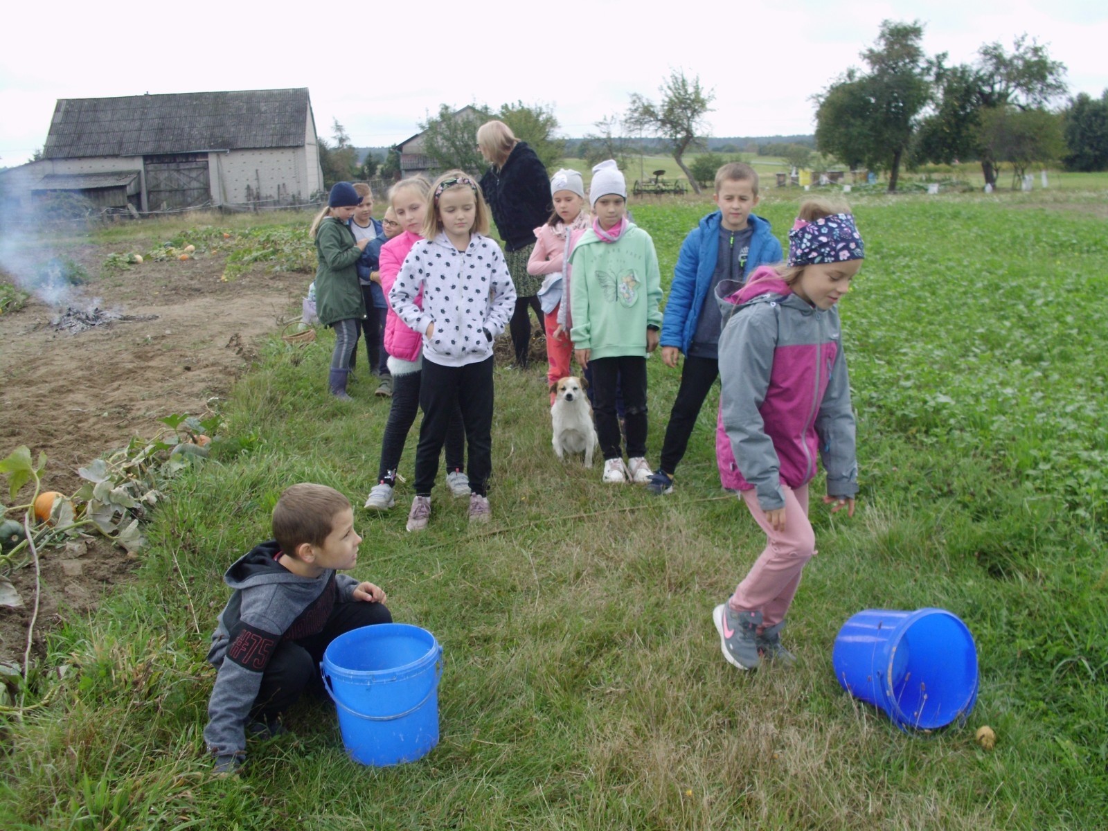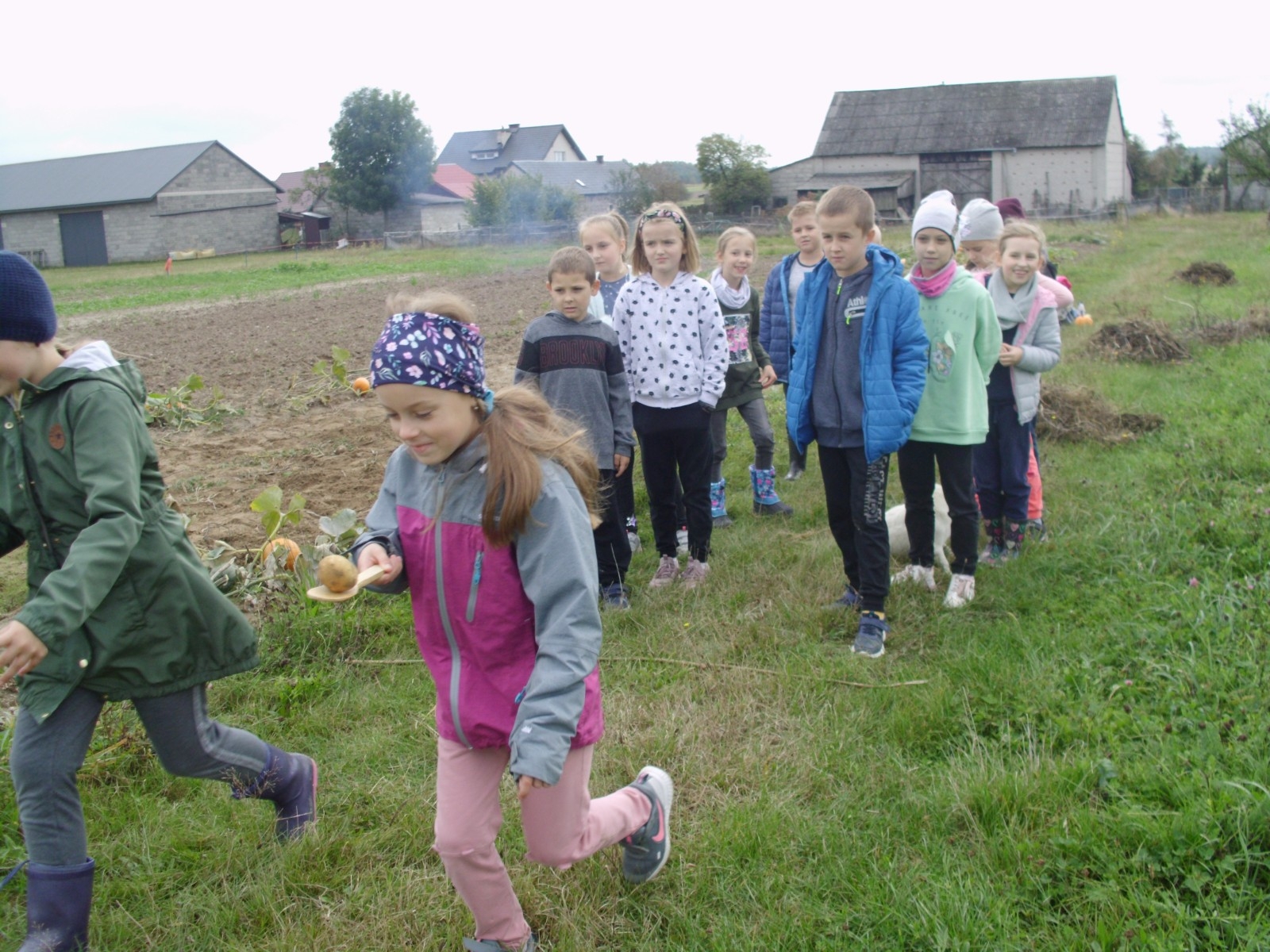 Wspólną zabawę rozpoczelismy od wykopków ziemniaka. Za pomocą motyki i pod okiem pani Możdżonek uczniowie wykopali ziemniaki.