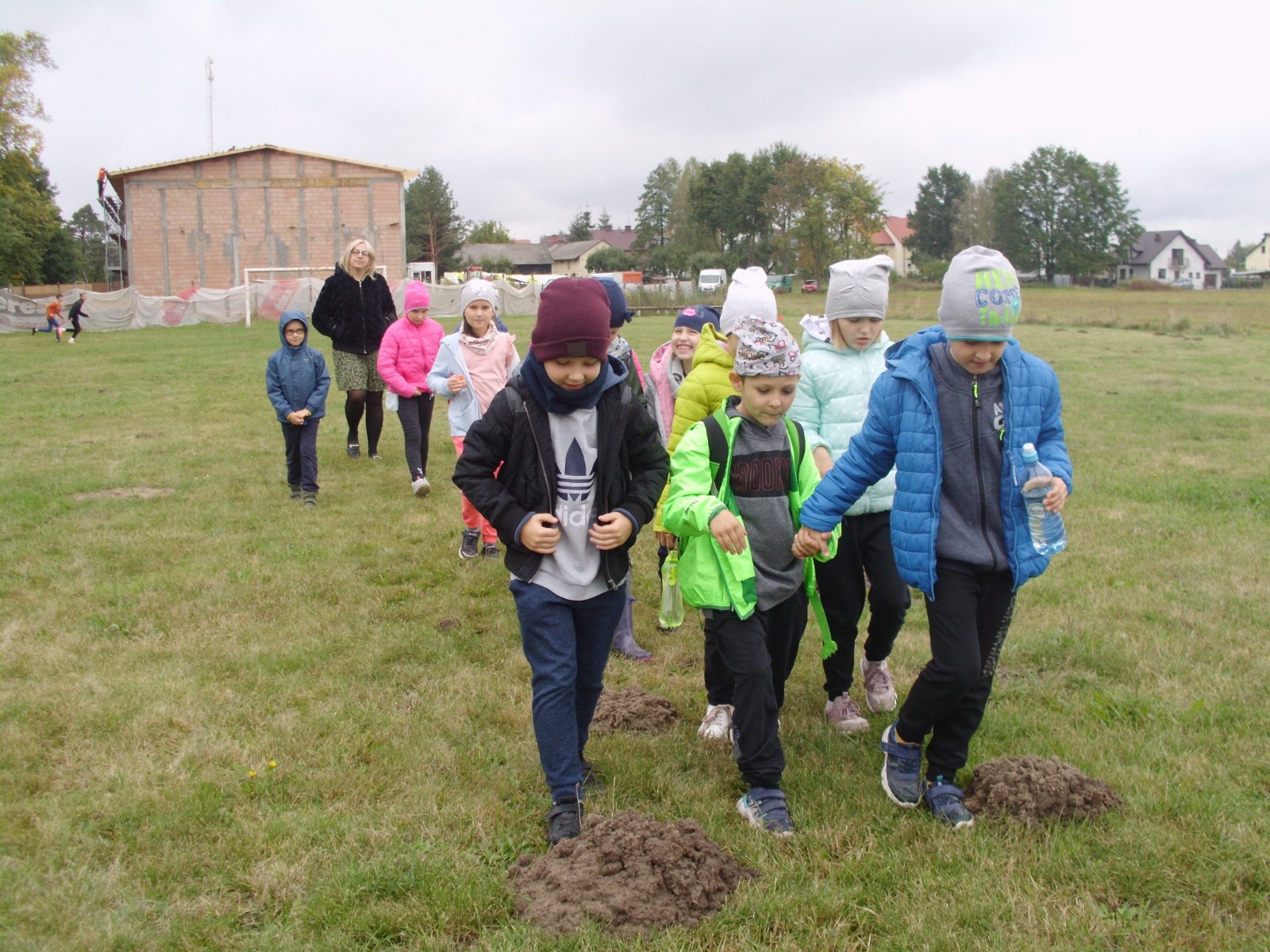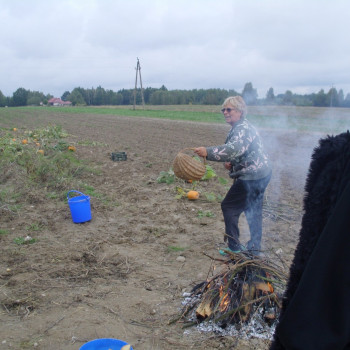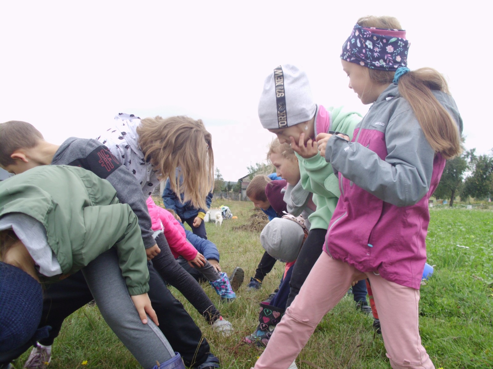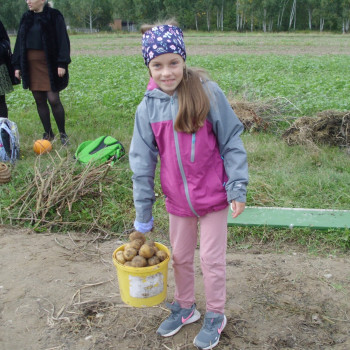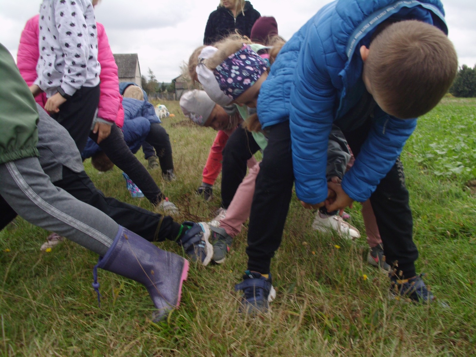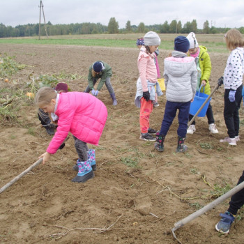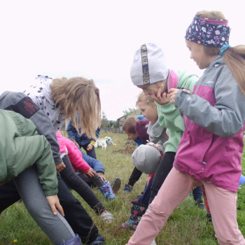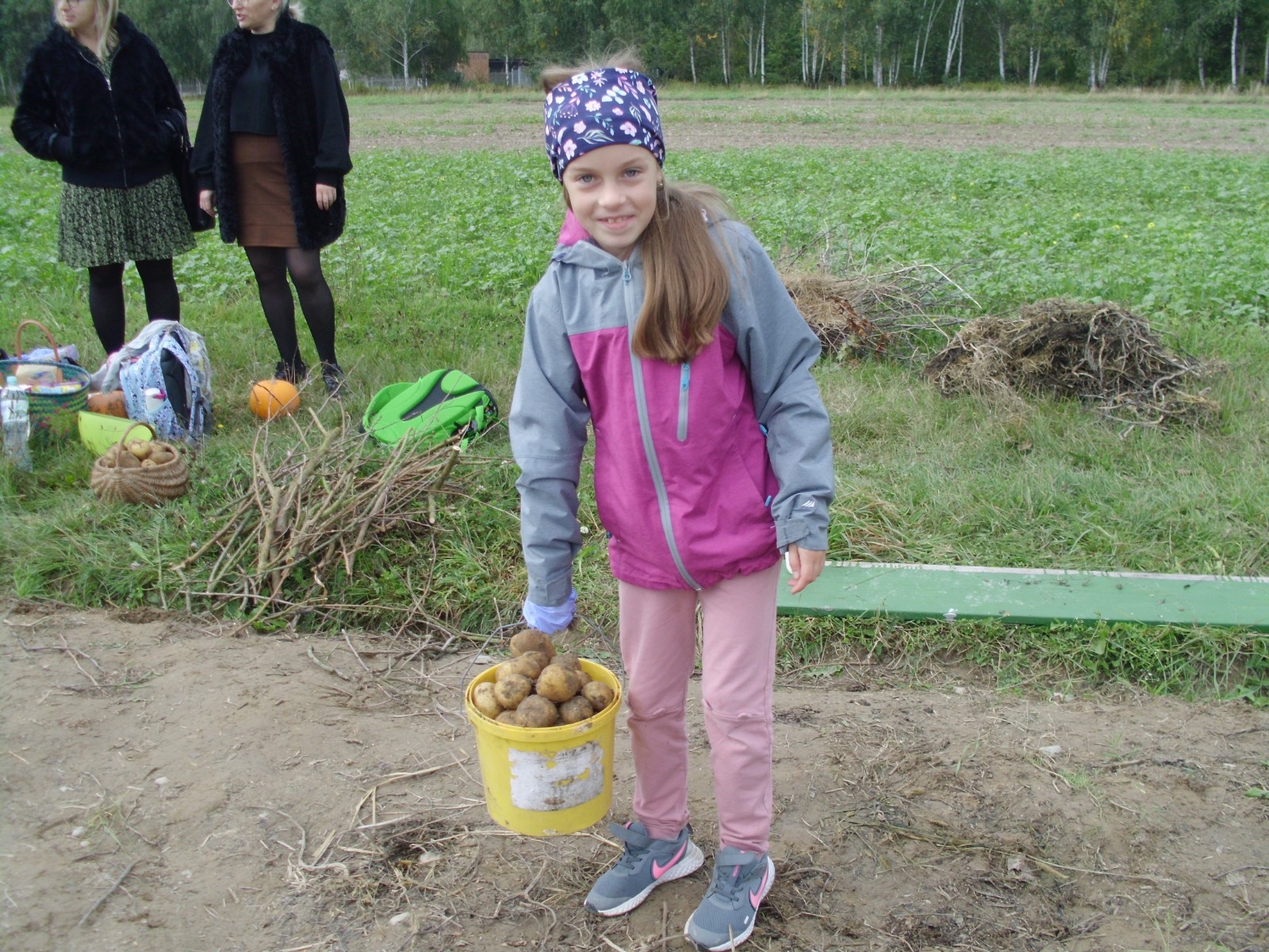 Wspólną zabawę rozpoczelismy od wykopków ziemniaka. Za pomocą motyki i pod okiem pani Możdżonek uczniowie wykopali ziemniaki.