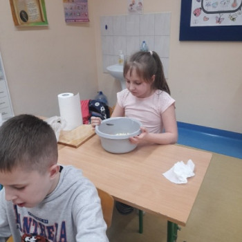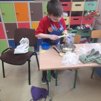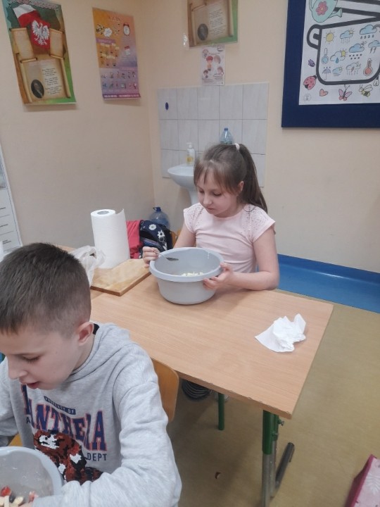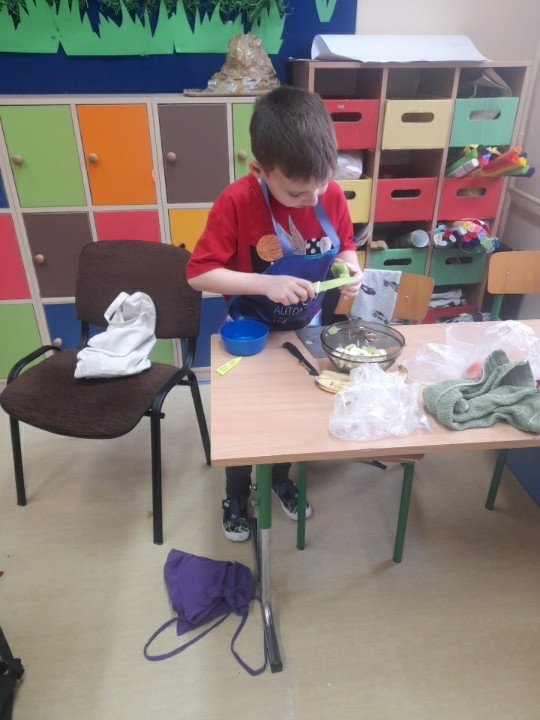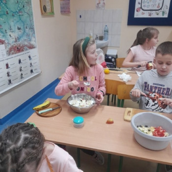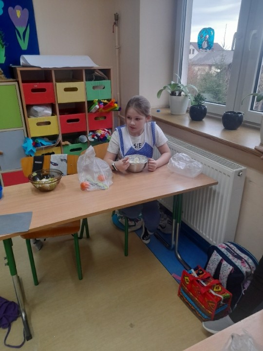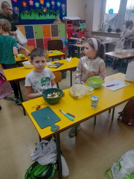 Uśmiechnięte i pełne skupienia buzie, pokazały, że zajecia kulinarne bardzo się podobały. Sałatki były pyszne, zapach rozniósł się po całej szkole.