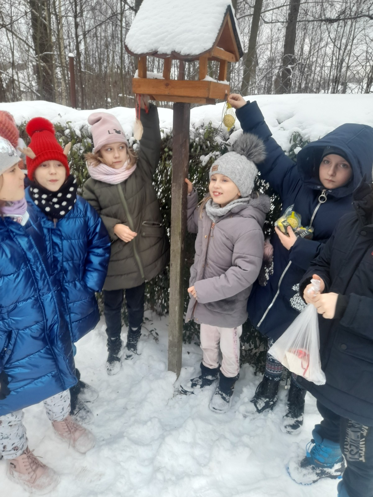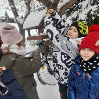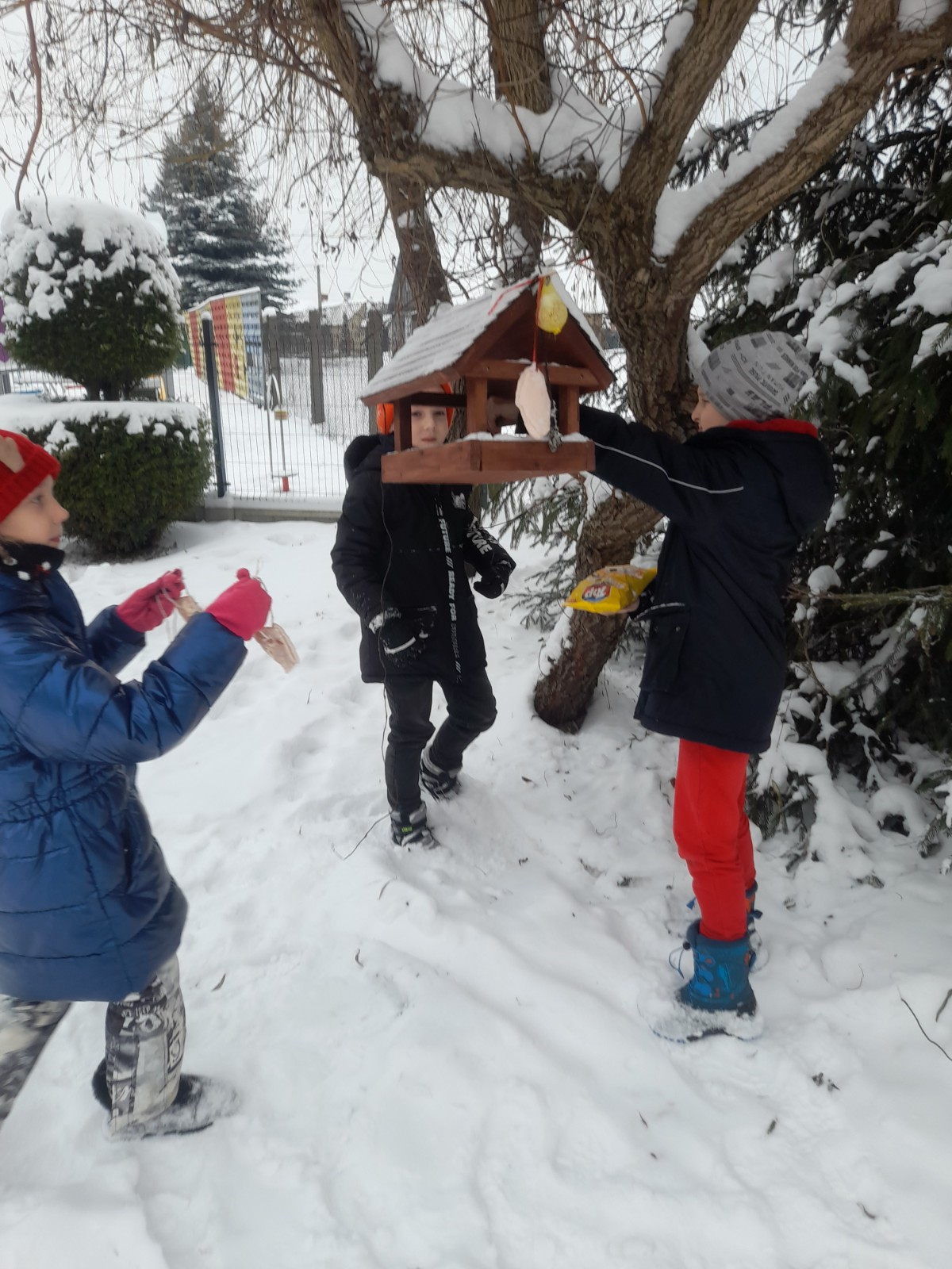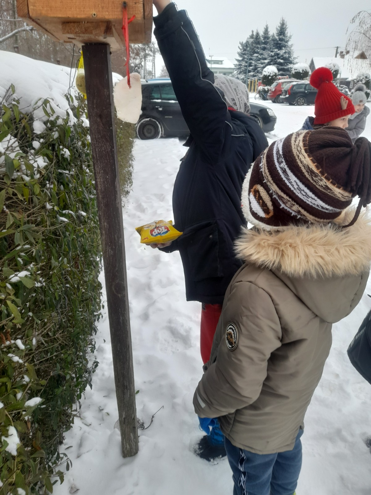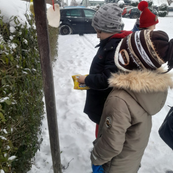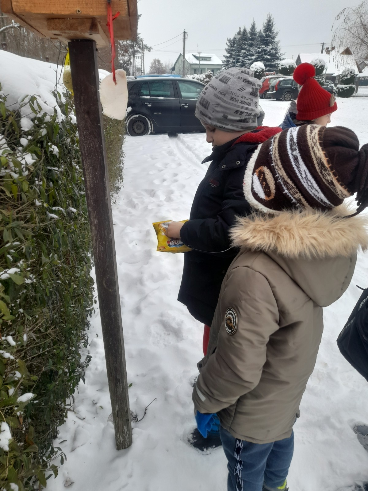 Wraz z pojawieniem się ujemnych temperatur i sporej warstwy śniegu dzieci ze Szkolnego koła Ekologicznego rozpoczeły akcję dokarmiania ptaków.