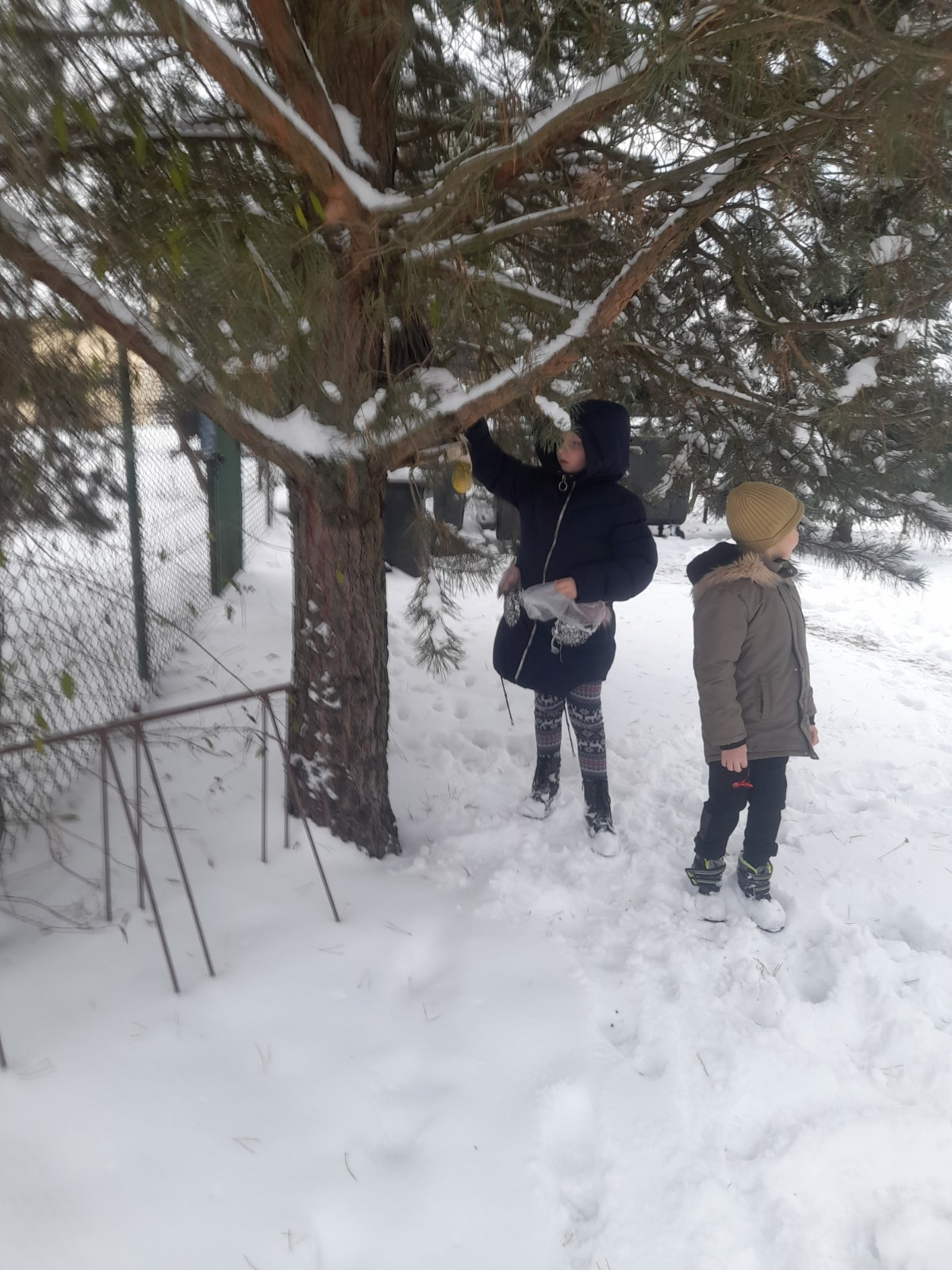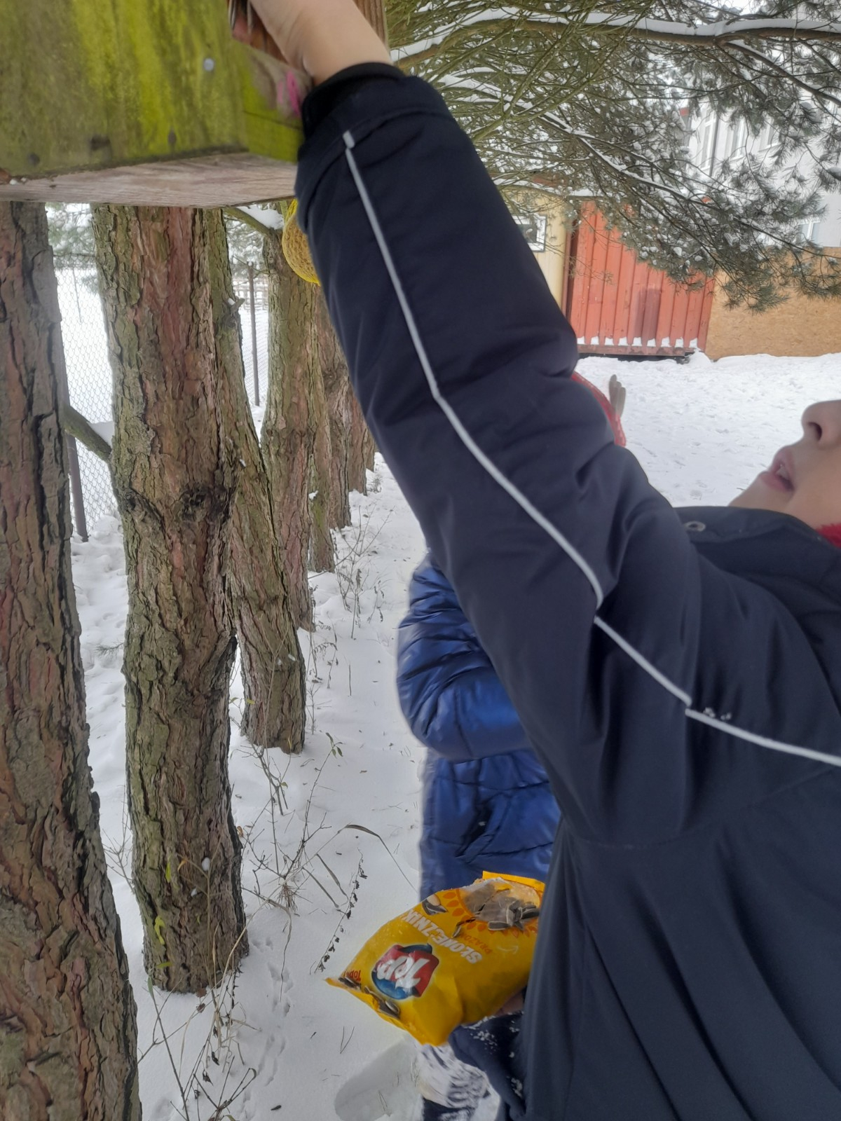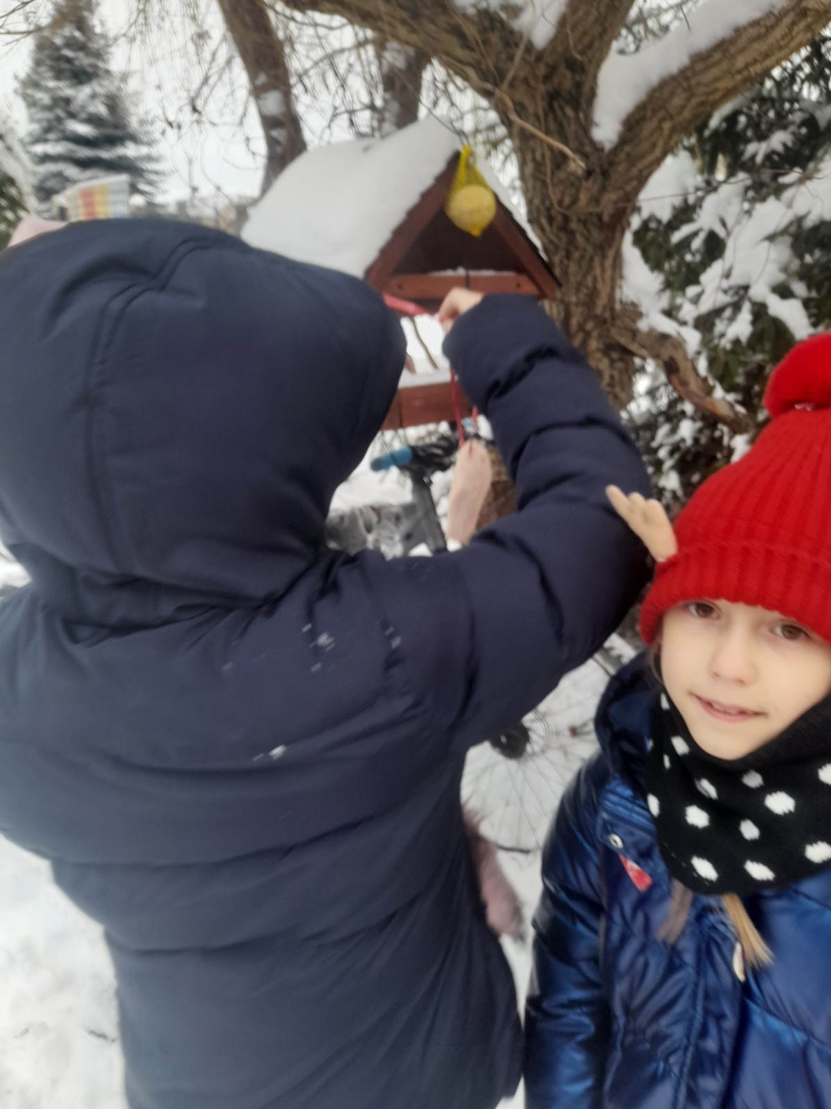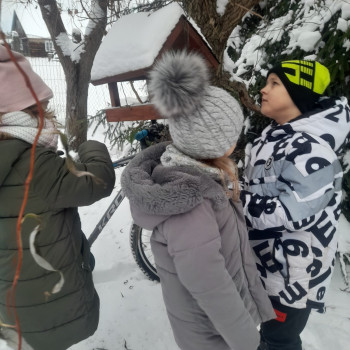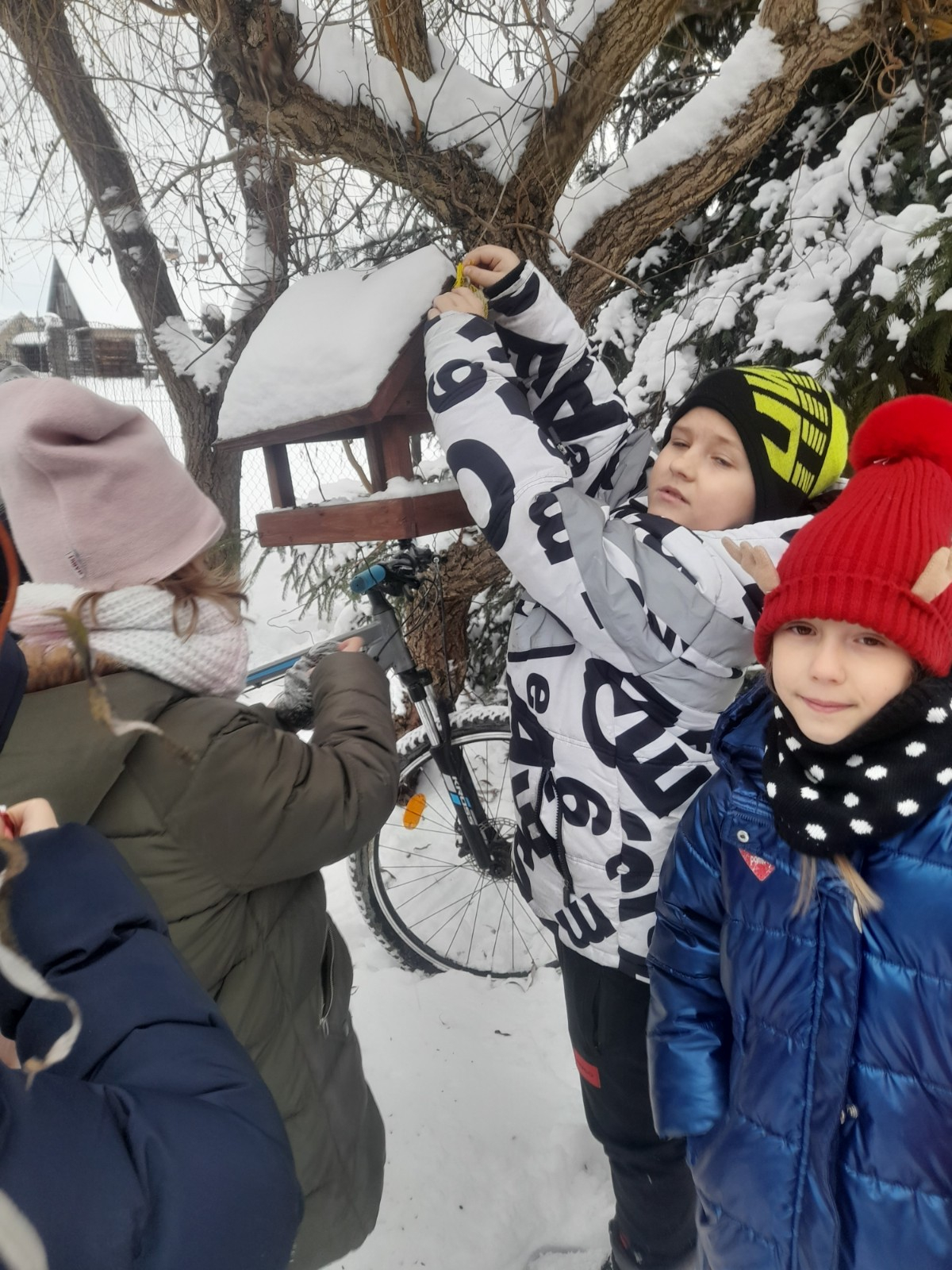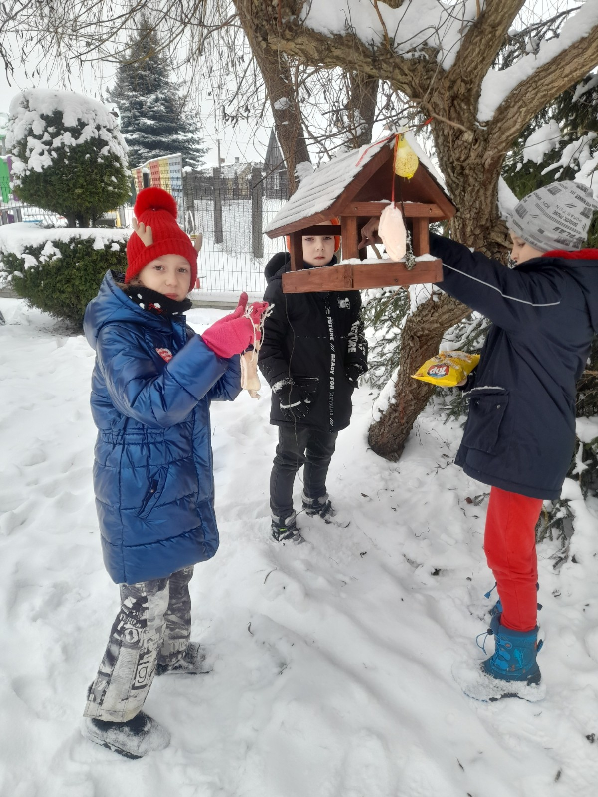 Wraz z pojawieniem się ujemnych temperatur i sporej warstwy śniegu dzieci ze Szkolnego koła Ekologicznego rozpoczeły akcję dokarmiania ptaków.