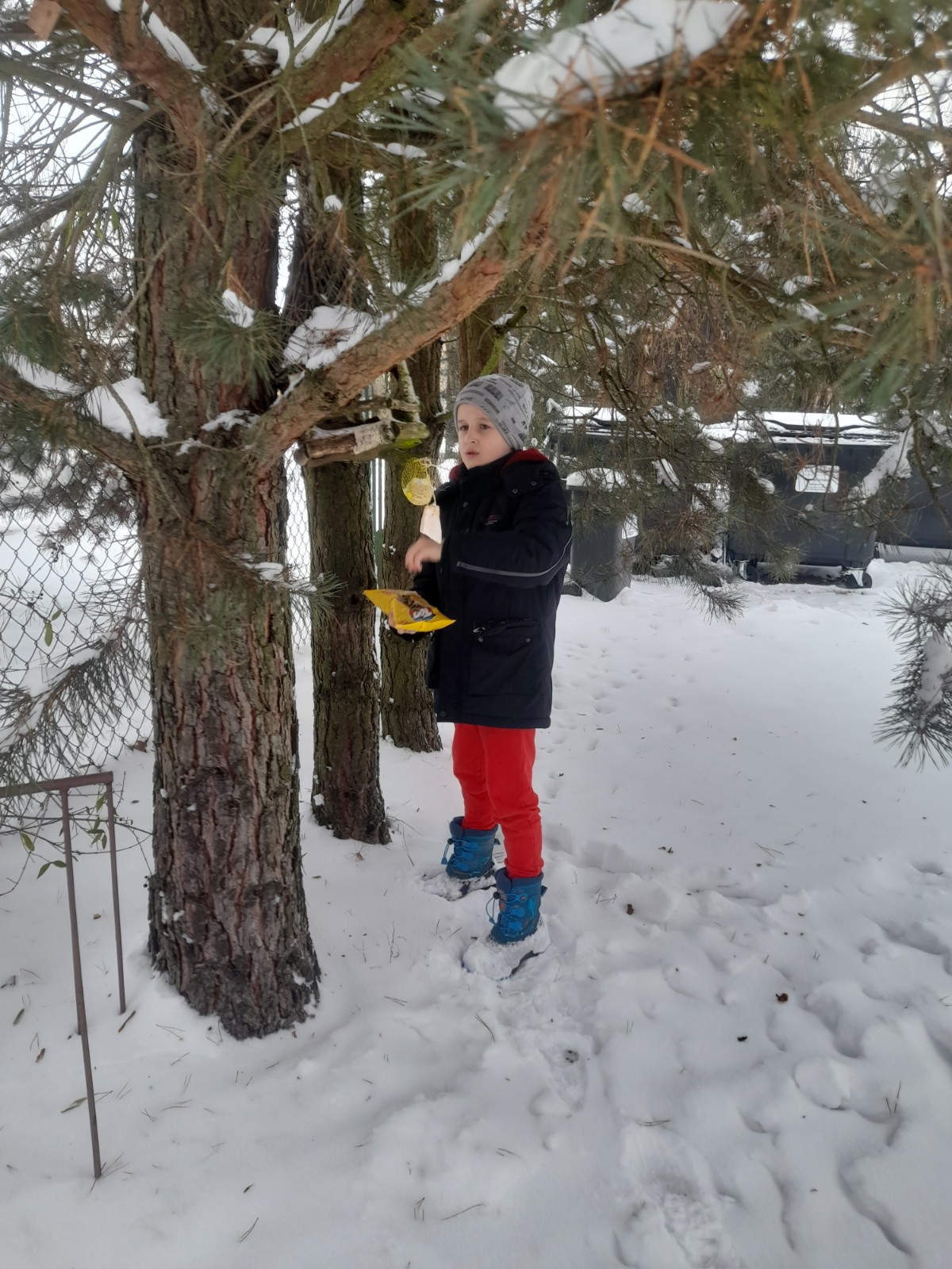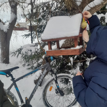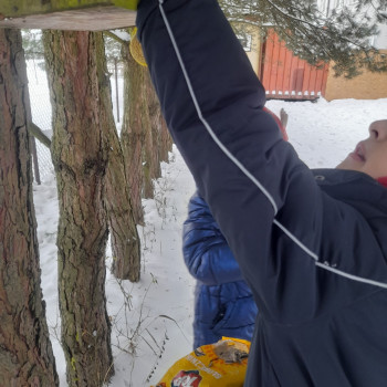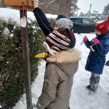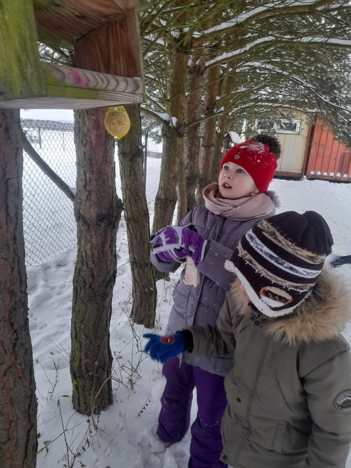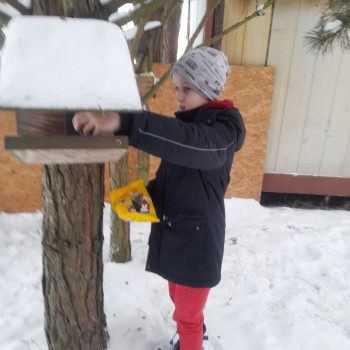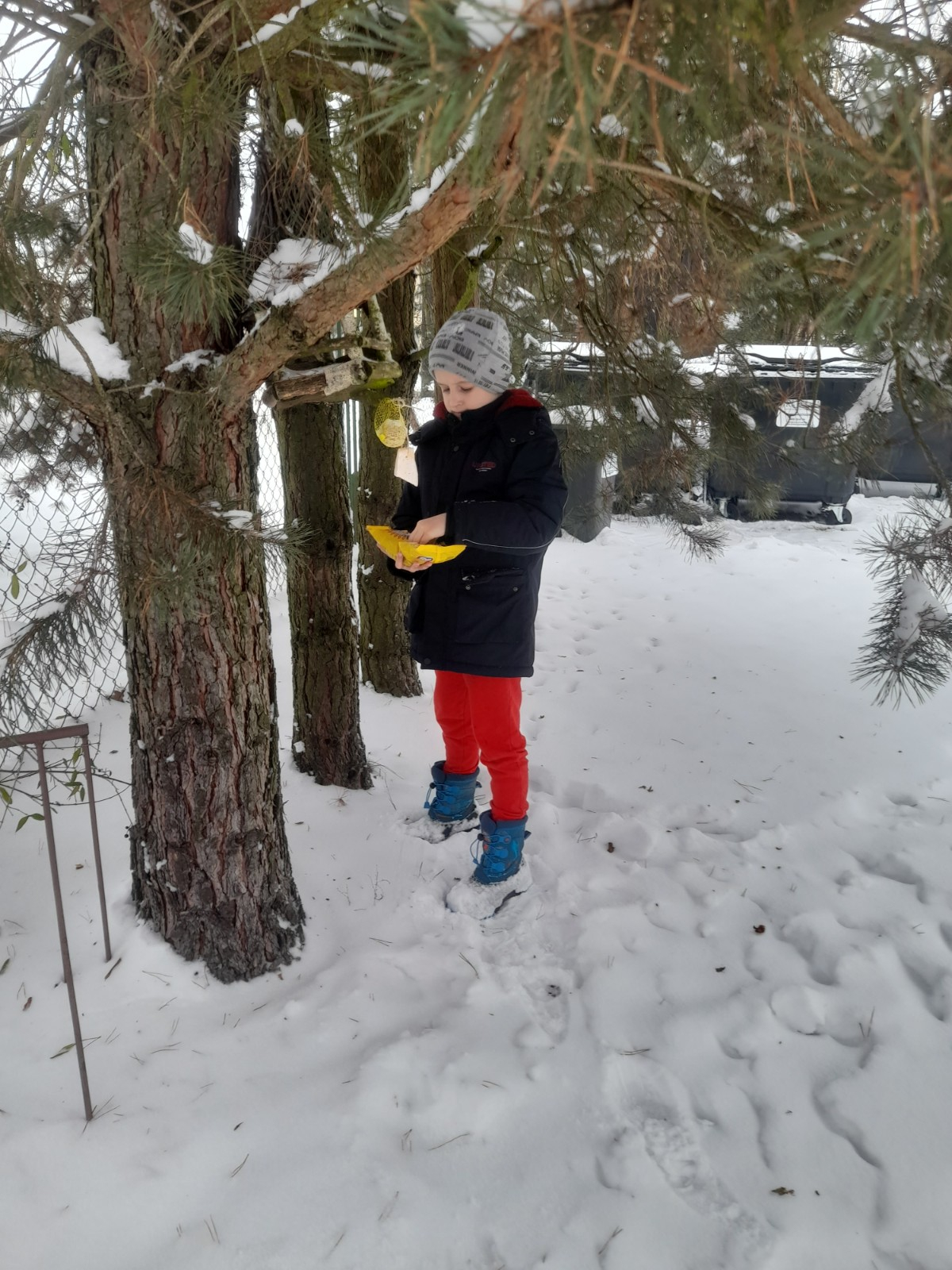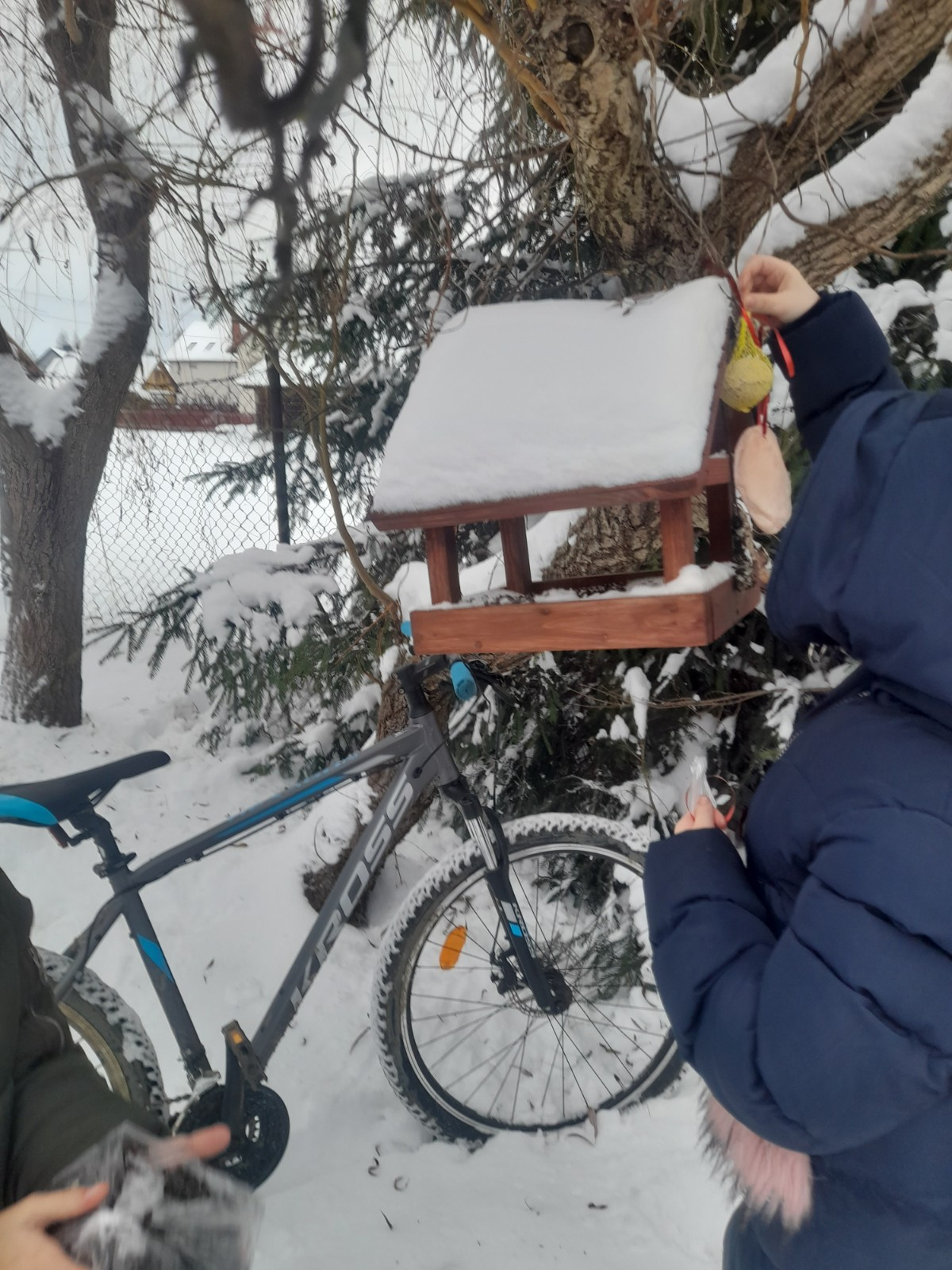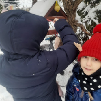 Wraz z pojawieniem się ujemnych temperatur i sporej warstwy śniegu dzieci ze Szkolnego koła Ekologicznego rozpoczeły akcję dokarmiania ptaków.