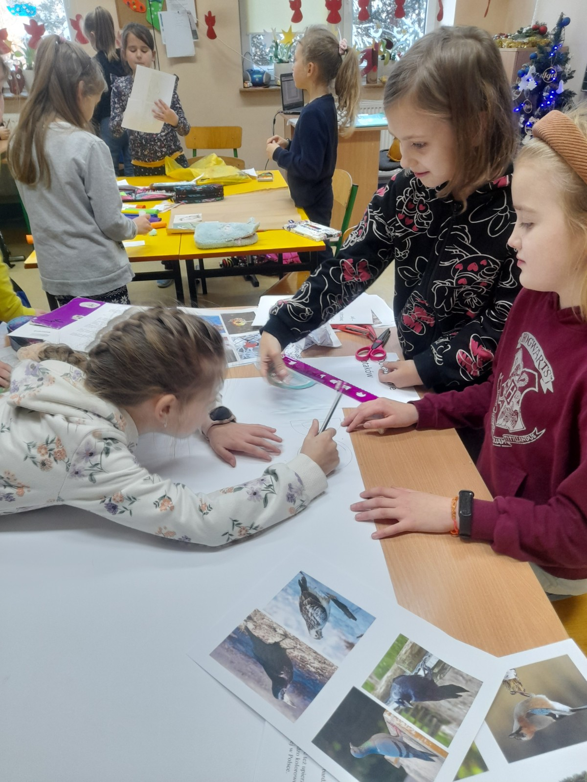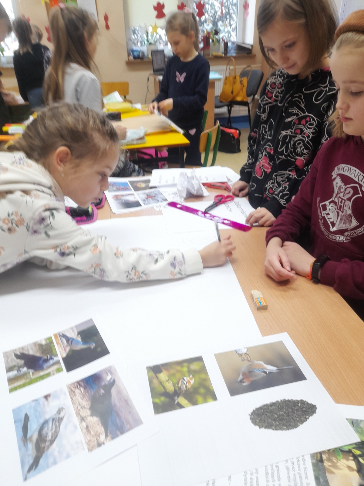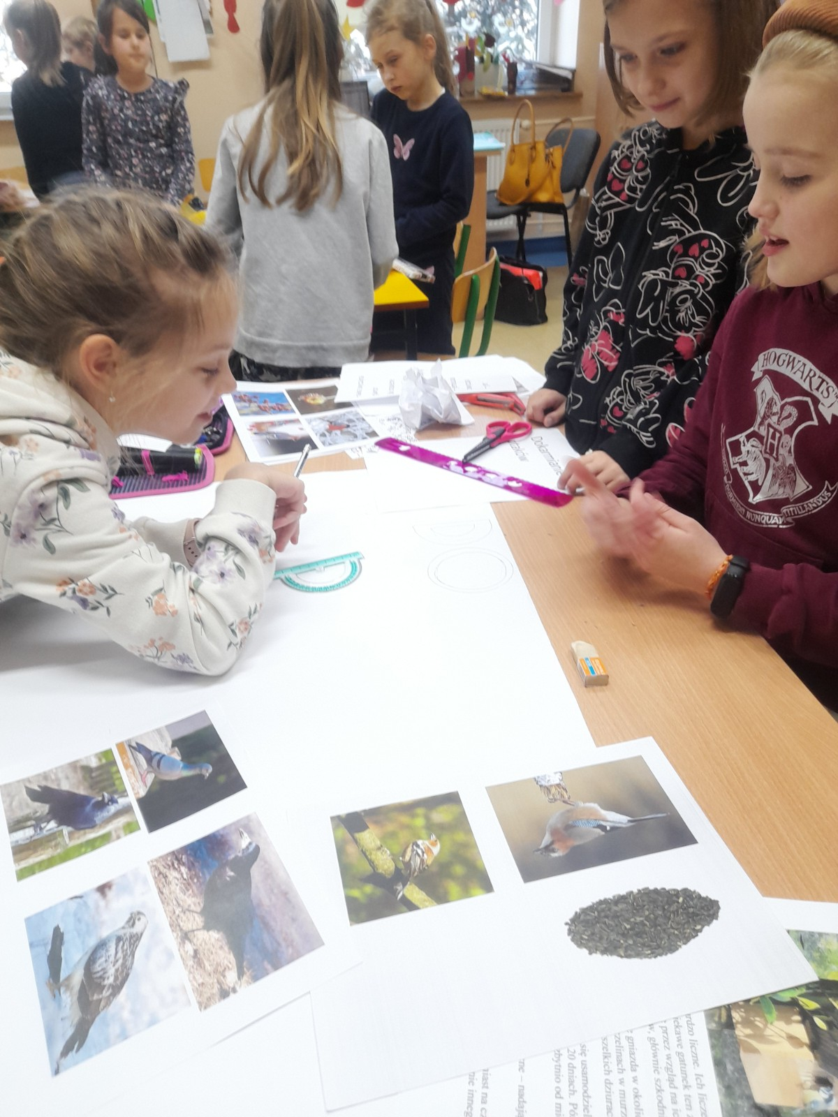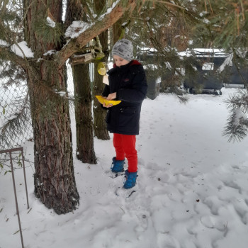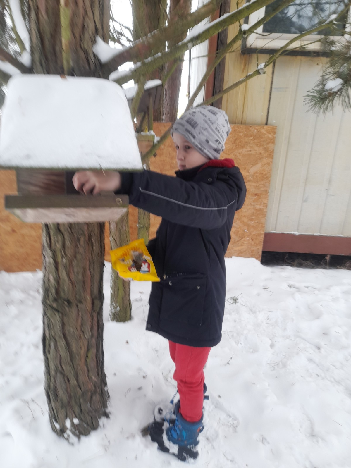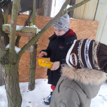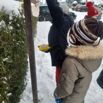 Wraz z pojawieniem się ujemnych temperatur i sporej warstwy śniegu dzieci ze Szkolnego koła Ekologicznego rozpoczeły akcję dokarmiania ptaków.