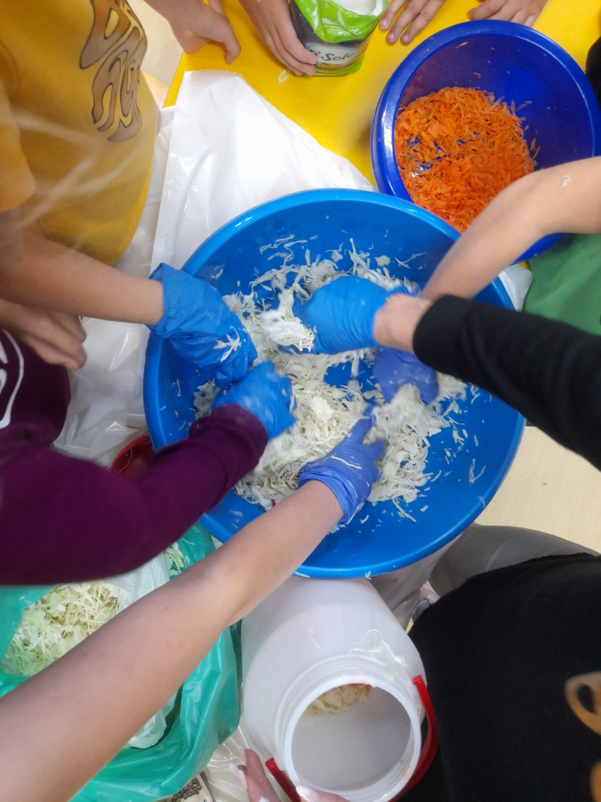 Poszatkowaną kapustę wrzuciły do przygotowanego słoika i każdą warstwę posypały solą. Należy wspomnieć, że nie zapomniały o jej dokładnym ugnieceniu. Dzieci wytrwale pracowały pod czujnym okiem Pani Joasi i Danusi. Za około 2 tygodnie sprawdzimy jak smakuje nasza kiszona kapusta pełna cennych dla zdrowia witamin. A nastepnie dzieci przygotują zdrową surówkę.