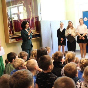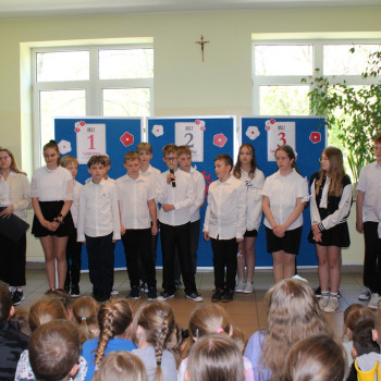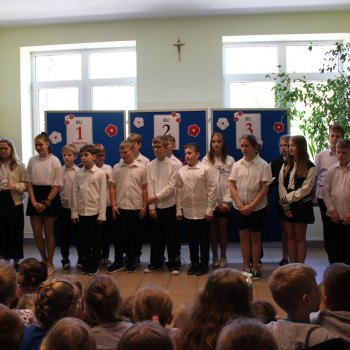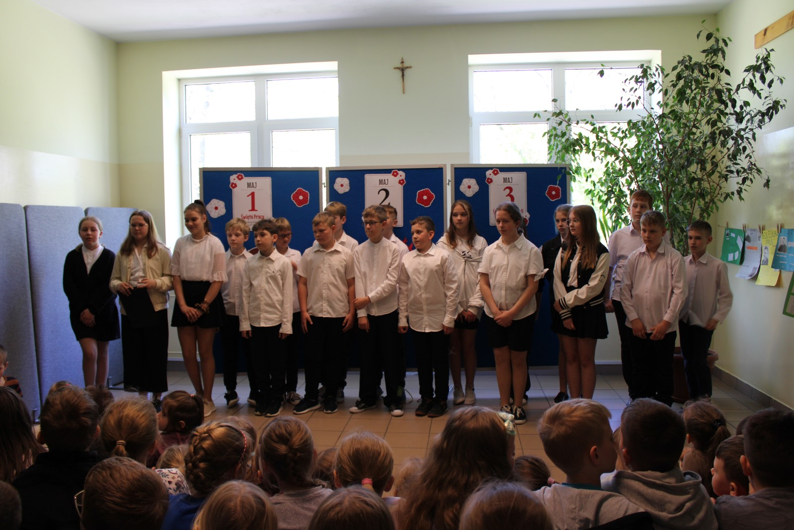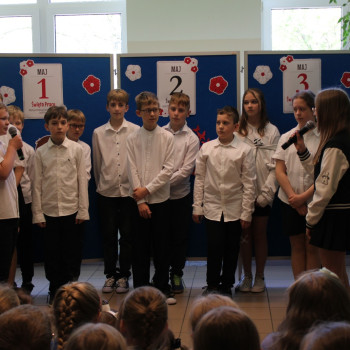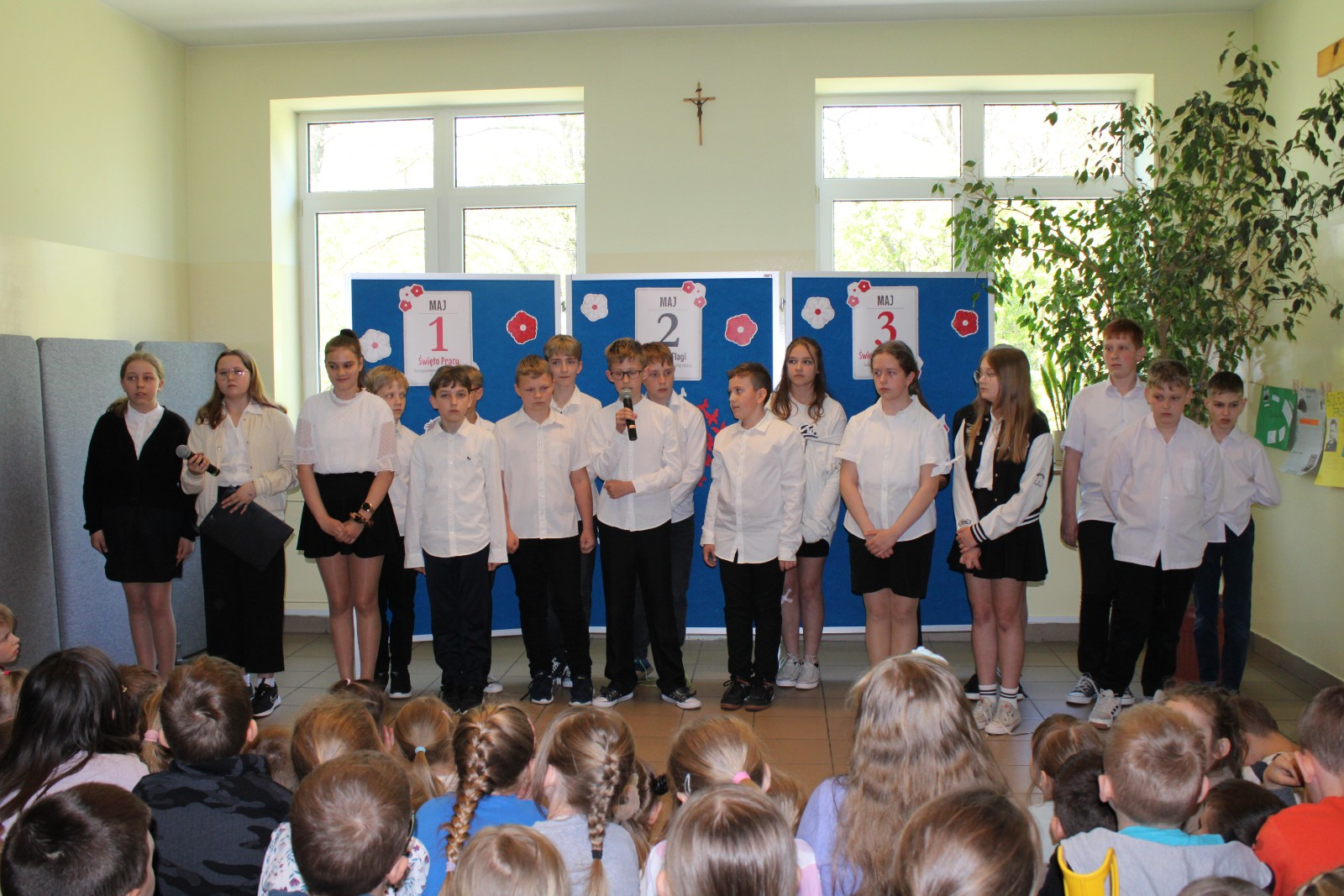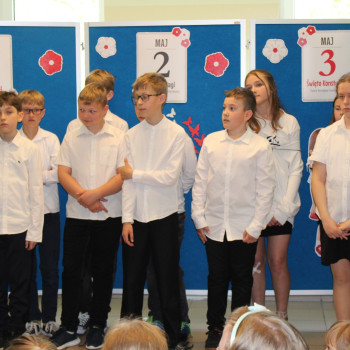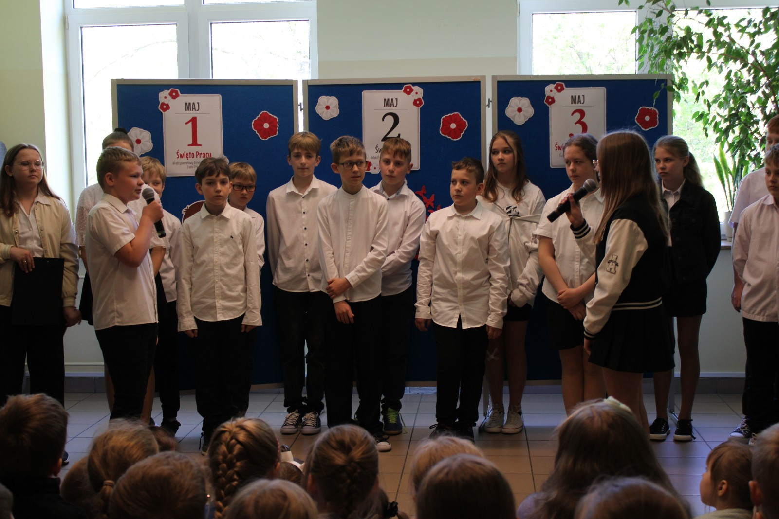 Z okazji świąt majowych odbyła się uroczysta akademia przygotowana przez klasę V pod opieką wychowawcy pani Marioli Gałązka oraz pani Agnieszki Sowińskiej.